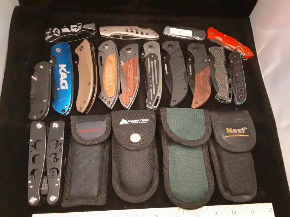 Knives and tools are in various condition. Blades, tools and scales show signs of use such as scratches, dings, dents, loss of color, chipping and marring. Most if not all are in working condition. No guarantee of quality or condition. Please see all pictures and use zoom function to see all Items. Items May Need To Be Cleaned Further. Blades May Need To Be Sharpened.