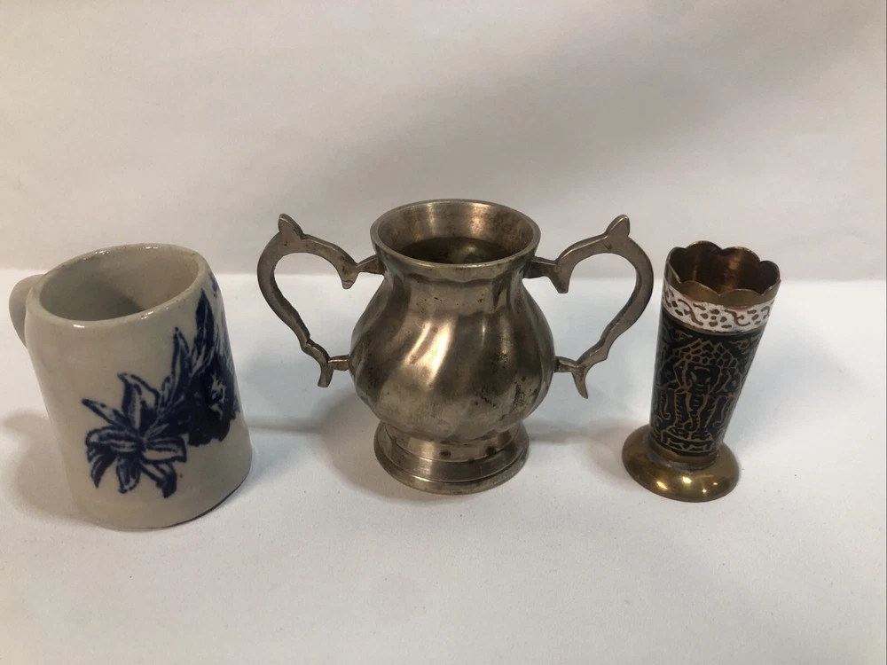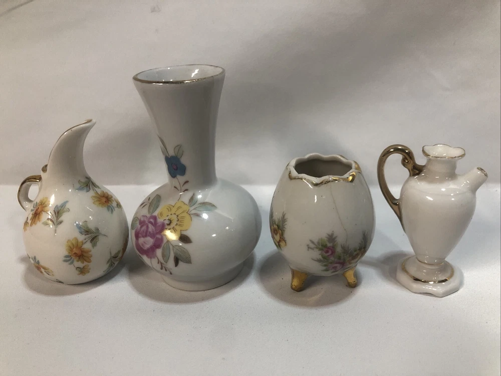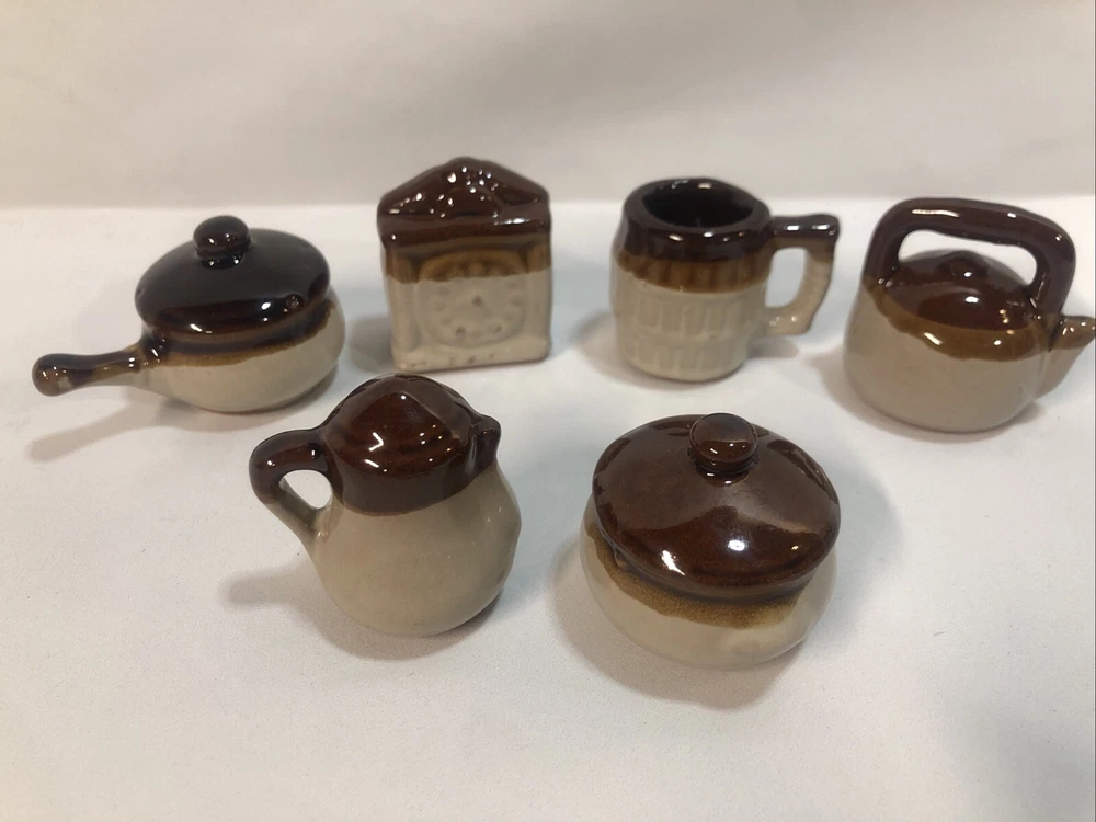 This lot of antique decorative dollhouse items includes miniatures of collectible kitchen decor. The items are from France and have an antique style, making them suitable for showcasing in a dollhouse or as decorative pieces. The set features a variety of miniature items such as vases, reflecting a high level of craftsmanship and attention to detail. These miniatures would make a charming addition to any dollhouse or collection of antique items.