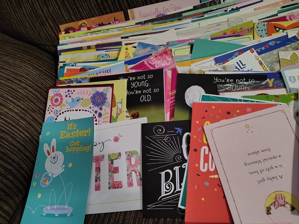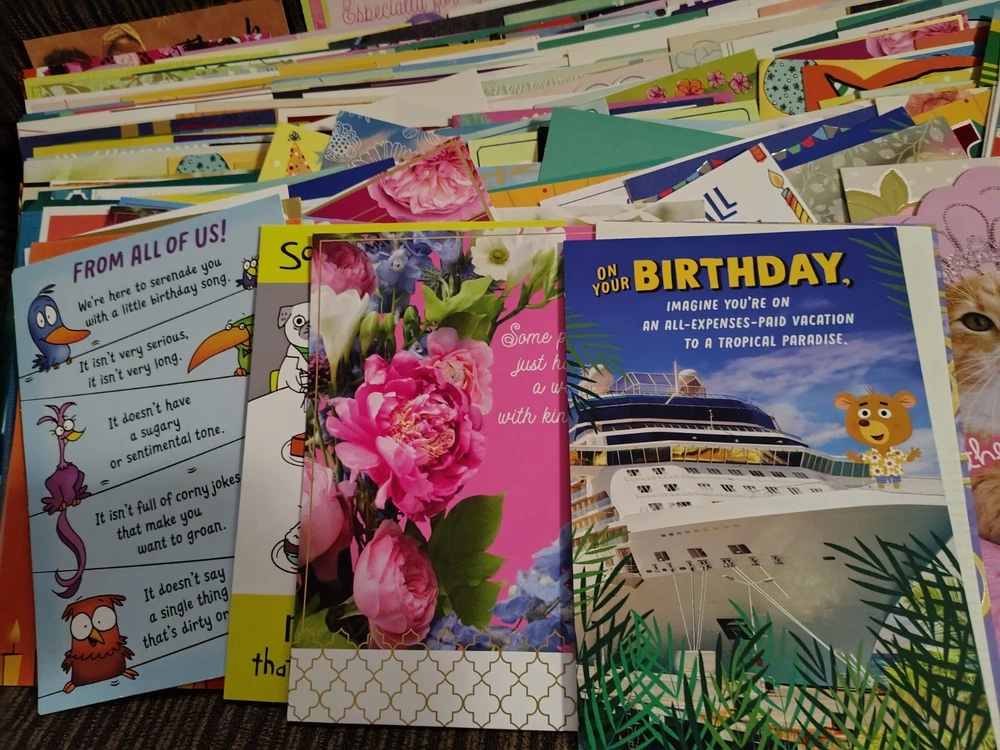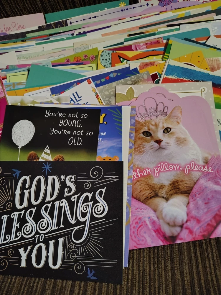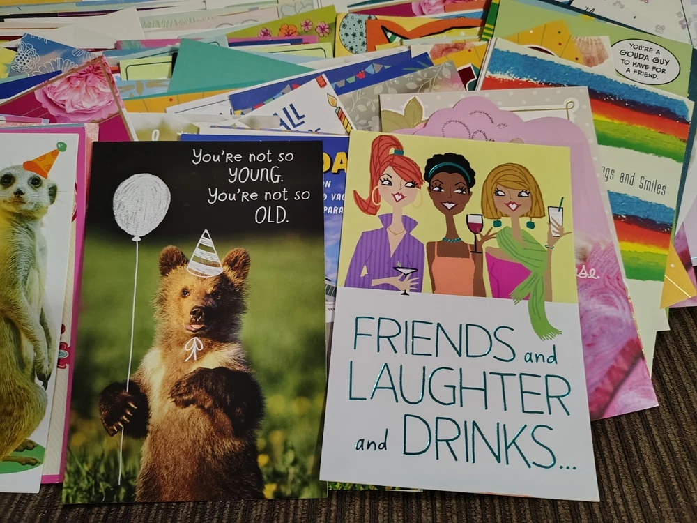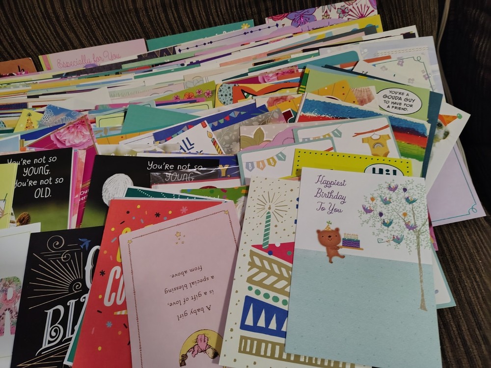 This lot of over 200 mixed greeting cards with matching envelopes features a variety of funny animal-themed cards perfect for all occasions. The colorful, artist-designed cards are made of cardstock and come with embellishments, making them a delightful addition to any greeting. Each card is folded and includes an envelope for easy mailing, making them a versatile choice for women looking to send thoughtful messages with a touch of cupcakes and angels.