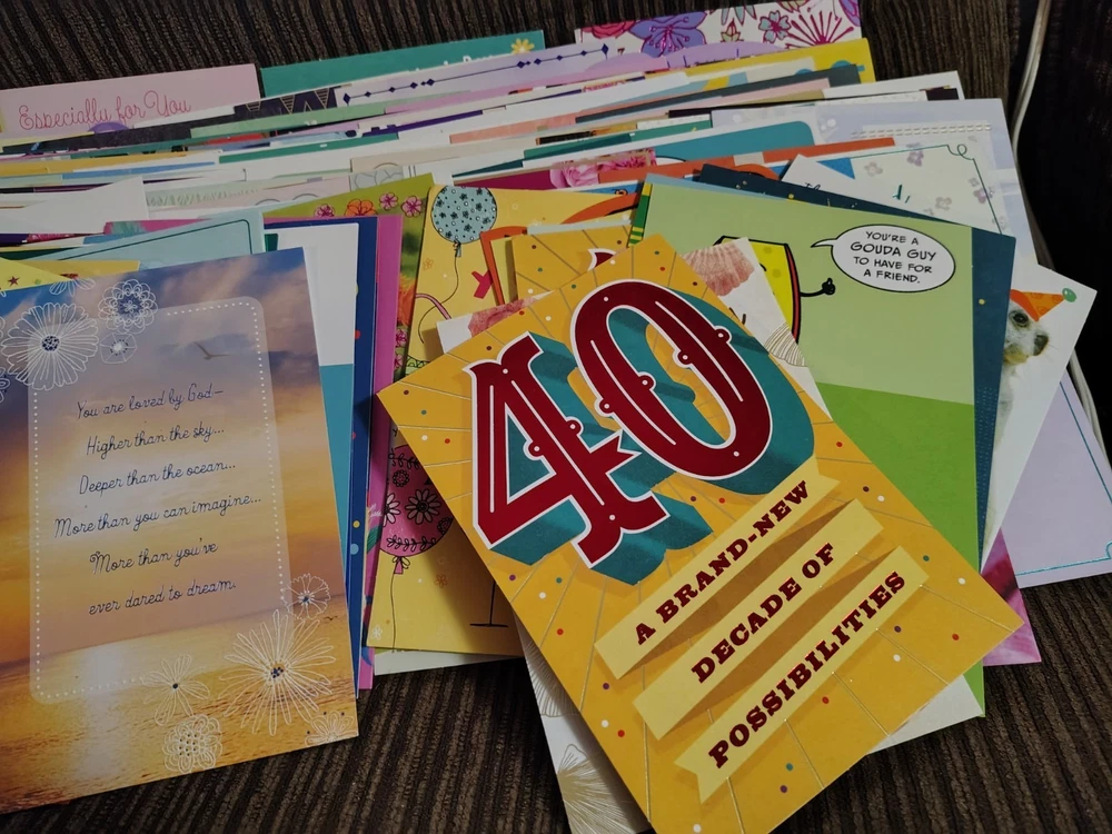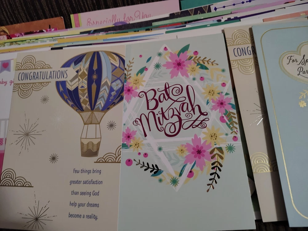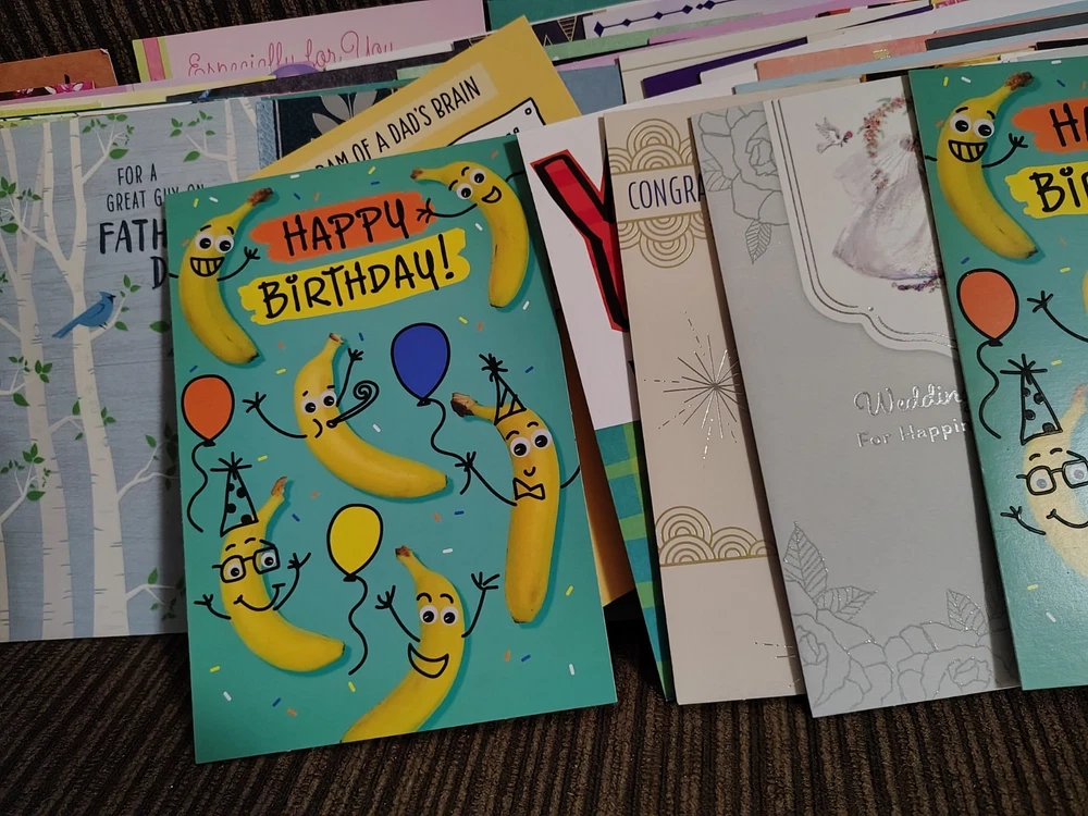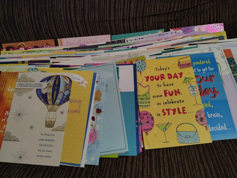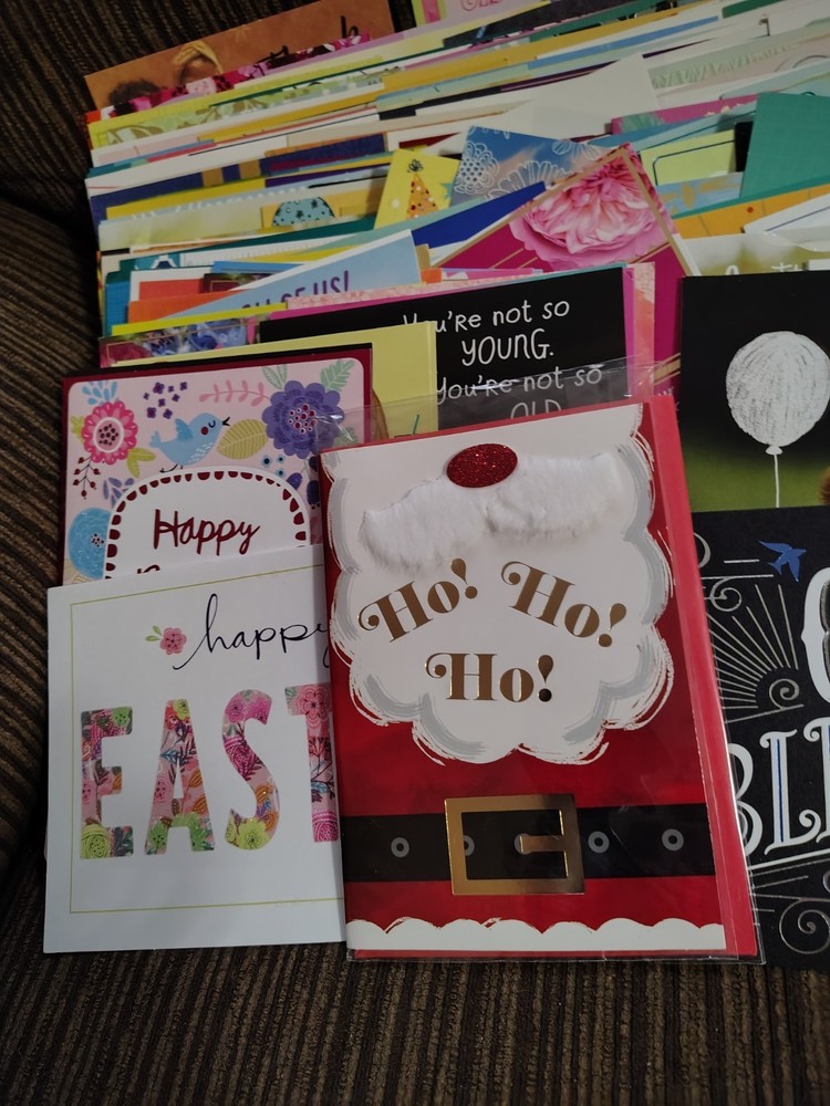 This lot of over 200 mixed greeting cards with matching envelopes features a variety of funny animal-themed cards perfect for all occasions. The colorful, artist-designed cards are made of cardstock and come with embellishments, making them a delightful addition to any greeting. Each card is folded and includes an envelope for easy mailing, making them a versatile choice for women looking to send thoughtful messages with a touch of cupcakes and angels.