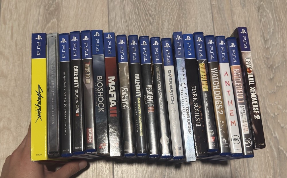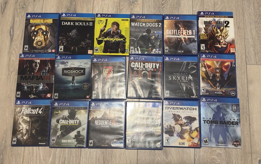 Selling my old set of PS4 games as I moved to PC and PS5. All games have been tested and work. Any codes within the cases are likely to be redeemed. Games included are: Cyberpunk 2077 Skyrim Special Edition + Steelbook Black ops 3 7 days to die Bioshock the collection Mafia 3 Fallout 4 Call of duty infinite Resident evil 7 biohazard Need for Speed Deluxe Overwatch Rise of the tomb raider 20 year edition Dark souls 3 day one edition Borderlands the handsome collection Watch dogs 2 Anthem Battlefield 1 Dragon ball xenoverse 2