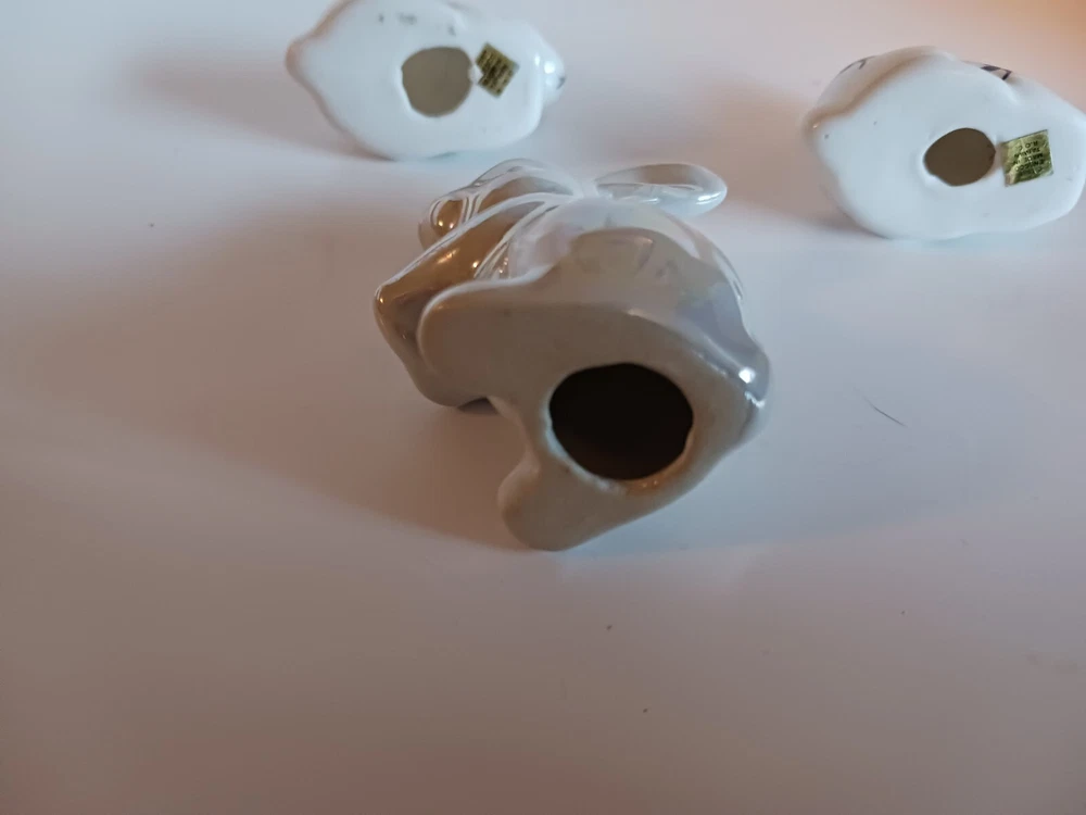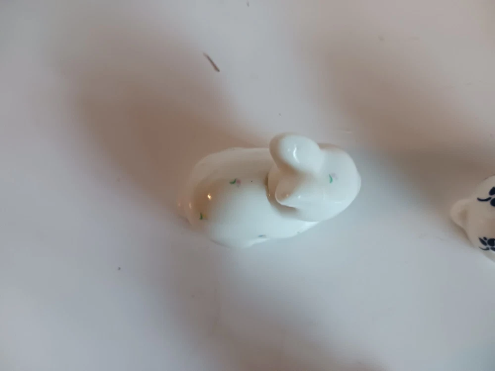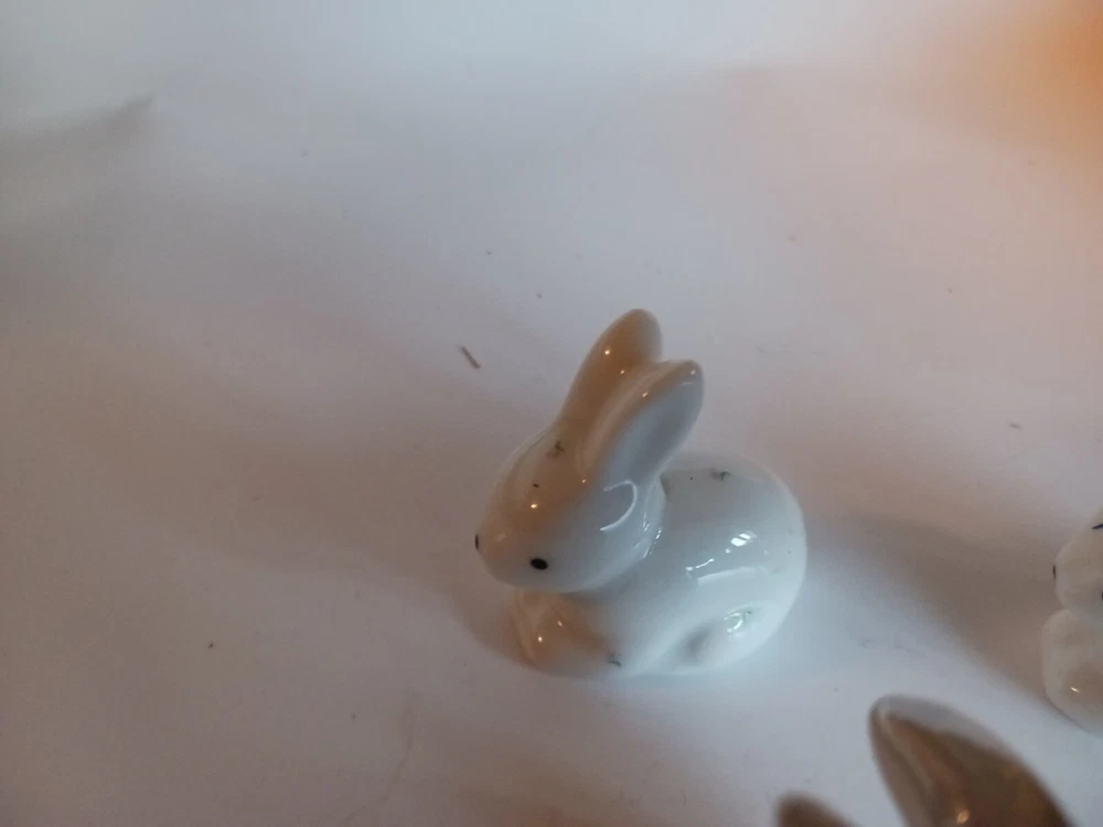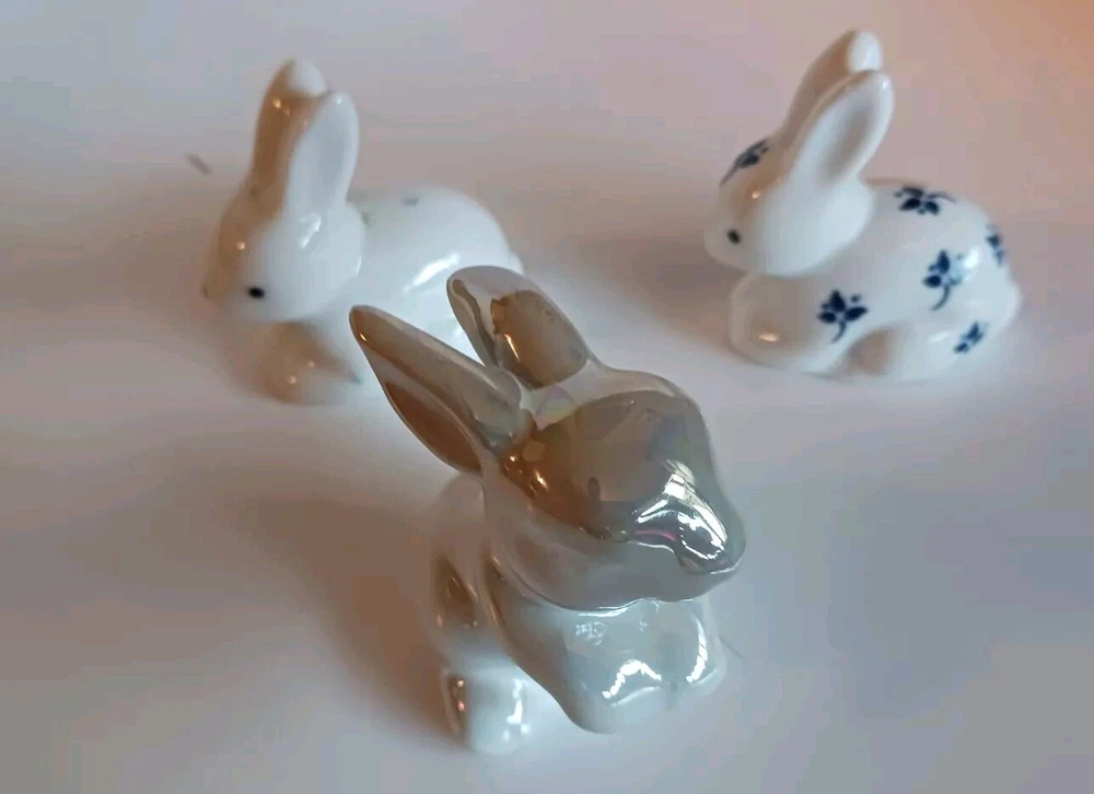 This lot consists of three small porcelain figurines of rabbits or bunnies. These collectibles are perfect for any fan of farm and countryside themes, and would make a great addition to any animal figurine collection. Crafted with care, these figurines are sure to please any lover of rabbits and add a touch of charm to any home decor. Range from 2 to 2.5 inches.