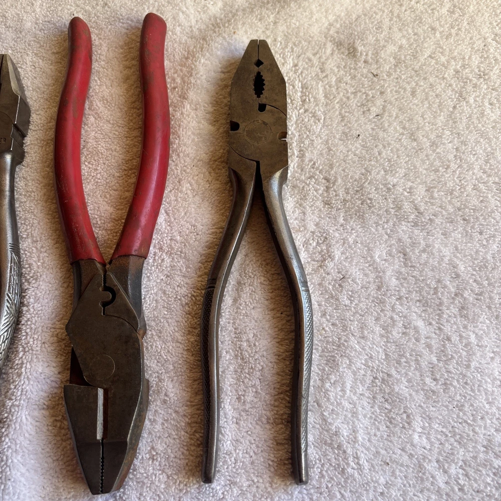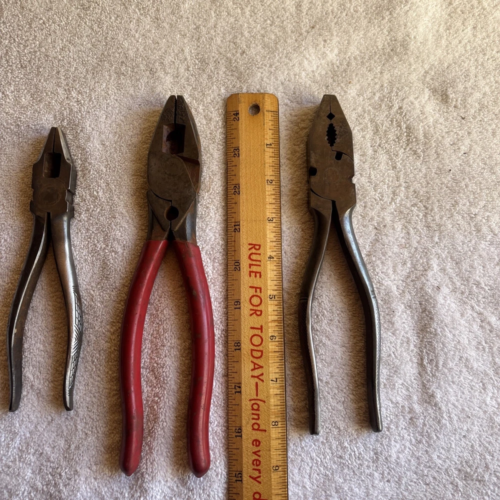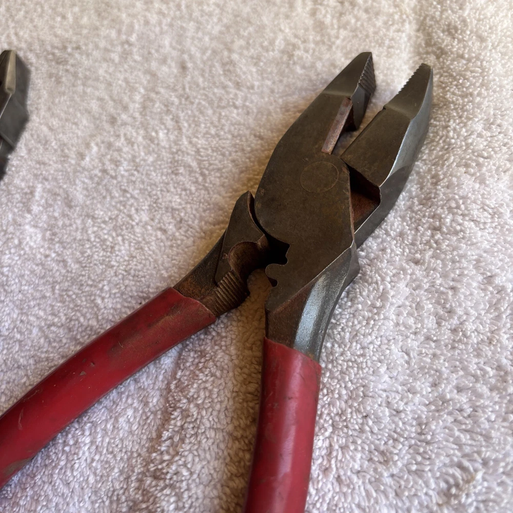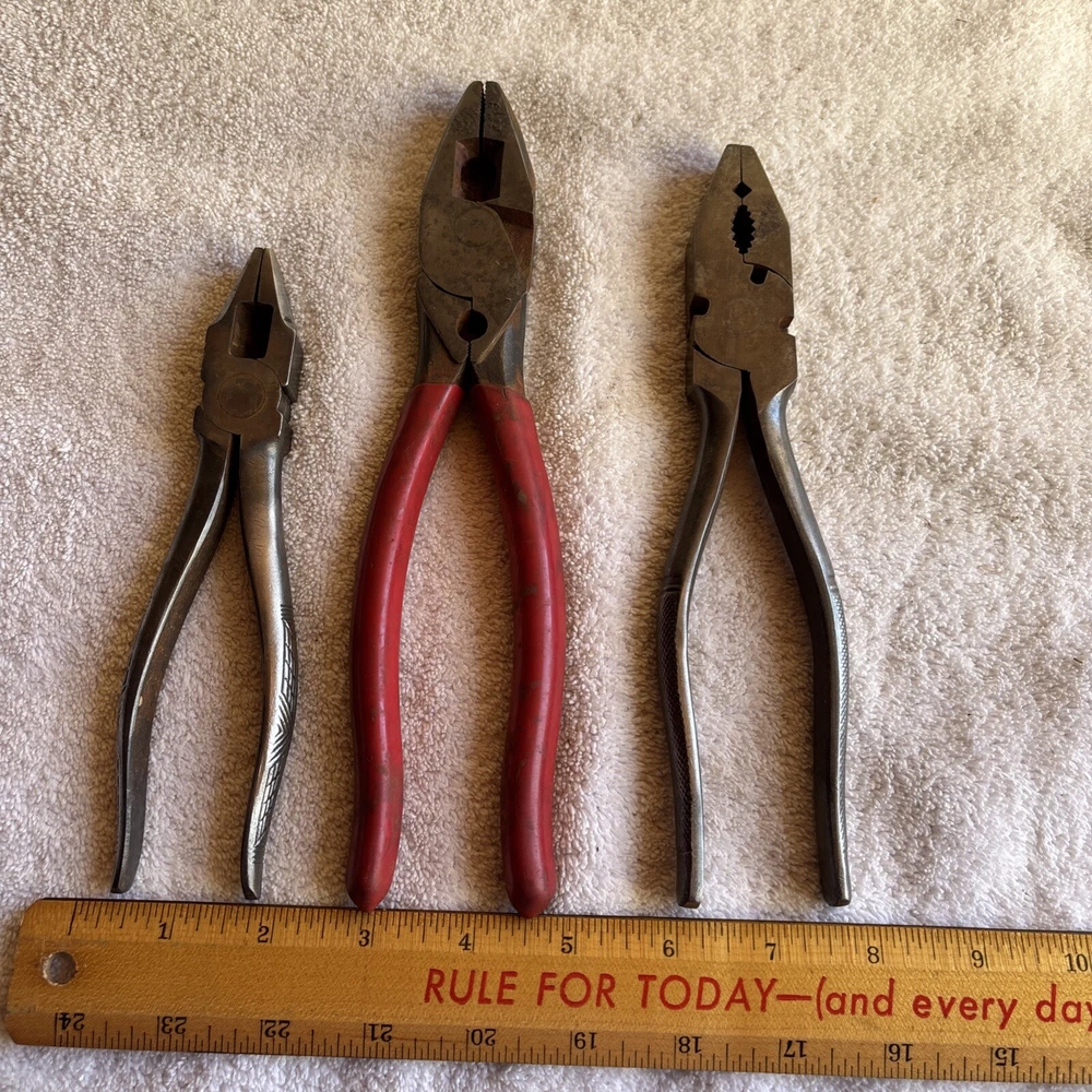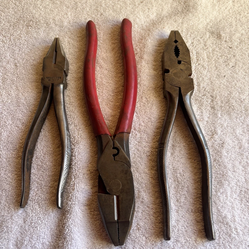 Selling is a vintage lot of three lineman pliers. These were found in a local estate and are used. The red handled one and the larger all steel one are unnamed unlabeled no manufacture name. The small all set set are kraeuter brand. The are high quality and operate fine. The jaws are crisp not showing lots of hard use. There is rust on all three they have been buffed. Let me know if you have any questions. I generally ship within two days of the completed sale. I generally ship USPS ground advantage.