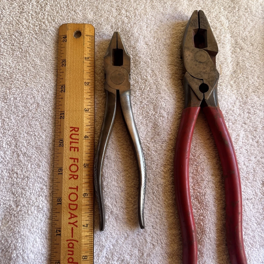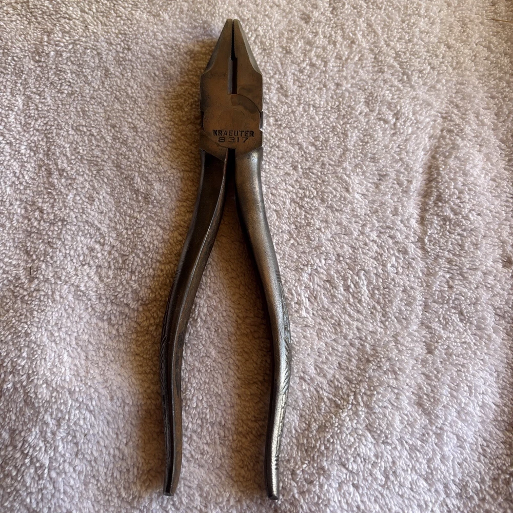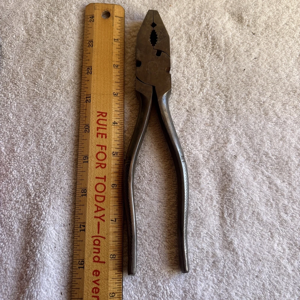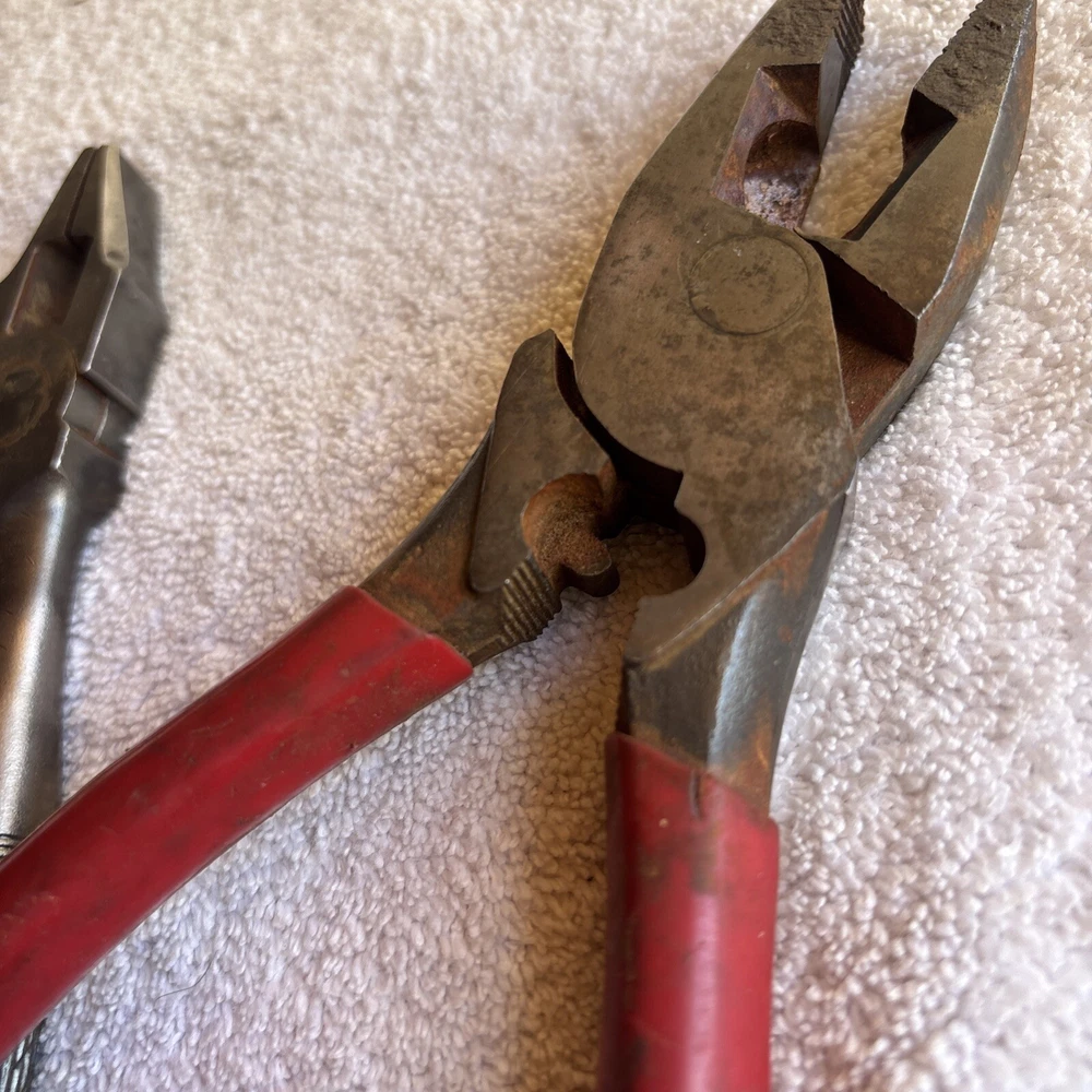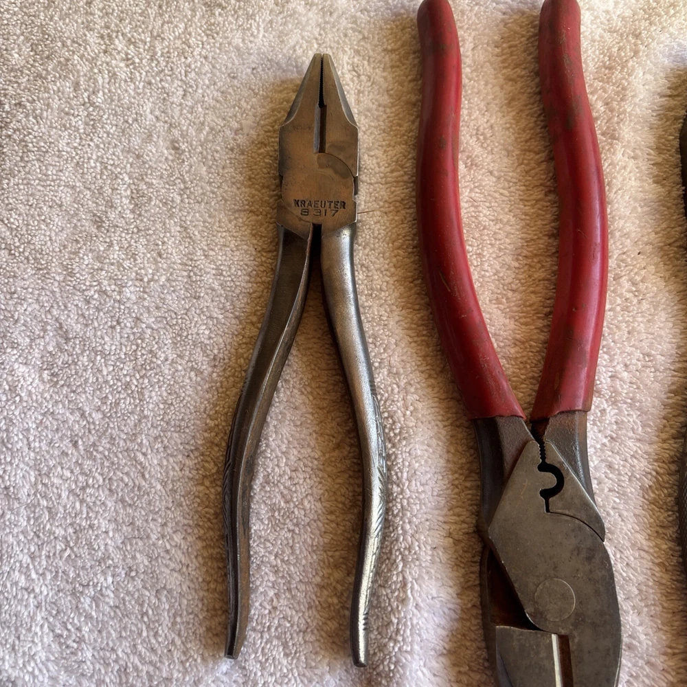 Selling is a vintage lot of three lineman pliers. These were found in a local estate and are used. The red handled one and the larger all steel one are unnamed unlabeled no manufacture name. The small all set set are kraeuter brand. The are high quality and operate fine. The jaws are crisp not showing lots of hard use. There is rust on all three they have been buffed. Let me know if you have any questions. I generally ship within two days of the completed sale. I generally ship USPS ground advantage.