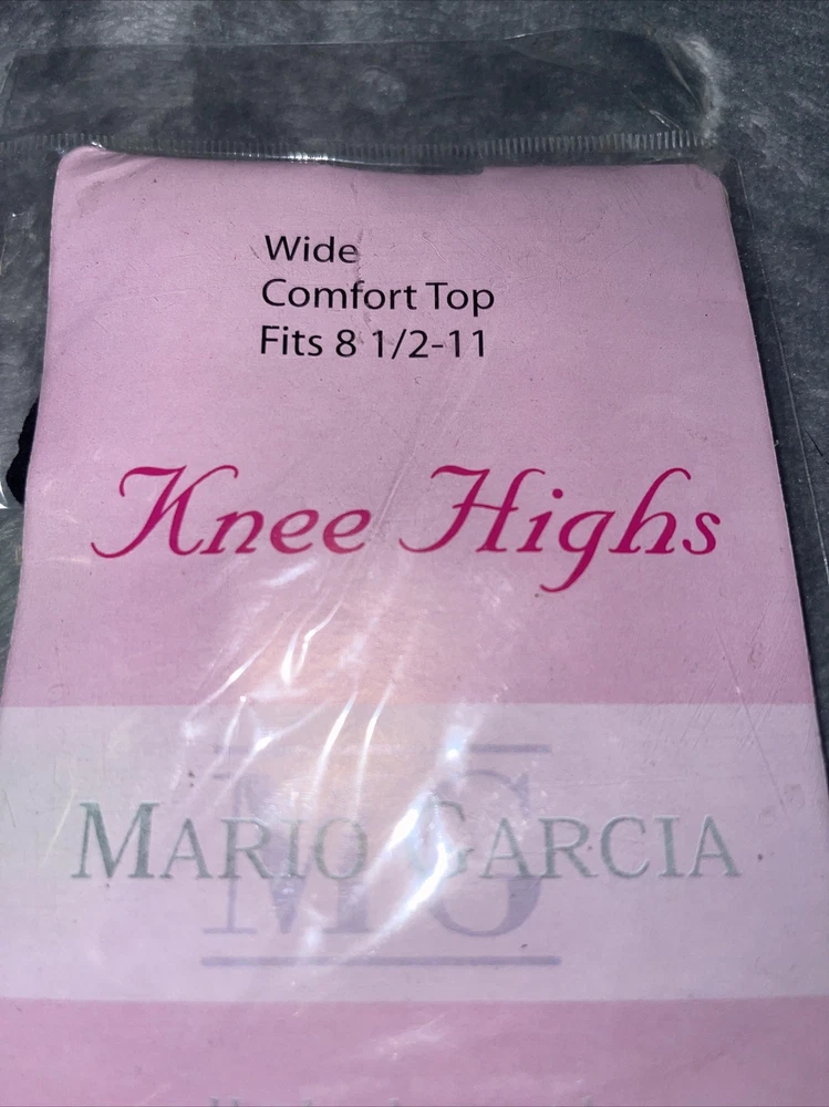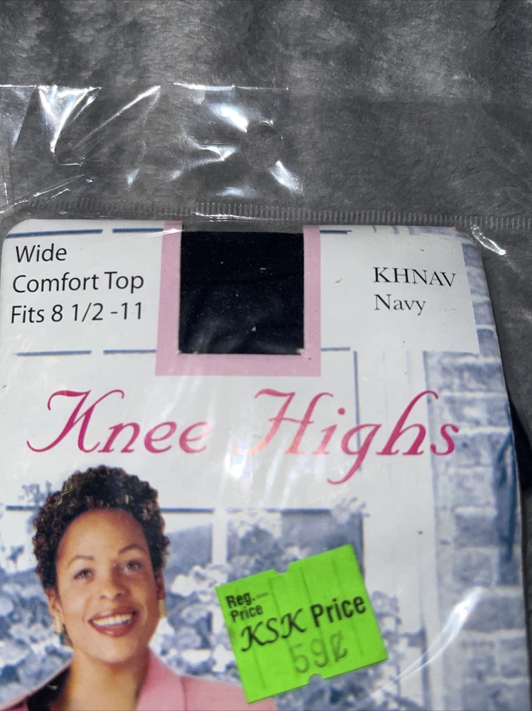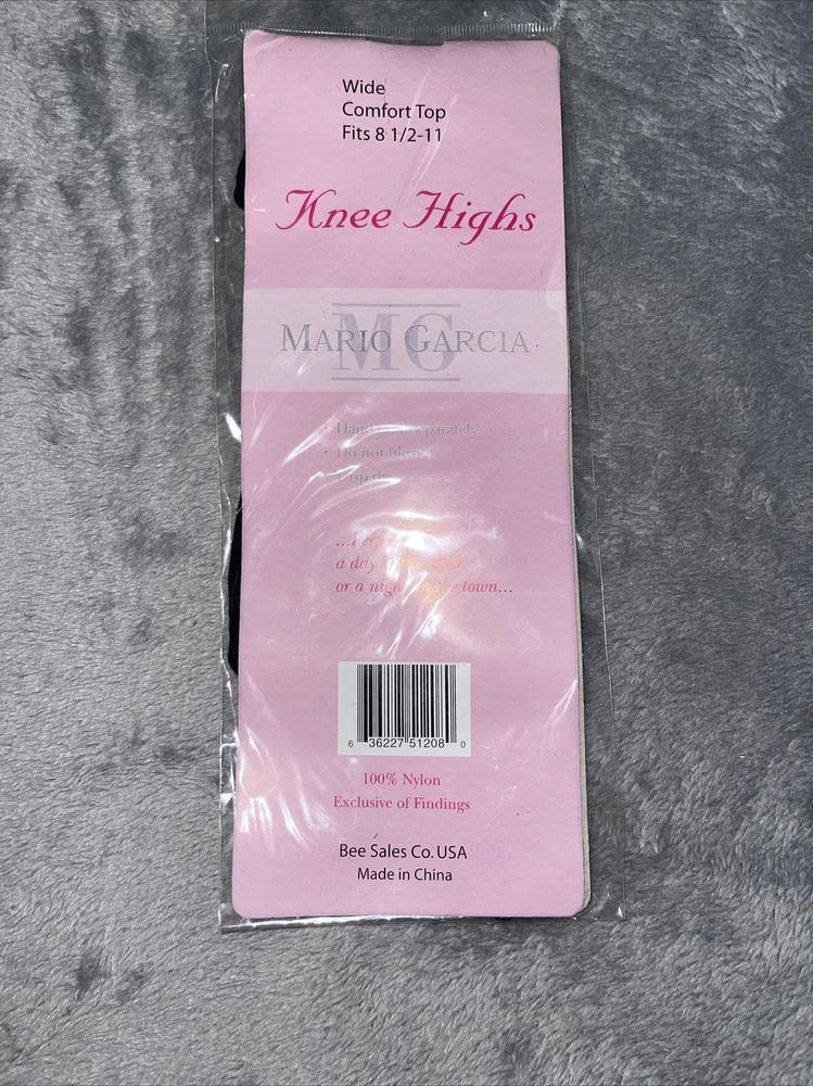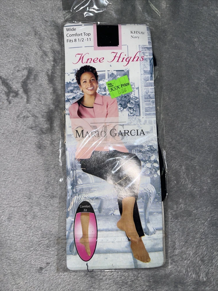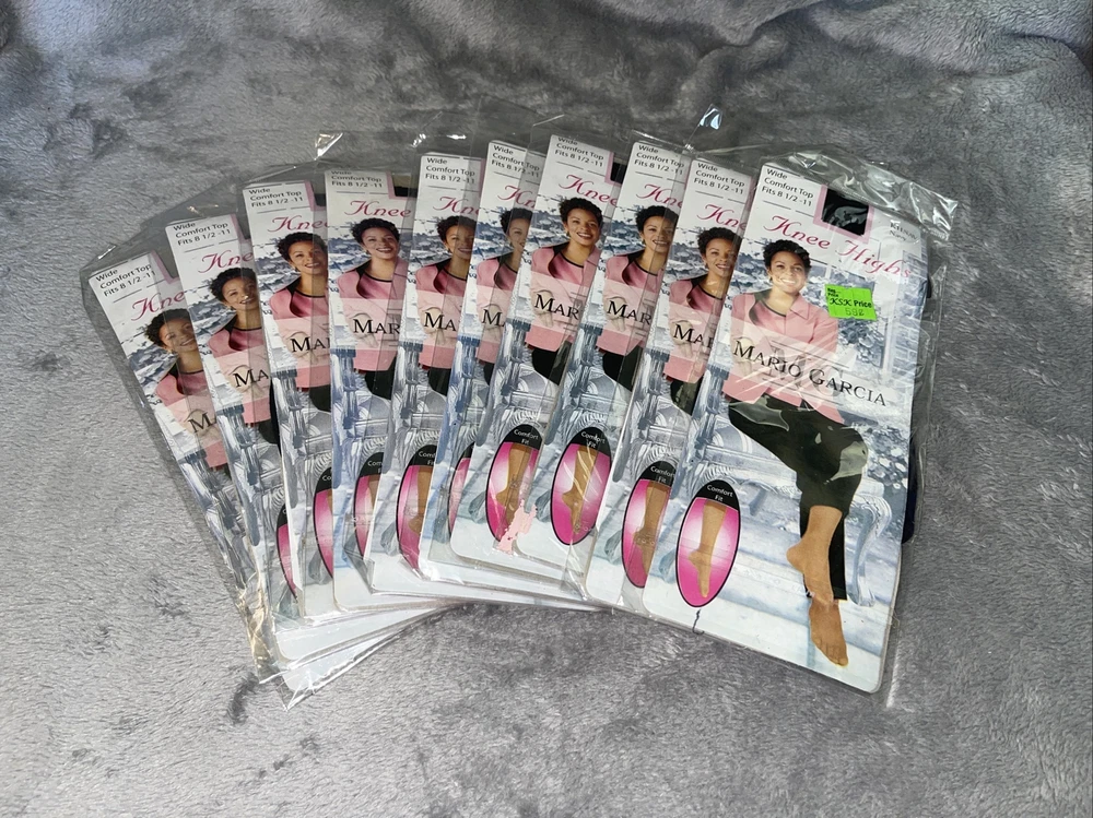Elevate your hosiery collection with this lot of 10 vintage packs of NOS Pantyhose Sheers Knee Highs in navy by Mario Garcia. These stockings are made of 100% nylon and feature a solid pattern with a wide comfort top for all-day wear. Perfect for everyday, casual, or business occasions, these knee-highs fit sizes 8.5-11. Hand wash only for garment care, their features include comfort top and they are apt for all seasons. These stockings are perfect for women who love occupational themes and are suitable for plus size women. The lot of 10 pairs come in individual packs and have not been used or opened since their production in China.