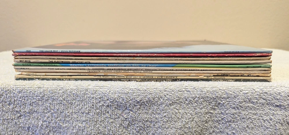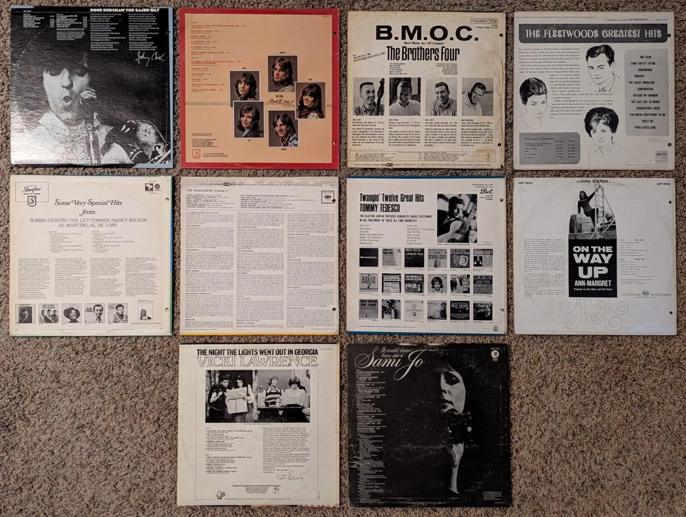 This listing is for the following 10 vinyl LP albums (12" records, 33 RPM): Doug Kershaw - The Cajun Way (1969, WS 1820) The Seekers - The Best of the New Seekers (1973, EQ-5051) The Brothers Four - B.M.O.C. - Best Music On/Off Campus (1961, CS 8378) The Fleetwoods - The Fleetwoods Greatest Hits (1963, BST-8018) Various Artists - Something Special (SL-6655) Various Artists - The Headliners Volume 3 (1962, GS 11) Tommy Tedesco - Twangin' Twelve Great Hits (1962, DLP 3449) Ann-Margret - On the Way Up (LSP 2453) Vicki Lawrence - The Night the Lights Went Out in Georgia (1973, BELL 1120) Sami Jo - It Could Have Been Me (1974, S3G 703) Records are in fair to good condition with no warping and include jackets and inner sleeves. Most of the jackets have holes punched in the left side.