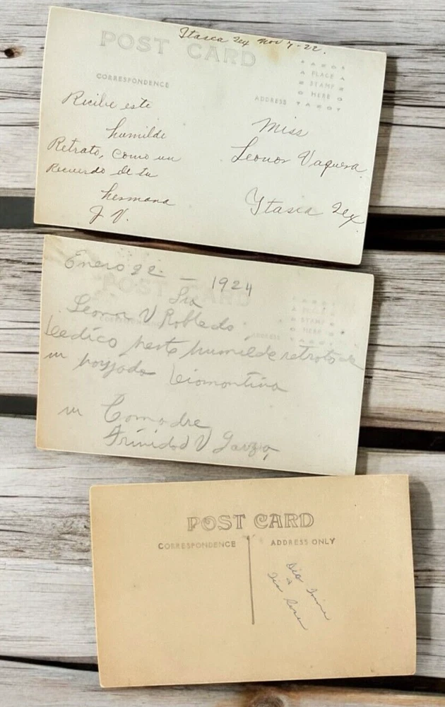 Lot of 11 RPPC's Real Photograph Post Cards of Hispanic Women & Girls dated 1920 - 1924 in Texas. Most photographs are black and white with a couple being sepia and are approximately 3-3/8" x 5-3/8". All cards have some degree of yellowing due age, slight bends/creasing, and stains/spanish writing on back. Photographs feature young and middle age Hispanic women posing with chairs/indoor and a couple are outdoor photo's.