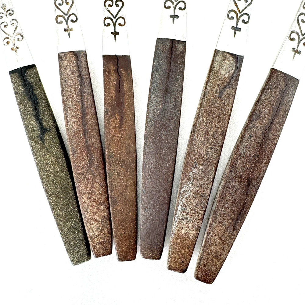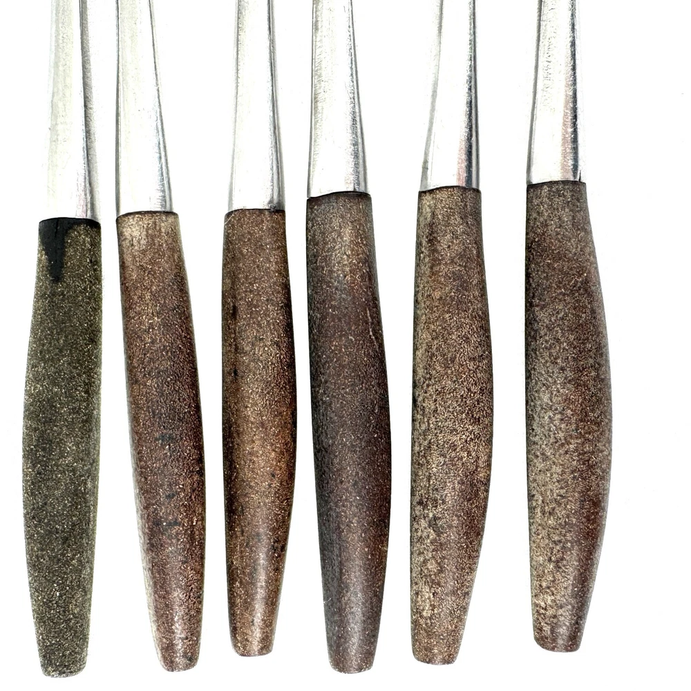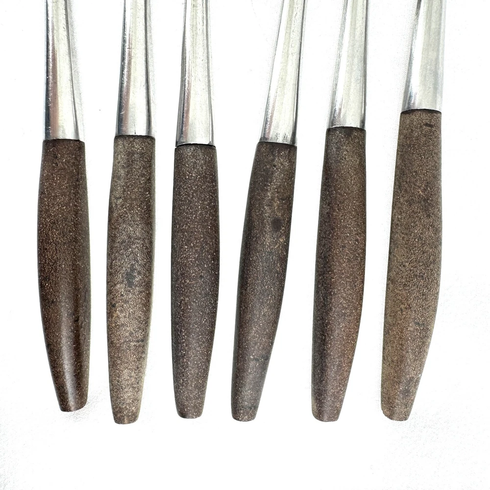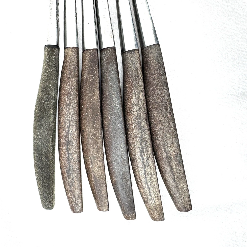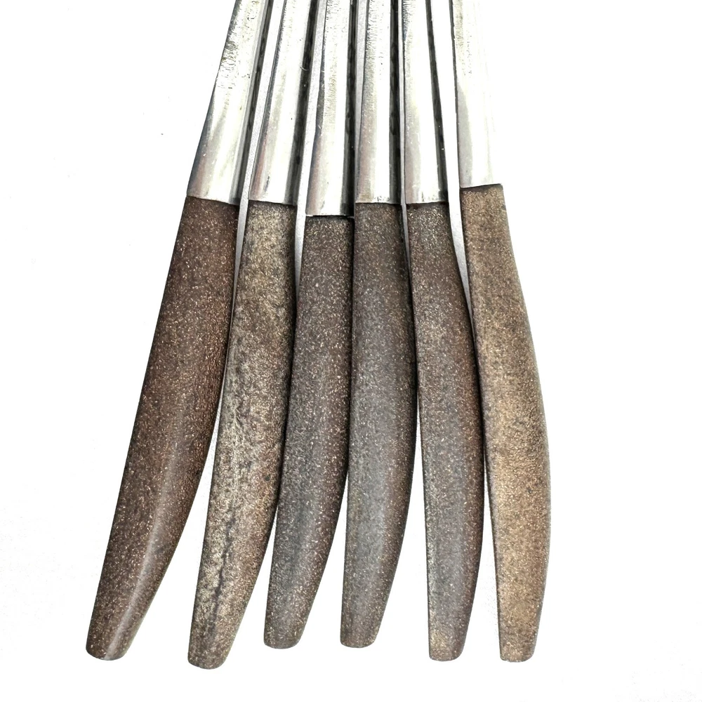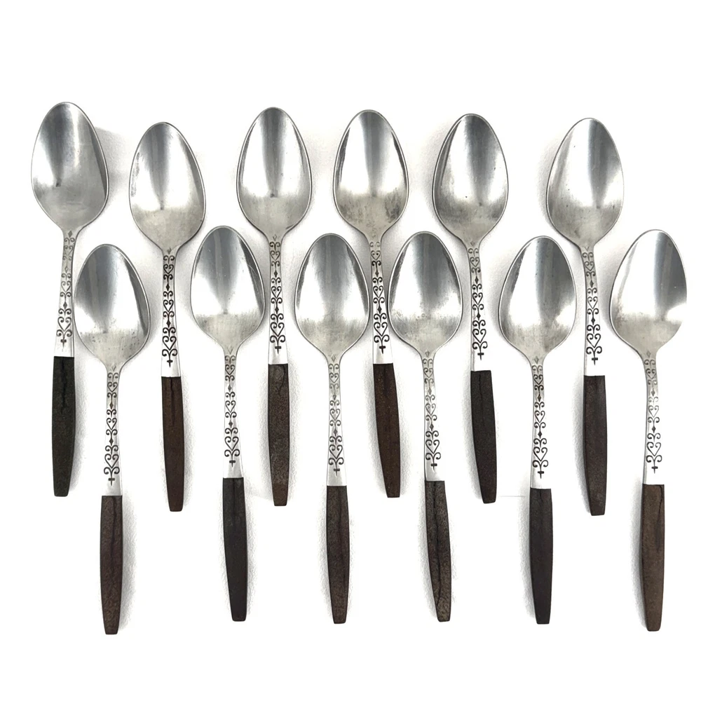 Offering a lot of 12 Interpur INR2 teaspoons 6.5” long, mid-century modern style, a discontinued pattern made in Japan. The brown synthetic handles are sturdy and have cracks, which look especially dark, having just been washed. The stainless steel is in good condition, no chips, dents, or disposal damage. There are surface scratches and wear consistent with normal use. Please view the photos for details and condition. Measurements and photo colors are approximate. For extra protection your items will be packed in plastic sleeves and shipped in a box. For combined shipping, request an invoice before paying. Shipping is your choice of USPS Ground Advantage or USPS Flat Rate Priority at the rate determined by eBay. Terms of Sale: Photos are of the actual item you will receive and is sold "as is". Placing an order is your agreement that you know what you are buying, have viewed the photos and find the condition acceptable. If you have any questions or concerns about your order, contact me through eBay Messages. Please inspect your item upon arrival and contact me if there are any problems so we may work out a solution, before you leave feedback or request a refund . No returns please.