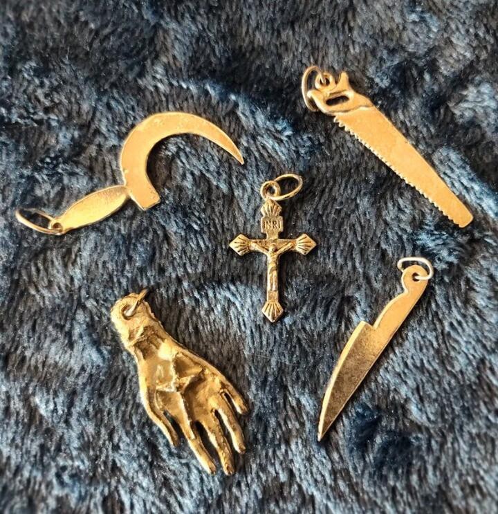 This lot of 13 pendant necklace pendants and bracelet charms offers a variety of styles and designs for jewelry making. The silver color and mixed metal material provide a versatile option for crafting unique and personalized pieces. Perfect for adding a touch of creativity to any necklace or bracelet project. Sword 1" Caravaca Cross 1" Knife 1" Leg 1.5" Arm .25" Mano Cornuto 1.5" Crucifix .75" Key .75" Bow & Arrow 1.15" Axe 1.25" Virgin 1" Saw 1.5" Sickle 1.25"