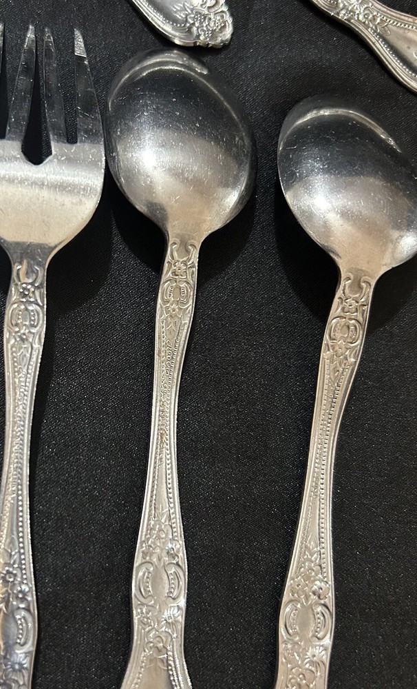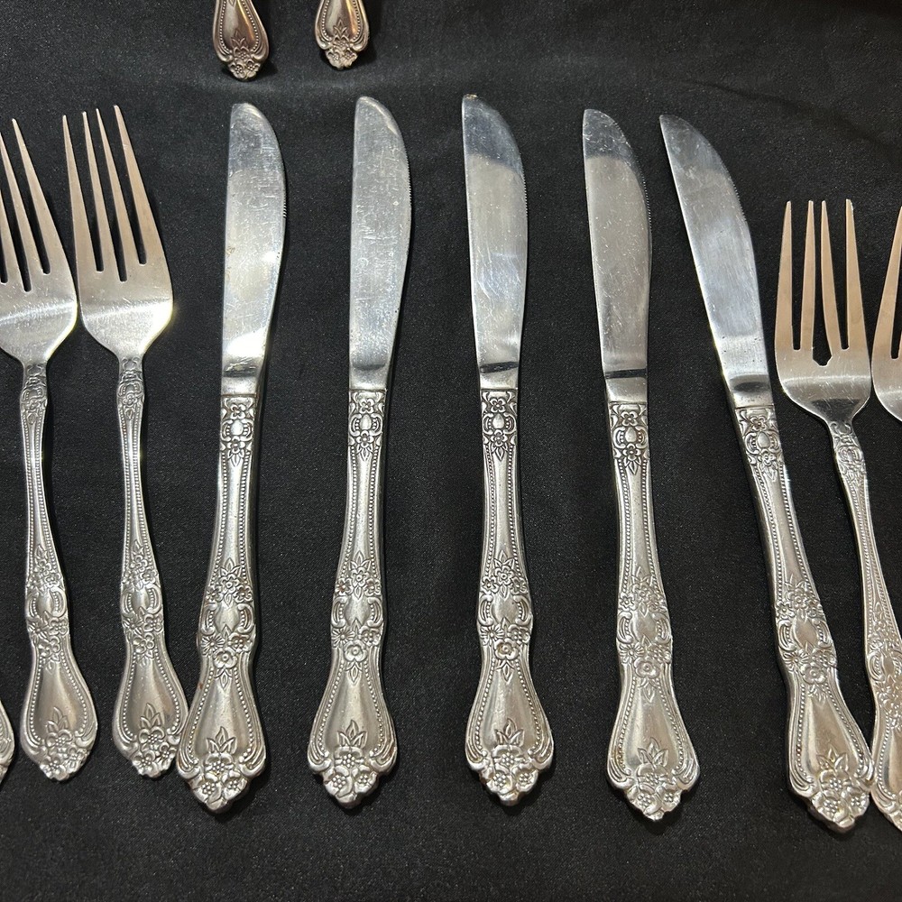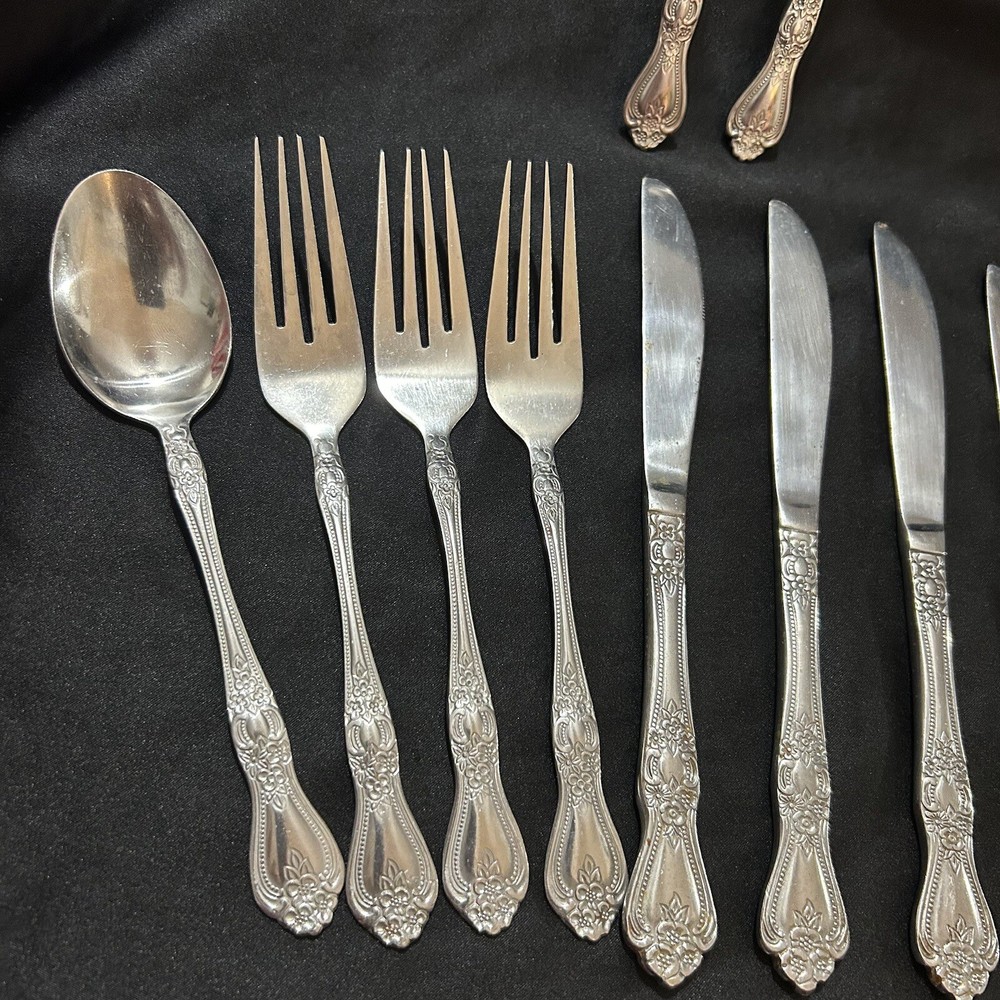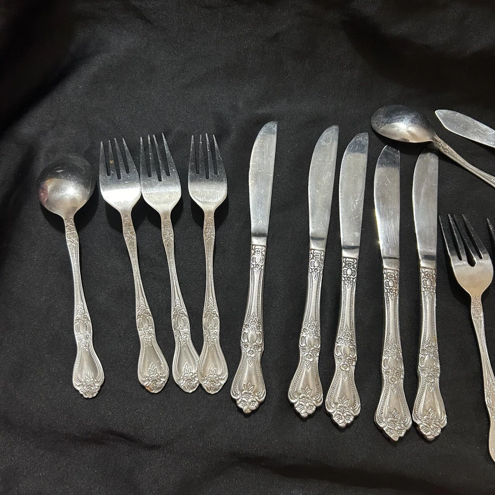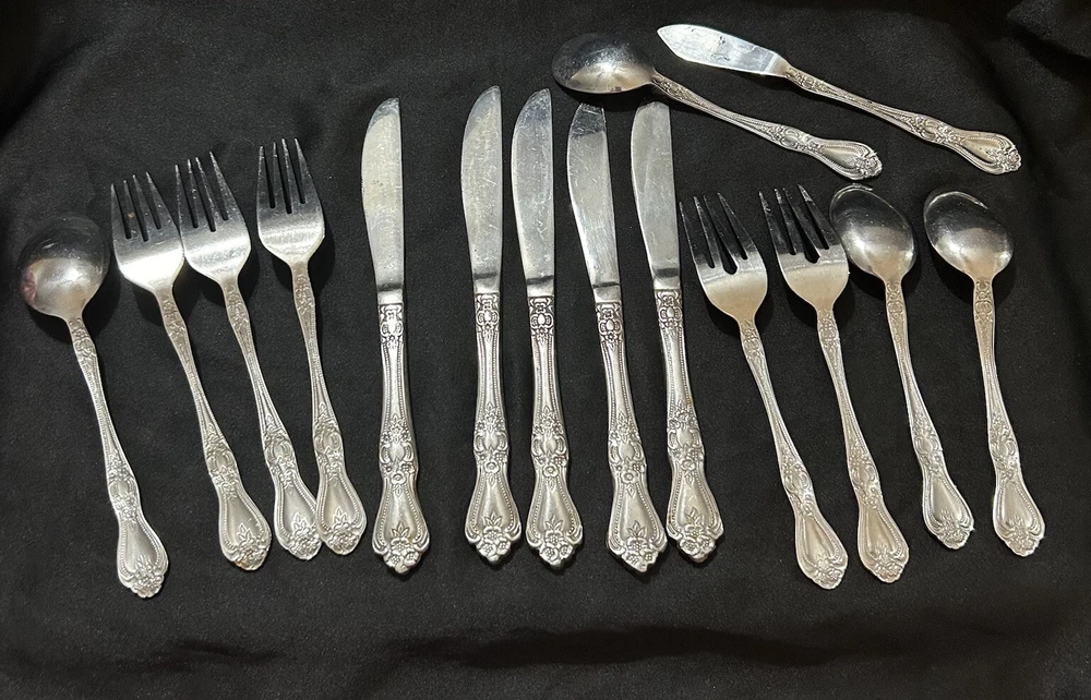 Lot Of 15 Rogers Precious Rose Forks Spoons Knives Butter Spreader & Sugar Spoon 3 Dinner knives 1 Place oval spoon 2 Dessert spoons 1 Sugar spoon 1 Butter spreader 5 Dinner knives Good vintage condition. Normal signs of wear and tear, minor scuffs and scratches. Please study pictures carefully before purchasing Feel free to ask any questions. Thank you for visiting our store! Bag10