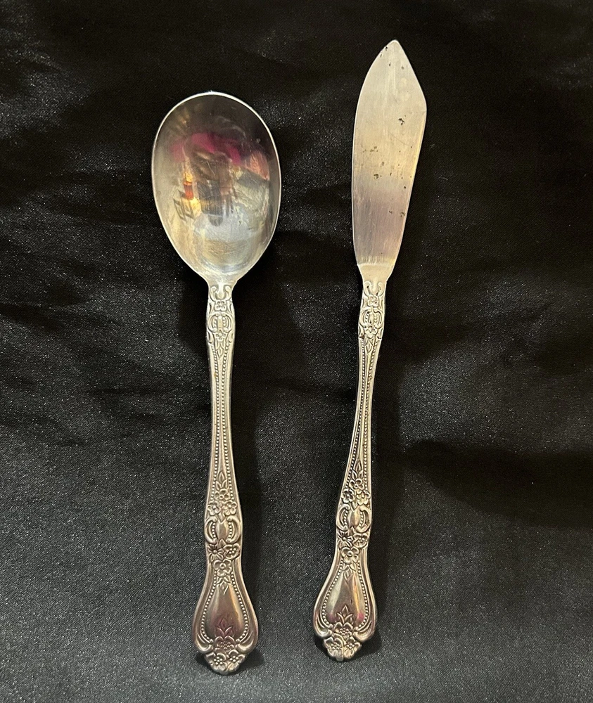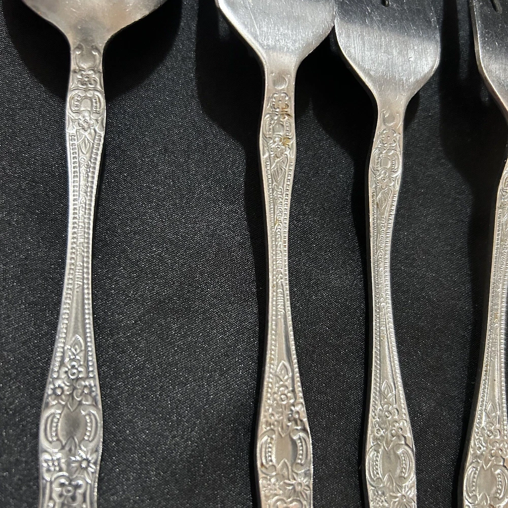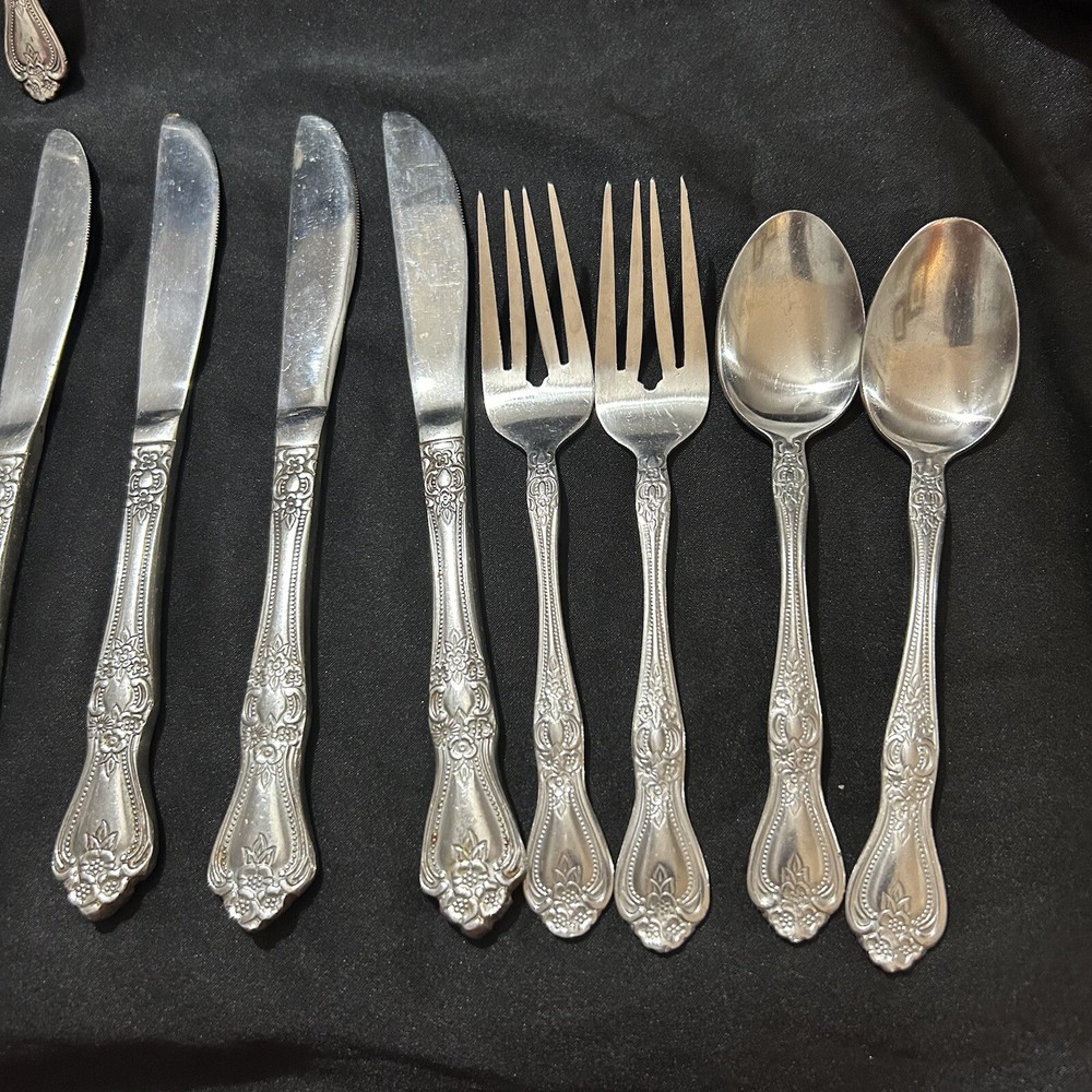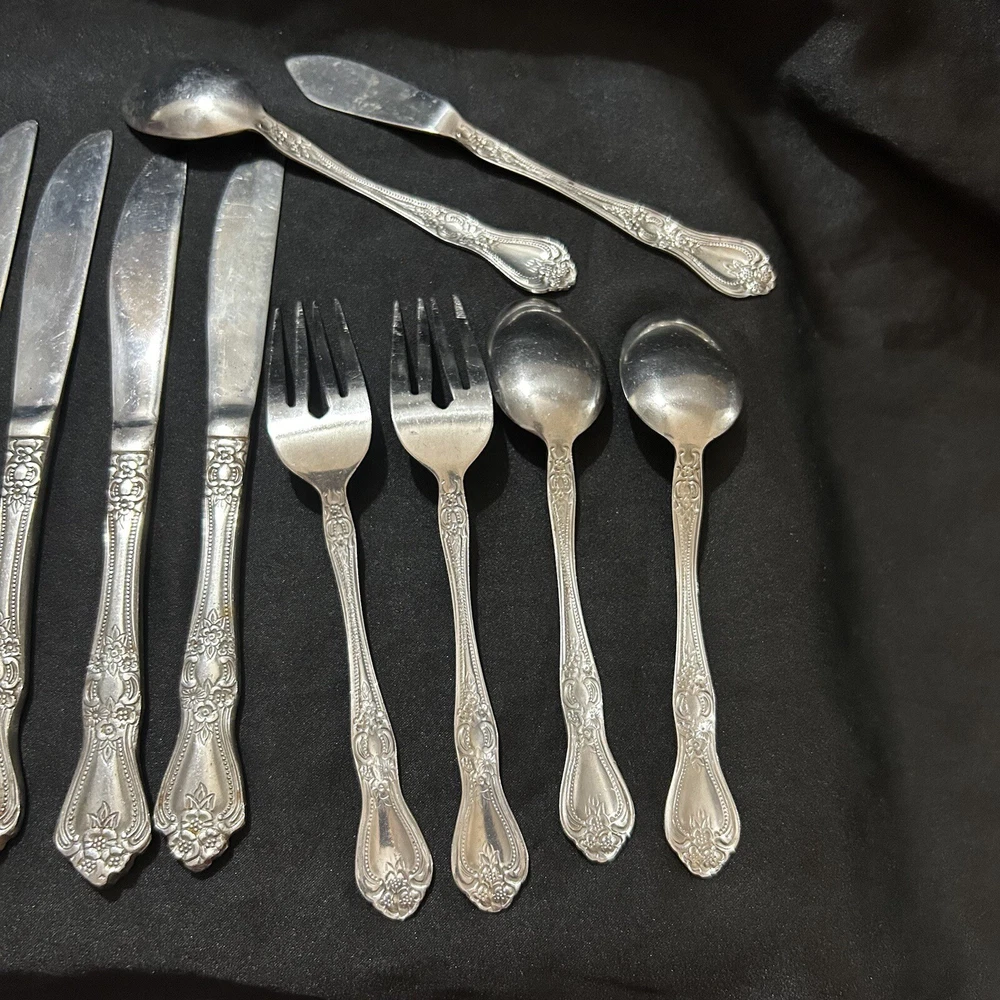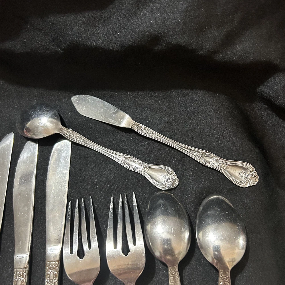 Lot Of 15 Rogers Precious Rose Forks Spoons Knives Butter Spreader & Sugar Spoon 3 Dinner knives 1 Place oval spoon 2 Dessert spoons 1 Sugar spoon 1 Butter spreader 5 Dinner knives Good vintage condition. Normal signs of wear and tear, minor scuffs and scratches. Please study pictures carefully before purchasing Feel free to ask any questions. Thank you for visiting our store! Bag10