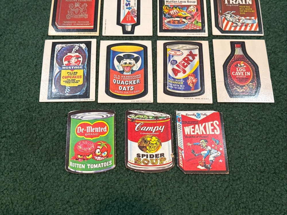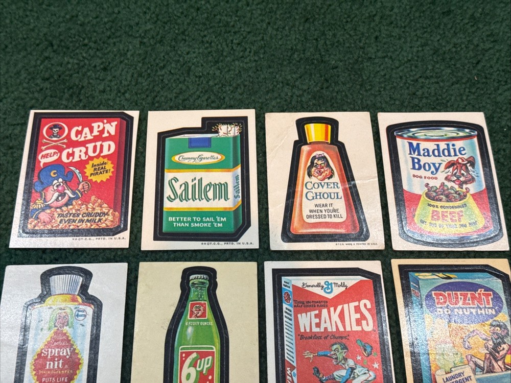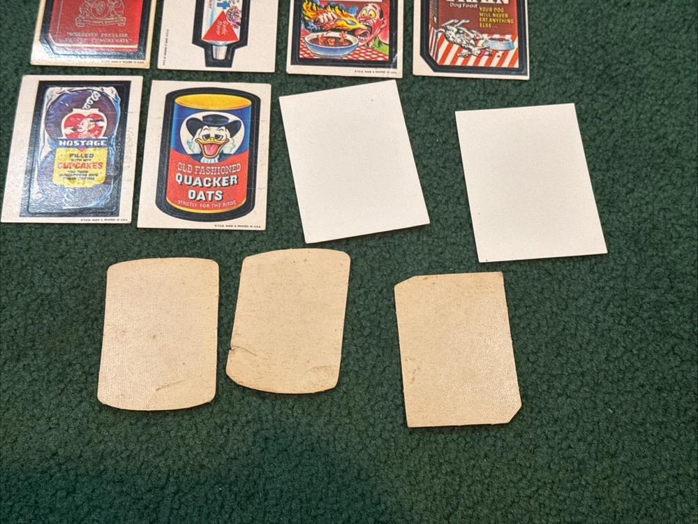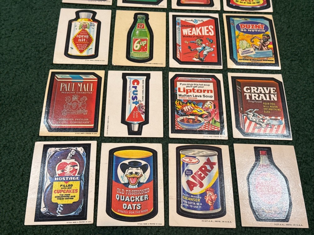 You are bidding on a lot of 19 different 1973 Wacky packs Topps cards. This is a fun vintage lot. These are white backs from the first series put out by Topps. 16 original stickers and 3 that are rigid cardboard, maybe perforated from wax box. Cards in this lot may have centering issues, very minor corner, surface and or edge wear, wax/gum marks, etc. There are two stickers with creases. Average condition of this lot is EX or better. A handful may be EXMT or better. A couple are worse condition. Wonderful vintage Topps non-sport lot. Buyer pays $6.00 shipping. Shipping combined on multiple lots whenever possible. MN residents add 6.875% sales tax. Thanks for your purchases! Please check out my Ebay store for more great items!