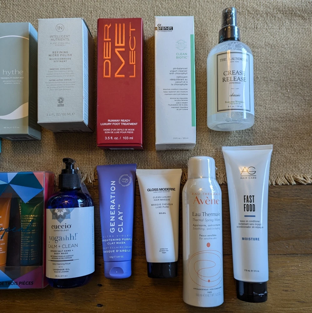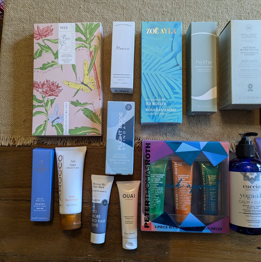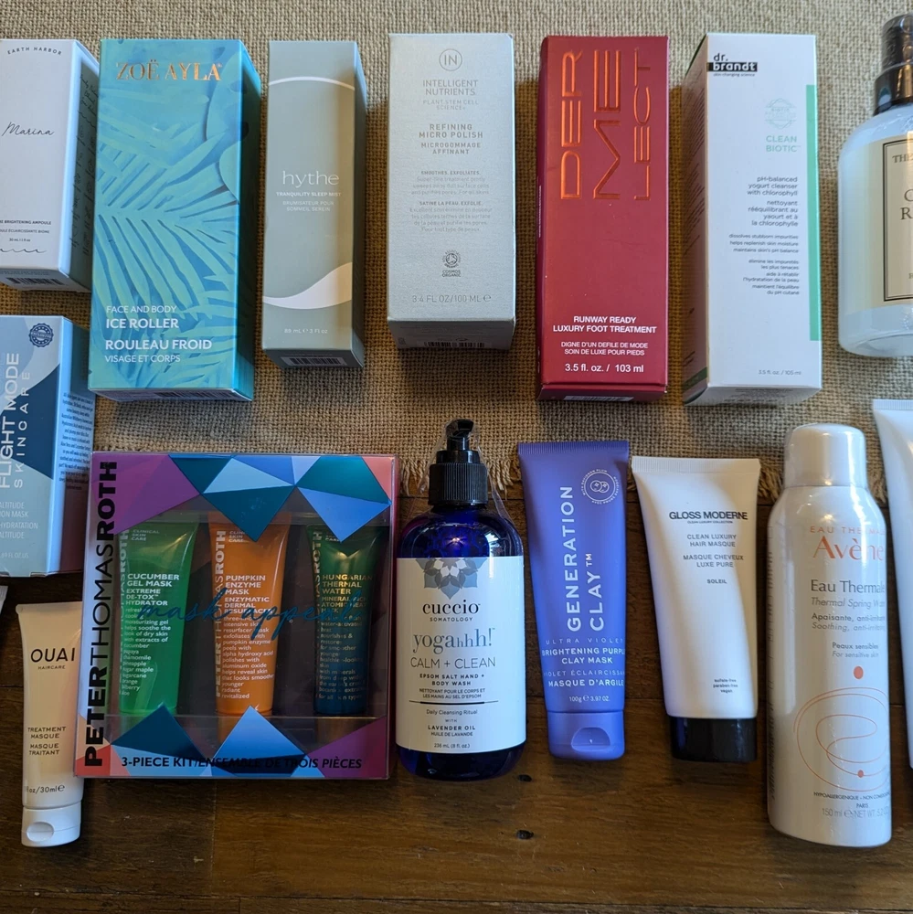 Lot of 19 beauty products, including facial masks, hair masks, foot masks and more! All products are new and sealed. Some come with boxes, some without boxes. Some are full size products, and some are sample sizes. Please see below for full product list. -Peter Thomas Roth "mask appeal" set of 3 (cucumber gel mask, pumpkin enzyme mask, Hungarian thermal water mask) -WEI Two-in-One Purify and Glow Mask Collection (4 Golden Root & 4 Brown Sugar masks with applicator brush) -Earth Harbor Marina Biome Brightening Ampoule -Flight Mode Skincare High Altitude Hydration Mask -Tarocco Foot Cream (Sicilian Blood Oranges) -Generation Clay Ultra Violet Brightening Purple Clay Mask -Hythe Tranquility Sleep Mist -Intelligent Nutrients Refining Micro Polish -Dermelect Runway Ready Luxury Foot Treatment -Dr. Brandt Clean Biotic pH-balanced yogurt cleanser with cholorophyll -Eua Thermale Avene Thermal Spring Water Spray -The Laundress Crease Release -Cuccio Somatology Yogahhh! Calm + Clean Epsom Salt Hand + Body Wash with Lavender Oil -Gloss Moderne Clean Luxury Hair Masque -AG Hair Care Fast Food Leave On Conditioner -Rescue My Hair Mask "No More Bad Days" -OUAI Haircare Treatment Masque -Aromatherapy Associates Deep Relax Roller Ball -Zoe Ayla Face and Body Ice Roller Seller's Disclaimer and Terms: No refunds or returns. Seller is not responsible for items that do not fit true to size or for “accidental purchases”. Be sure to view photos for any possible flaws or wear on goods and items. Ask any questions before purchasing, I will be happy to help!