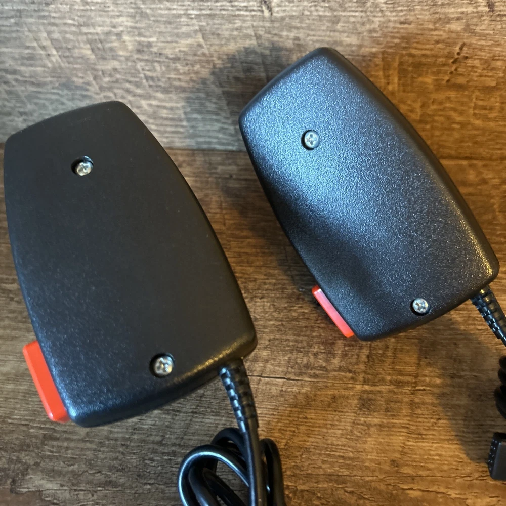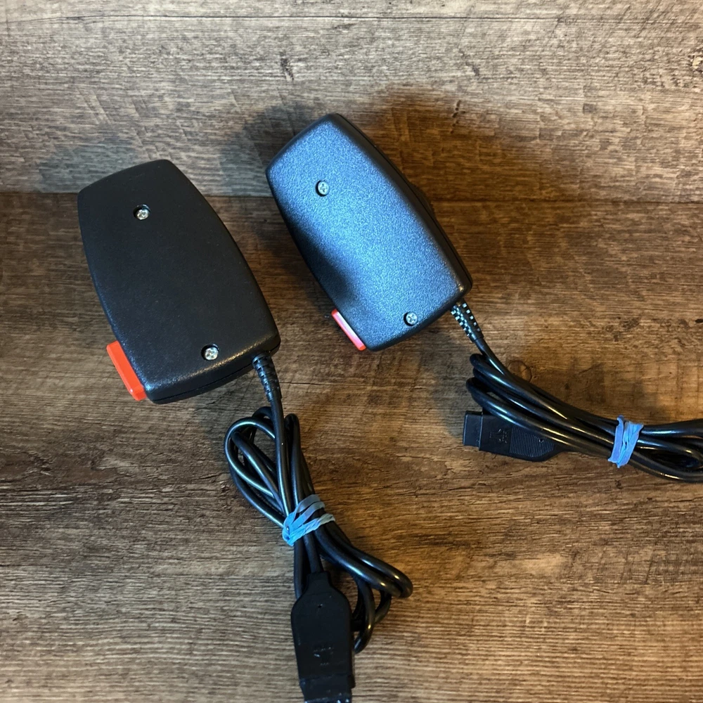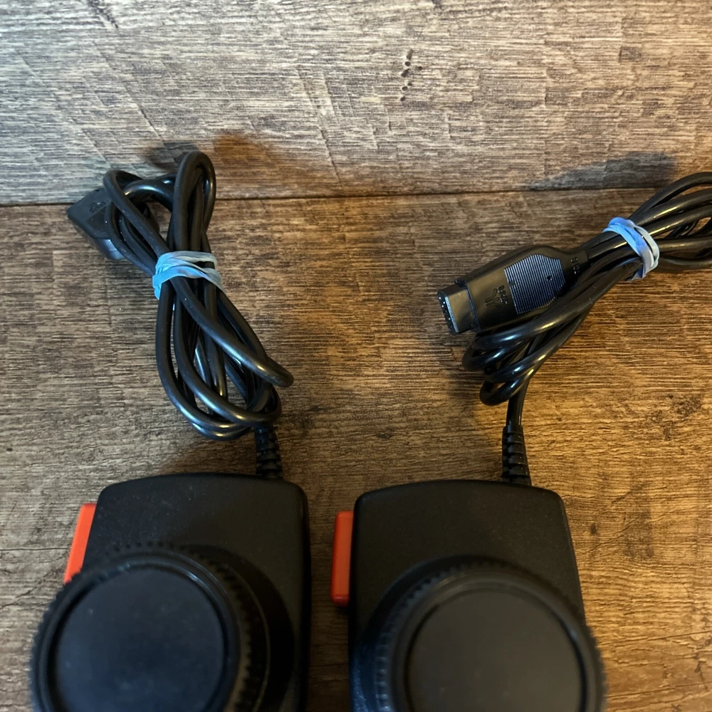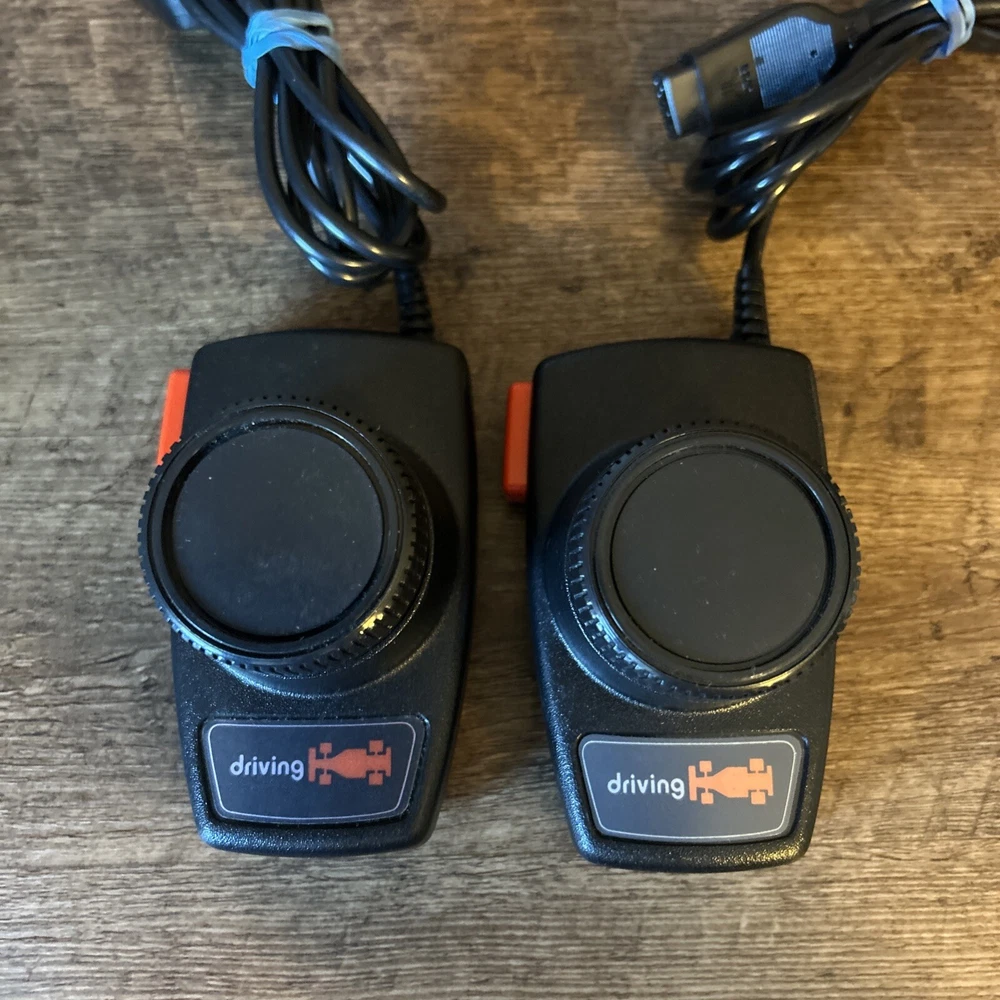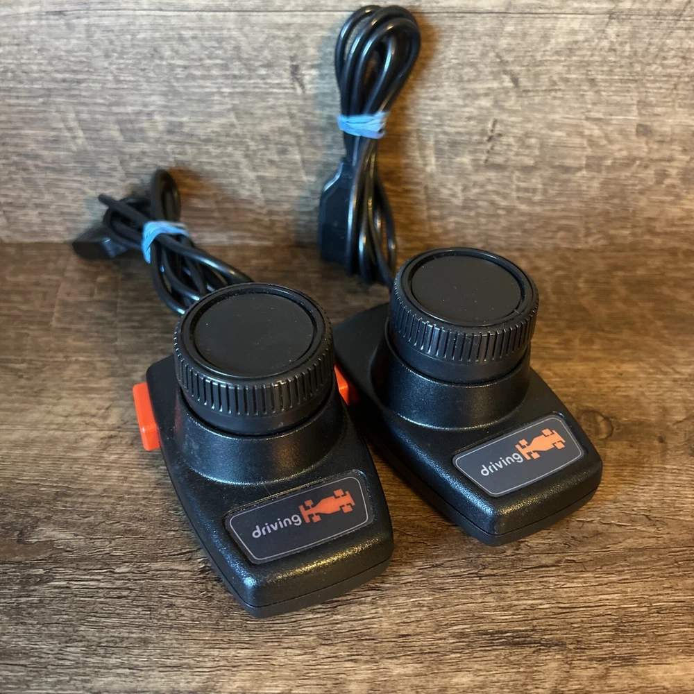 The product is a pair of Atari 2600 driving racing wheel controllers. They are compatible with Atari 2600 and Commodore 64 platforms, featuring wheels for a realistic driving experience. The controllers can be connected to the Atari 2600 console and are designed for racing games that support a maximum of 2 players. They have been tested and confirmed to be in working condition.