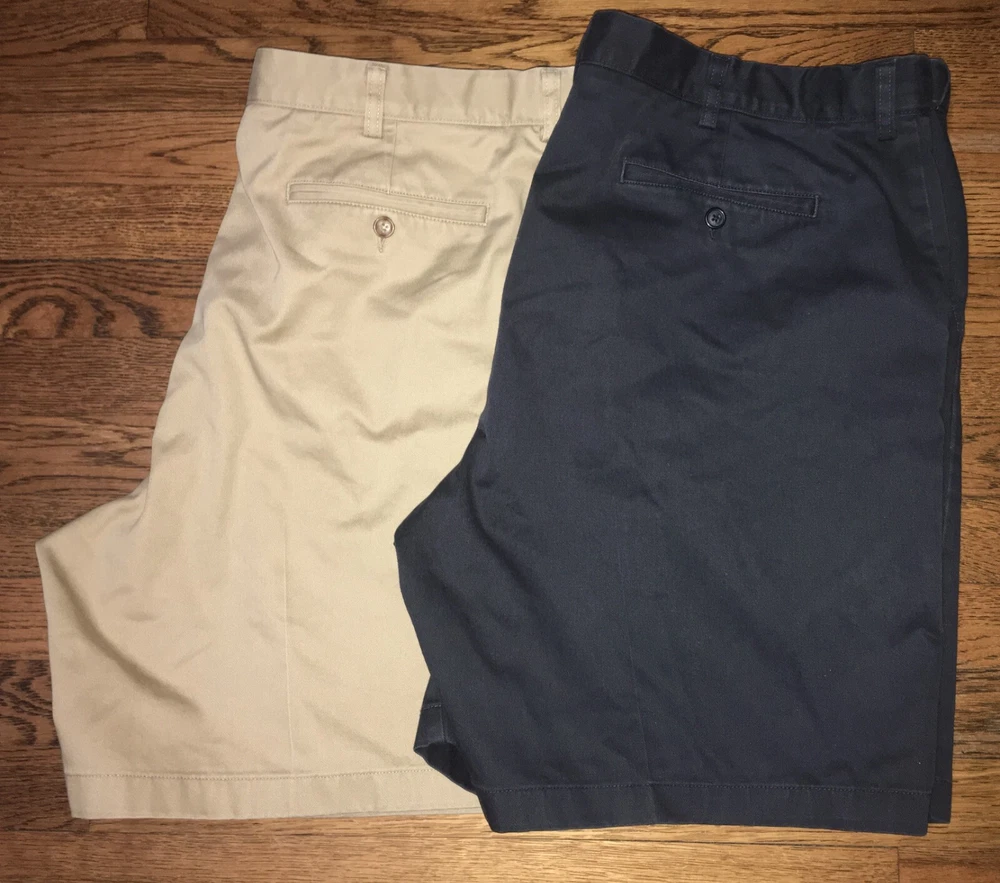 Lot of 2 LL Bean Chino Shorts Mens 42 Navy Hidden Comfort Waist 100% Cotton Preowned shorts in great condition, both shorts don have some minor stains but no tears, stains shown in pictures, overall still great condition shorts. Feel free to ask any questions about this item, all of our items come from a smoke free environment.