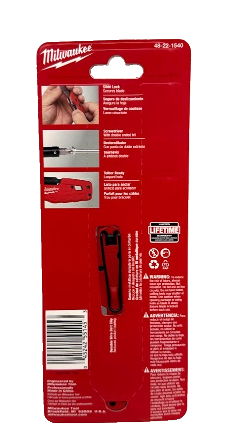 Blade Material: Stainless Steel Features: Can Be Sharpened, Folding Handle, Lockable Blade UPC: 045242551453 Blade Edge Type: Straight Edge Color: Red Brand: Milwaukee Type: Knives MPN: 48-22-1540 Blade Style: Tanto gtin13: 045242551453 Model: Milwaukee FASTBACK 5- in-1 Folding Knife with 3 in. Blade Number of Pieces: 2 Handle Material: Plastic