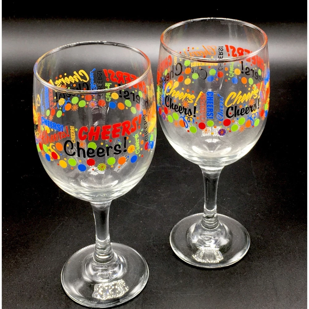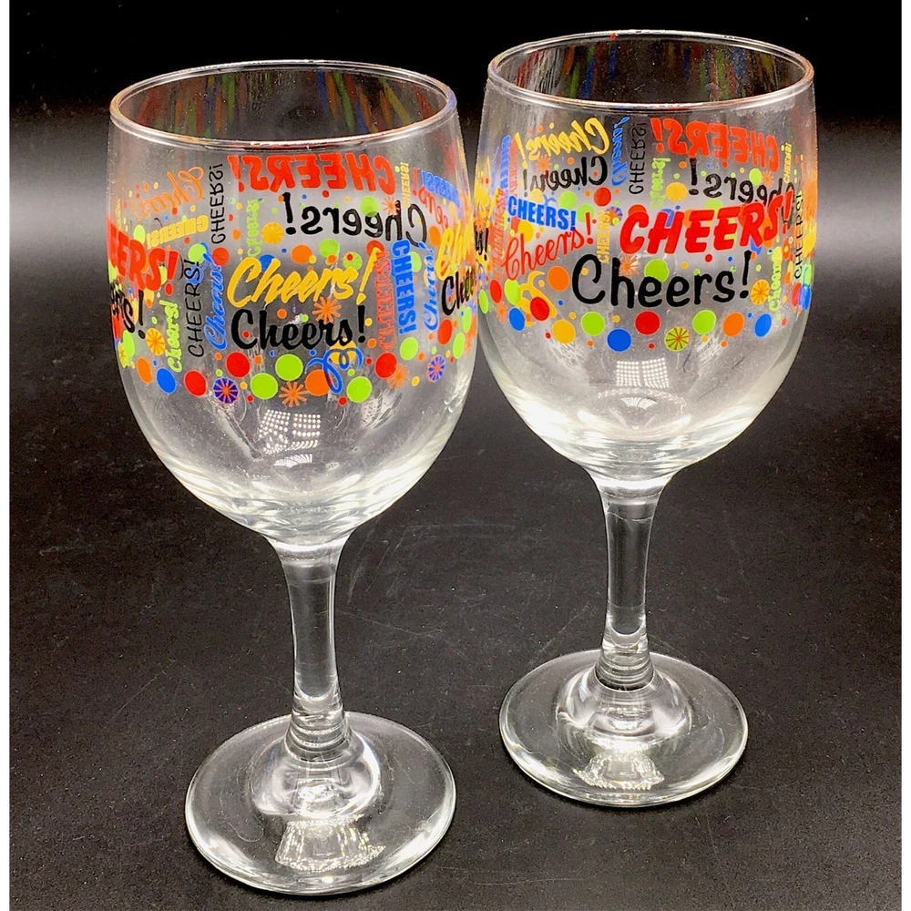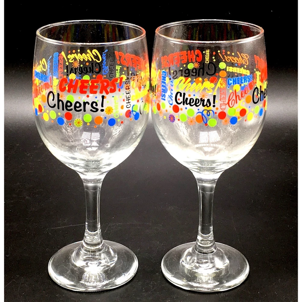 Cheers!! Written in colorful primary colors Nice pair of goblets to celebrate your special occasion. New Years celebration wine or special beverage glasses!! • Brand: Libbey • Size: 7" H • Capacity: 11.5 Oz • Graphic: Bubbles and letters • Color: Black, red, blue, orange, green, yellow • Material: Glass Condition: Pre-Owned. Like new condition. No chips or damage. See all pictures of exact items offered.