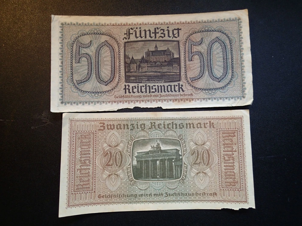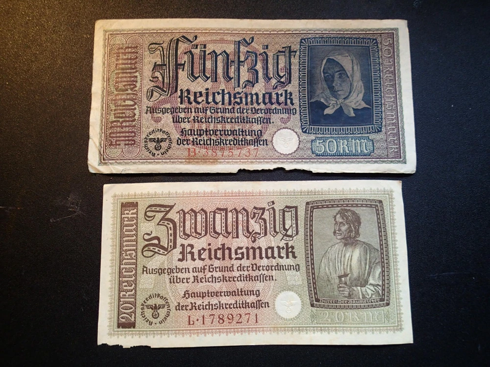 .. Lot of 2 ORIGINAL WW II BANKNOTES NAZI GERMANY GERMAN 20 & 50 REICHSMARK