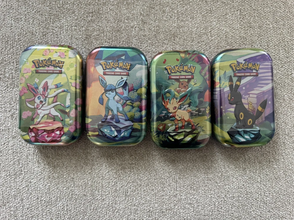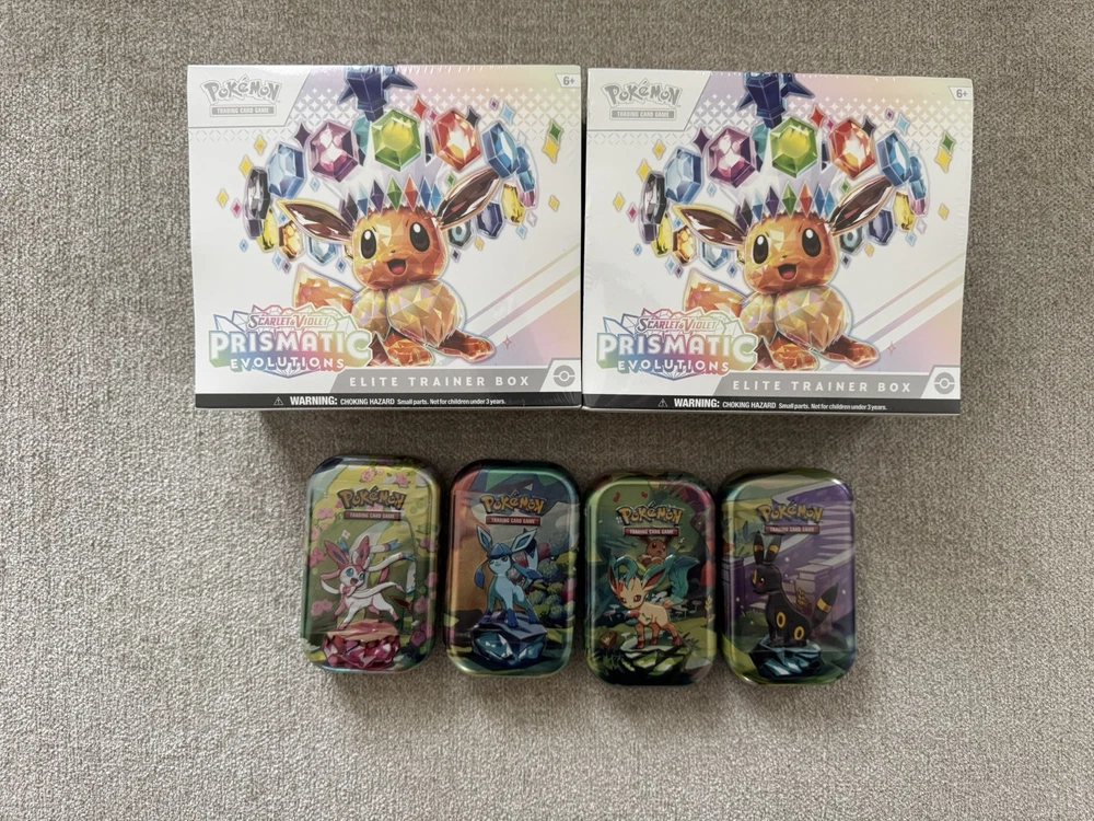 The product is a lot of two items: a Pokémon Prismatic Evolutions Elite Trainer Box and four tins, all featuring Eevee from the Pokémon TCG. The Elite Trainer Box is sealed and includes a standard-sized set from the Scarlet & Violet series. The English-language box is designed for ages 8 and up and is made of cardboard. This lot is ideal for collectors or players looking to expand their collection with new cards and accessories in a single purchase. All items are factory sealed