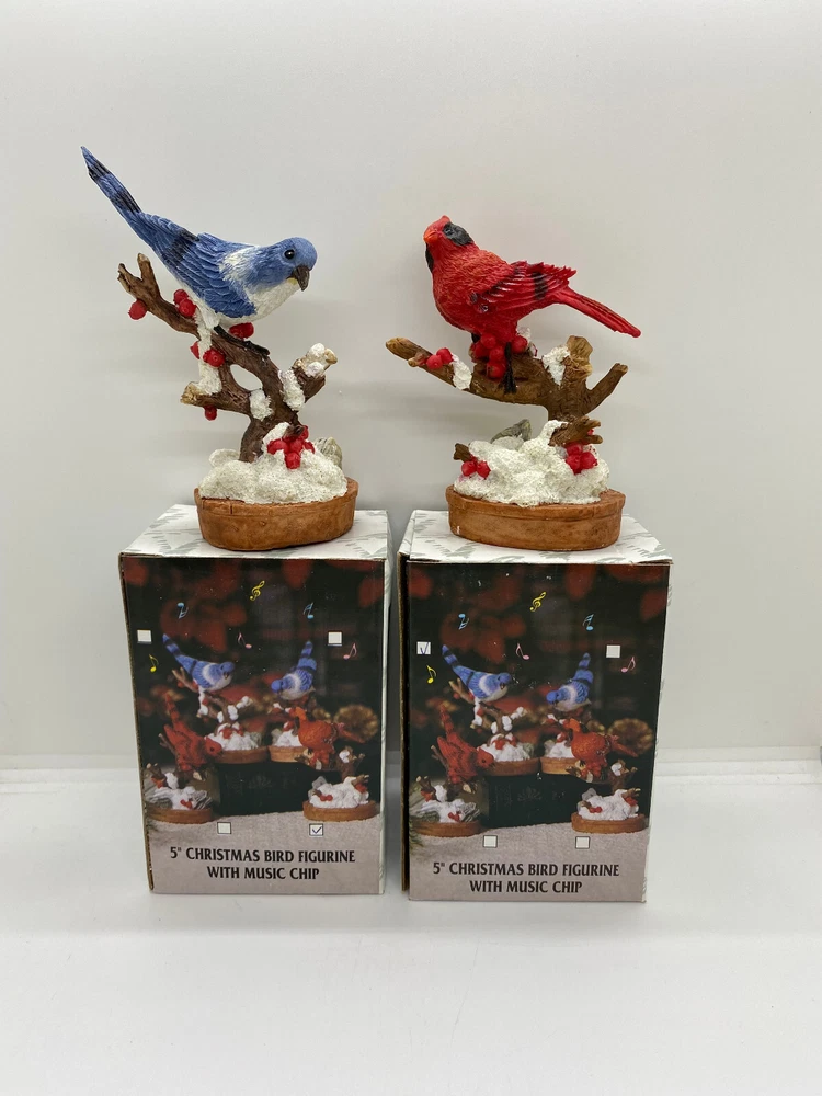 Lot of 2 - Resin Christmas Cardinal +Birds Musical Figurines 5'' - NEW"