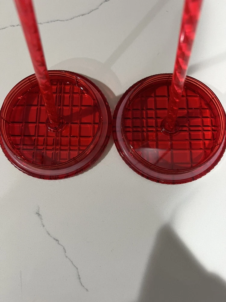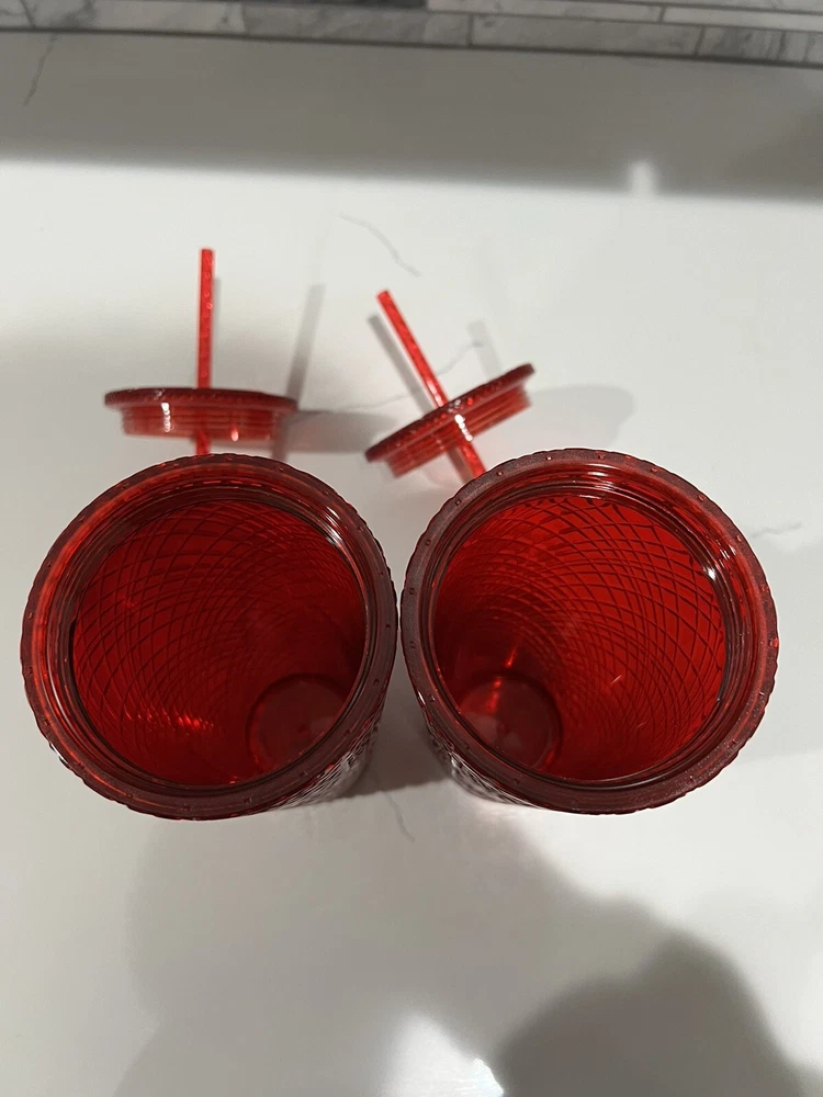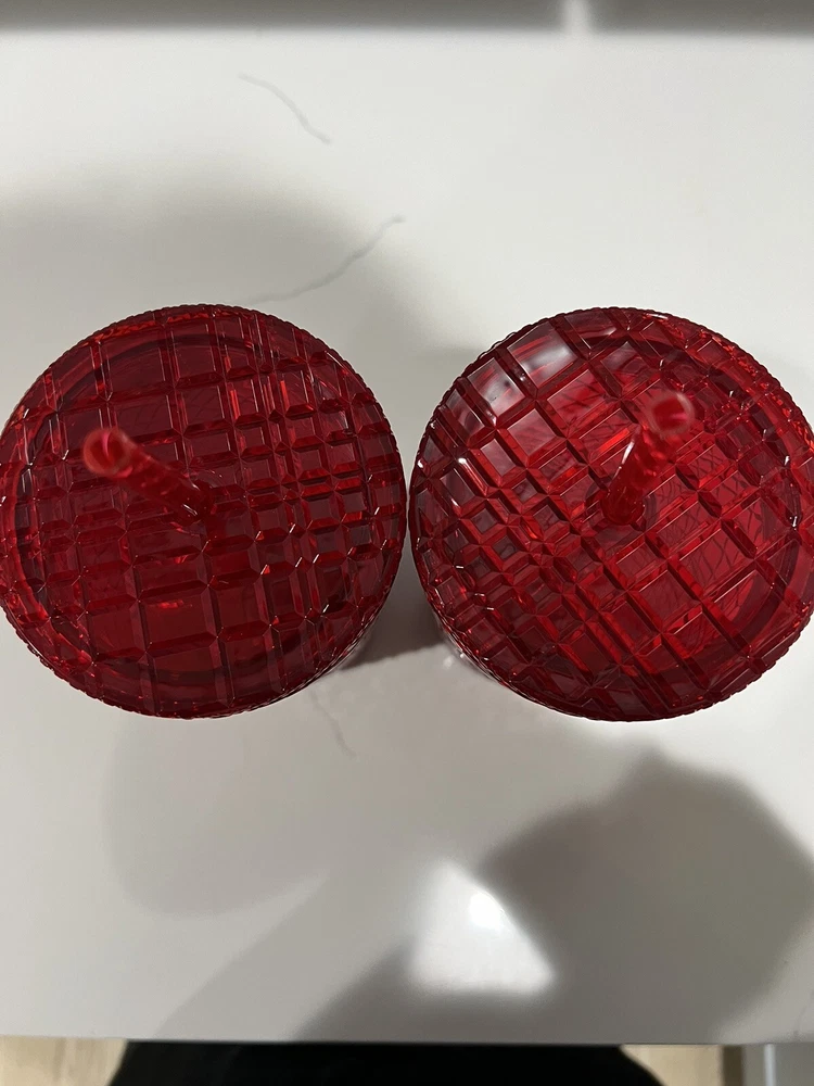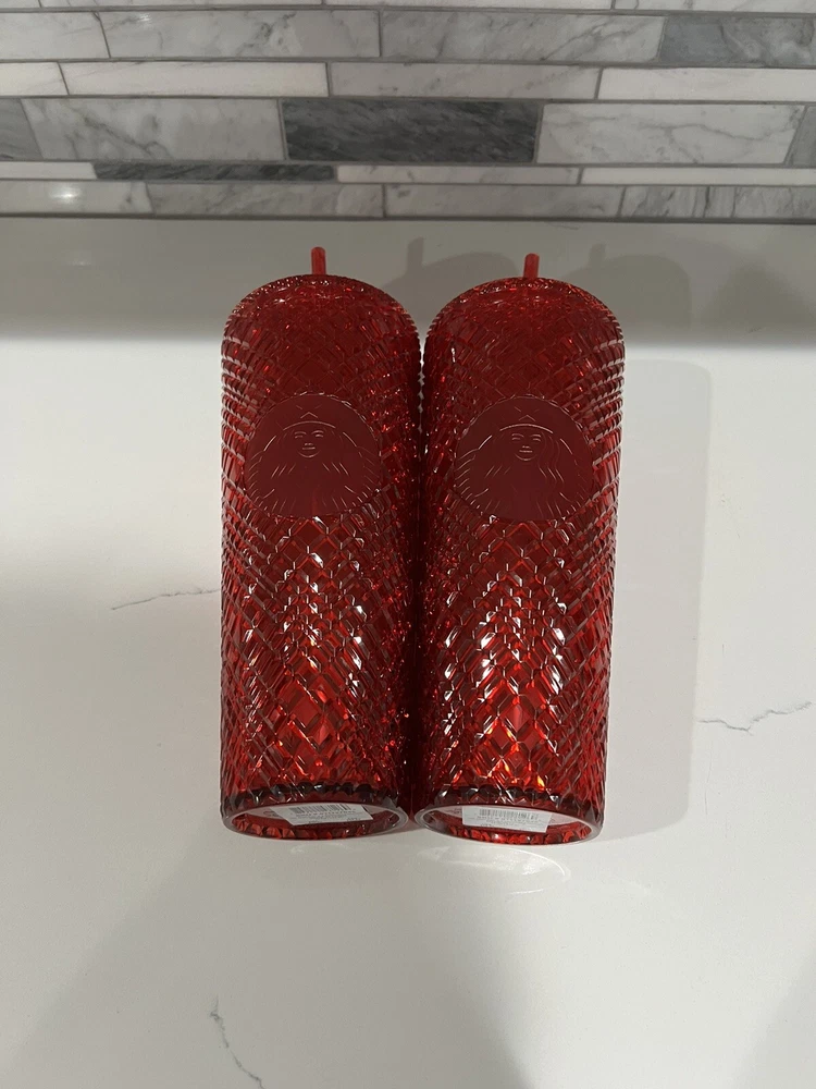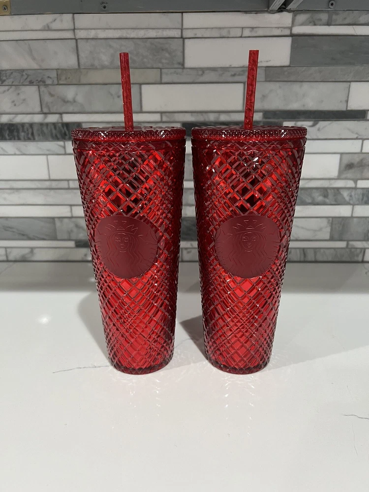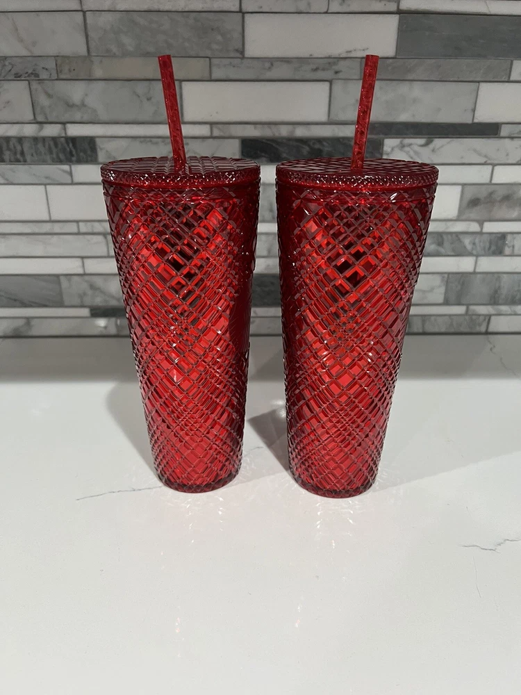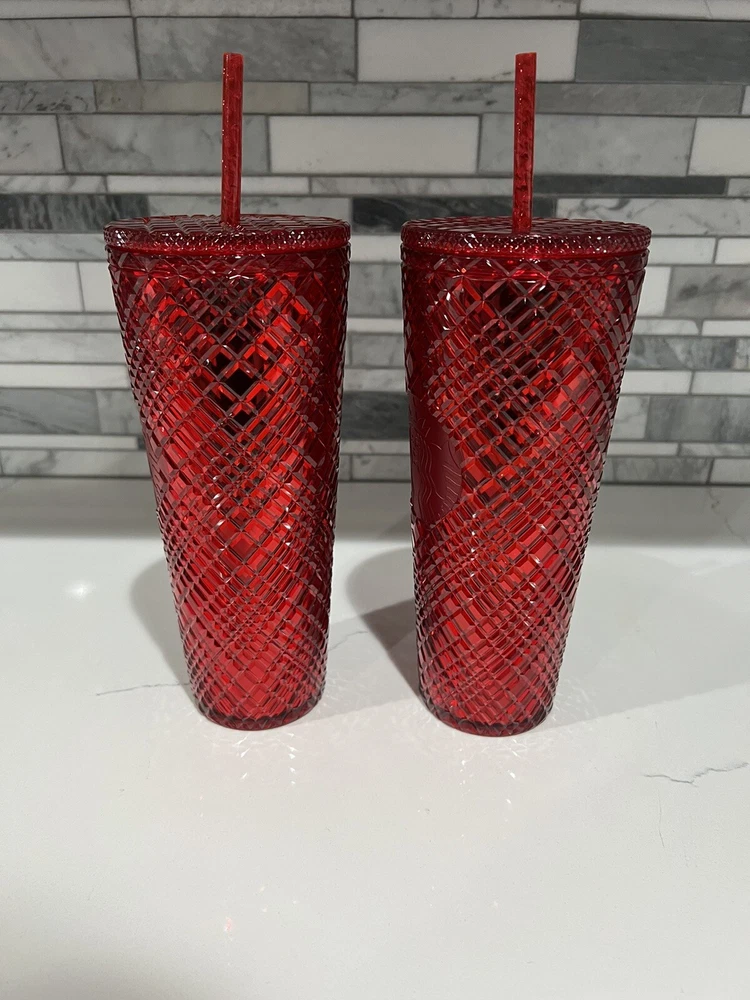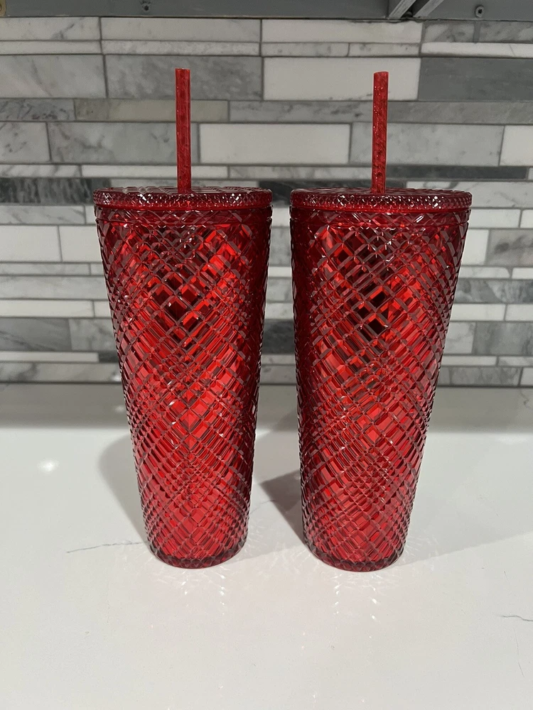 This lot includes two Starbucks Red Jeweled Venti 24 oz Tumbler Cold Cups from the 2021 Winter Holiday collection. These original cups feature a beautiful red color with intricate jeweled details. They are perfect for coffee and tea lovers who enjoy their drinks in style. The cups are made by Starbucks, a well-known brand in the food and beverage industry, and are sure to impress any collector. Add them to your collection today!