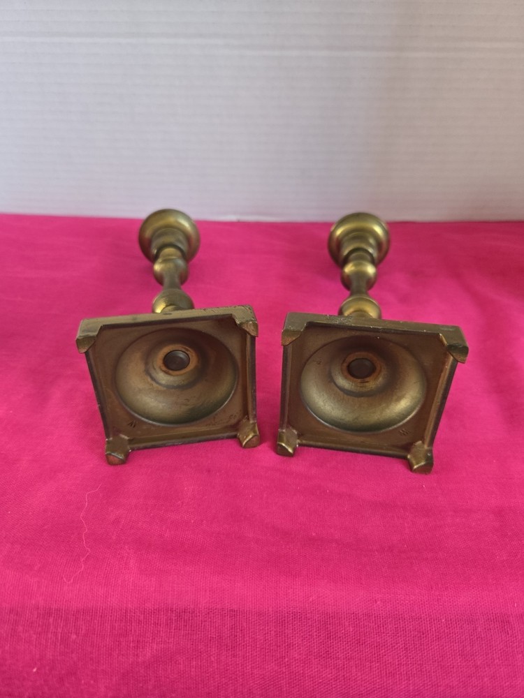 This lot of 2 vintage 6" solid brass candlestick holders features a mid-century modern design, perfect for any room in your home. The round shape and antique brass finish add a touch of elegance to your space. These candle holders are suitable for furniture and can be cleaned with a damp cloth, making them easy to maintain. The marking on the bottom indicates the brand as "W", adding a unique touch to these collectible decorative pieces. The gold color and medium size make them versatile for all occasions.