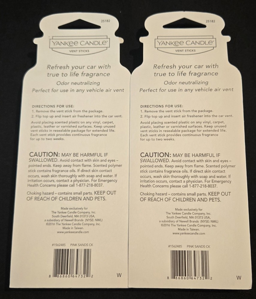 The product is a set of two Yankee Candle Car Vehicle Vent Sticks in Pink Sands scent, designed for cars. Each set includes four clip-on air fresheners made of plastic in a pink color. They are specifically designed to be used with car vents and function as odor eliminators. The product is manufactured by Yankee Candle Company and is part of their product line of Yankee Candles. These vent sticks are a convenient way to keep your car smelling fresh and clean while on the go. Shipping is FAST AND FREE! We ship all items with the utmost care.