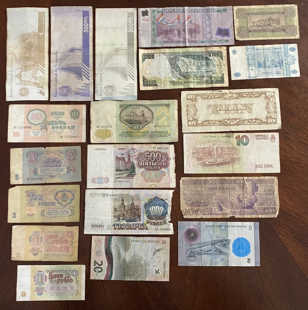 Lot of 20 Assorted Banknotes 10 Countries: Venezuela, Russia, Paraguay, Jamaica, Mexico, Nicaragua, Moldova, Argentina, Philippines and Greece. These notes are old and are in circulated condition. They may be dirty, have noticeable fold marks, writings, tapes or stains, and some may have small tears along the edges or pin holes, just like any circulated paper money. If you have any questions, feel free to ask. Look at the pictures, these are the exact notes that you will receive. best regards.