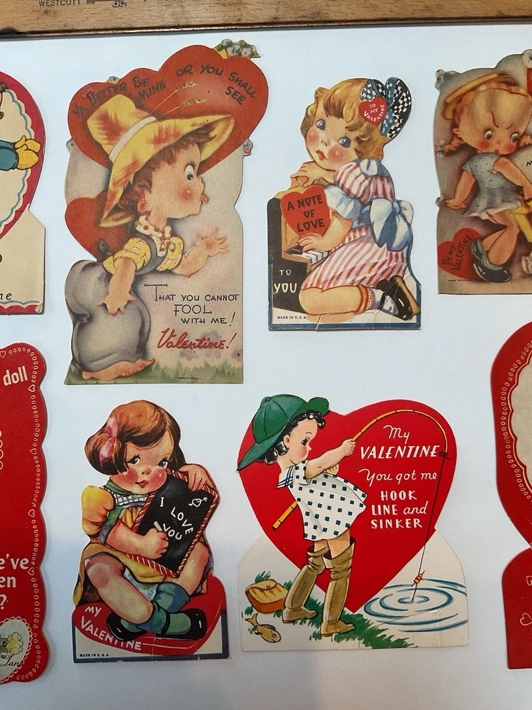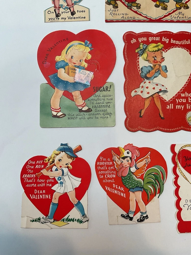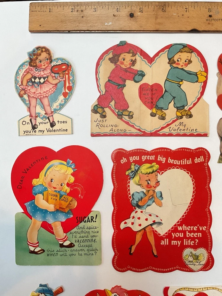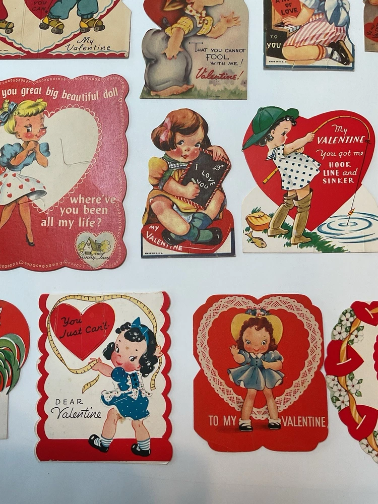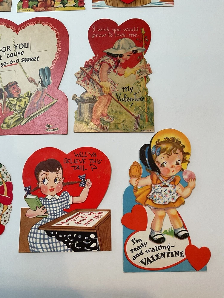 We have for sale a lot of 20 vintage valentines. They are from the 1940s/50s and are in used condition. They feature sweet little girls all trying to entice a valentine. 15 of them say "Made in the U.S.A." and two of them say "Made in Canada". Companies include Sunny Lane, Erco Candies, A-meri-card, and Carrington Co. All are inscribed; 5 are inscibed with the date: 1943, 1944, 1946(3). These are not in perfect condition- which is to be expected in valentines that are 80+ years old- again all have written inscriptions, there are creases, remnants of folded tape/areas where looks like tape has been removed, etc.,...but so charming! Please look at all pictures and ask questions before purchasing. Thank you!