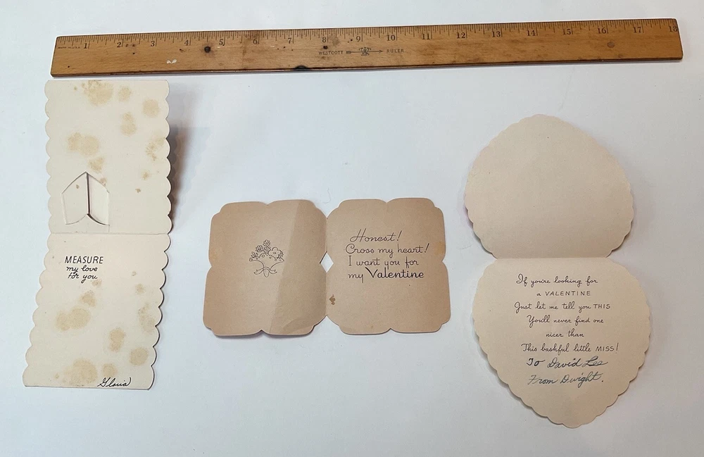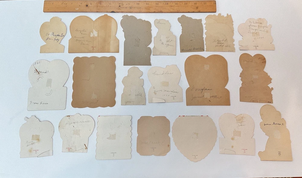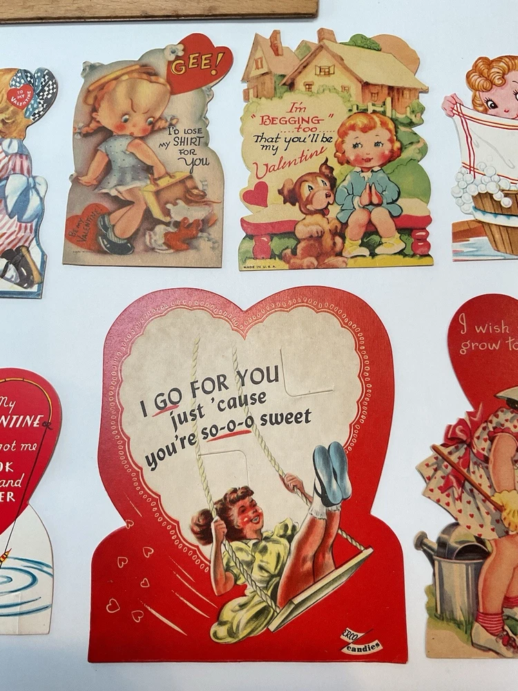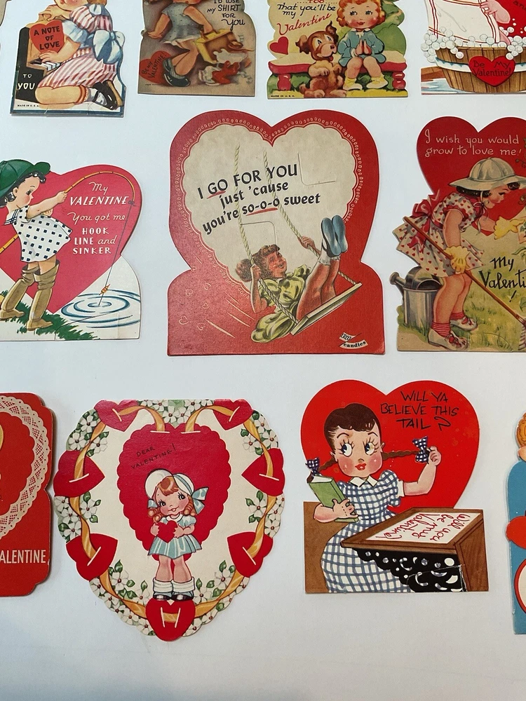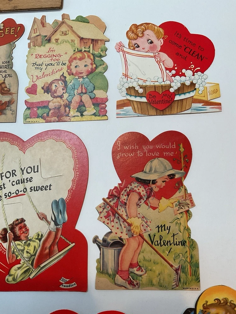 We have for sale a lot of 20 vintage valentines. They are from the 1940s/50s and are in used condition. They feature sweet little girls all trying to entice a valentine. 15 of them say "Made in the U.S.A." and two of them say "Made in Canada". Companies include Sunny Lane, Erco Candies, A-meri-card, and Carrington Co. All are inscribed; 5 are inscibed with the date: 1943, 1944, 1946(3). These are not in perfect condition- which is to be expected in valentines that are 80+ years old- again all have written inscriptions, there are creases, remnants of folded tape/areas where looks like tape has been removed, etc.,...but so charming! Please look at all pictures and ask questions before purchasing. Thank you!
