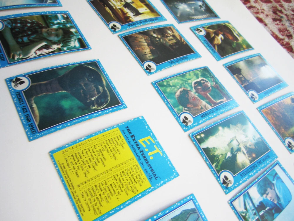 Lot of 23 original 1982 "ET The Extraterrestrial" movie bubblegum trading cards in varying condition, mostly excellent. These measure 3.5" x 2.5", regular-sized trading cards, genuine vintage. CONDITION: Actual items are shown. All are used but mostly in great shape, a few may have minor dings or minor creasing. Sold as is. PACKAGING: This set will ship carefully packed inside a small box. Feel free to ask questions if you have them - we offer discounts on multiple purchases! GRADING: We grade our trading cards and collectible sticker cards according to the eBay Sports Card Buying Guide, which can be found by clicking/tapping here . RETURNS: Accepted if item is still in the condition we sent it in. We do not accept items that have been used and/or altered by the buyer. CLICK OR TAP HERE TO SEE ALL THE VINTAGE AND NEW TRADING CARDS AND COLLECTIBLE STICKERS IN OUR EBAY STORE! LOTS of vintage sports cards (1950s-1980s), 1980s Garbage Pail Kids, vintage Pokemon and more! CLICK OR TAP HERE to visit our eBay Store and save on shipping with ONE INTERNET STOP! With over 1500 different items to choose from, we have something for every kid on your list (even the big ones)! Buy with confidence from us -- we have over 20 years experience selling on eBay and other venues!