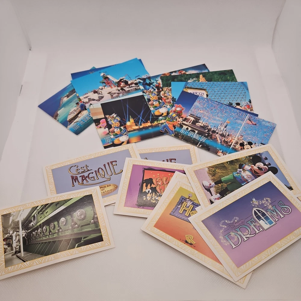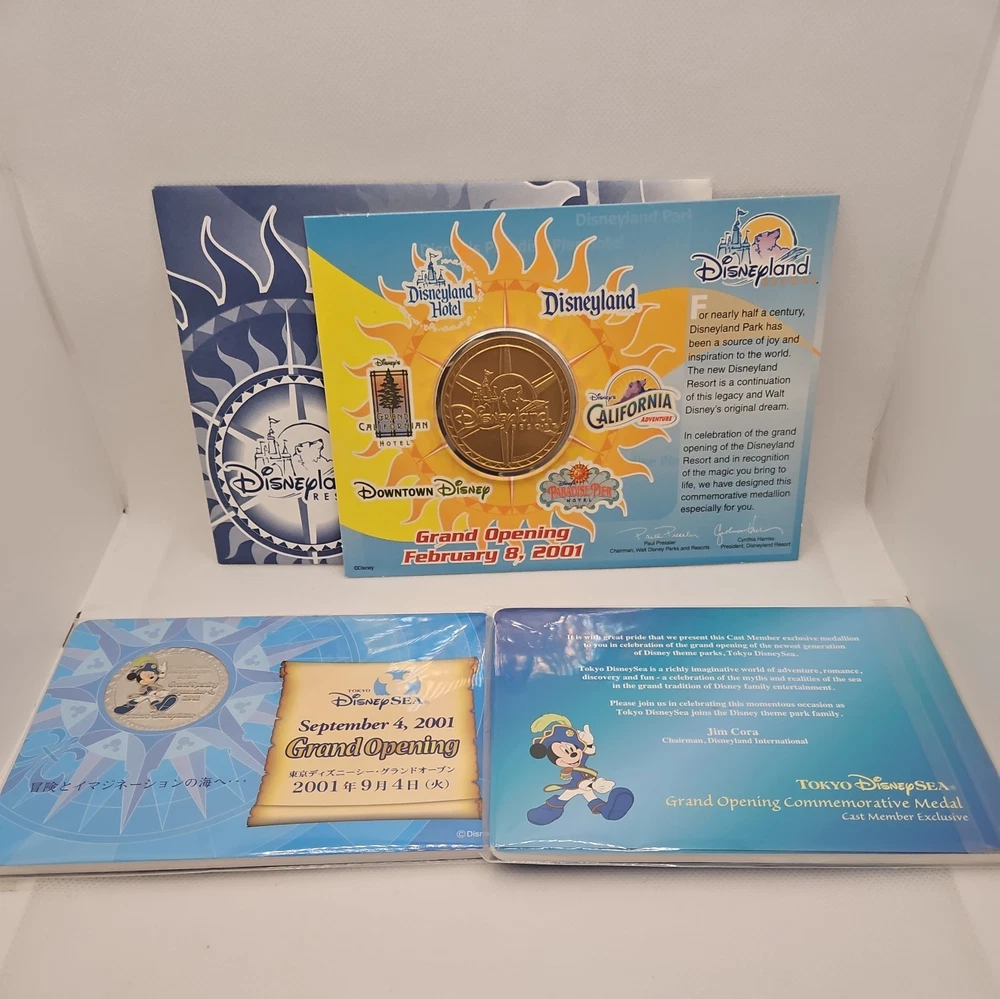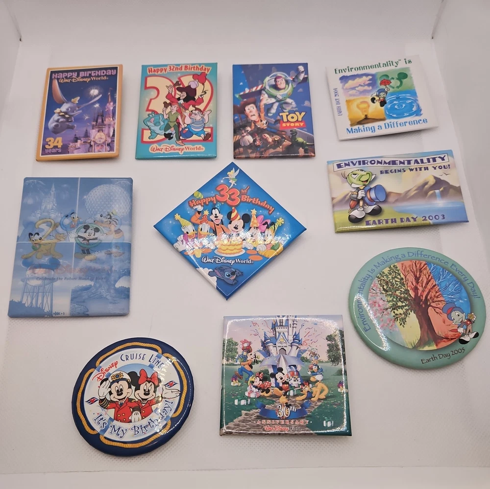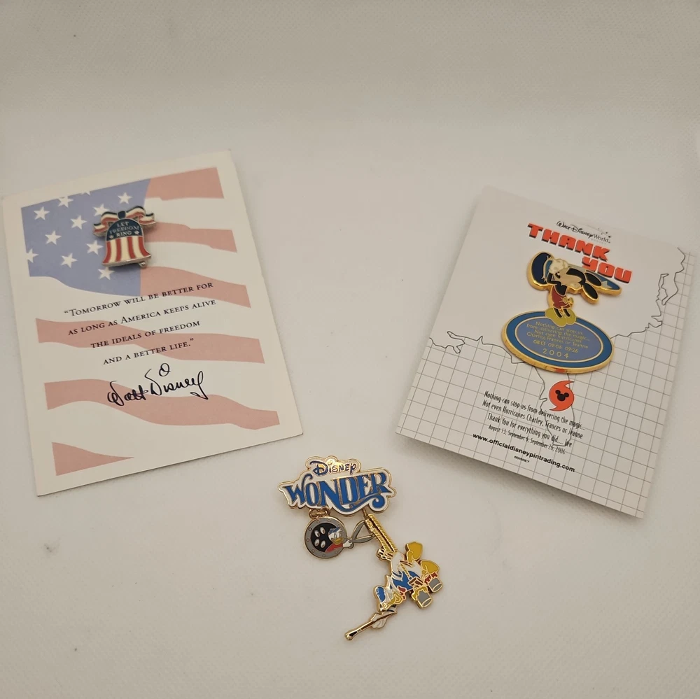 Huge lot of 24 Disney memorabilia items from the 1940s to 2000s including a variety of collectibles such as WDW 30th Anniversary trading cards, Cast Member Only Hurricane and 9-11 pins, Disney Wonder Donald Duck pin, 2 Disney Sea Tokyo coins, Disneyland Resort Grand Opening 2001 coin and card, 11 Disney buttons, and a RARE never used Adventures in Disneyland Fantasyland 8mm film. Each piece showcases different characters, stories, and themes from the Disney franchise, making it a diverse and unique collection for any Disney fan or collector. From vintage pins to contemporary coins, this assortment offers a glimpse into the history and evolution of Disney merchandise over the decades.