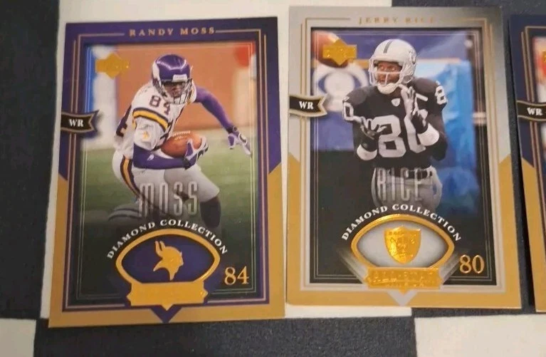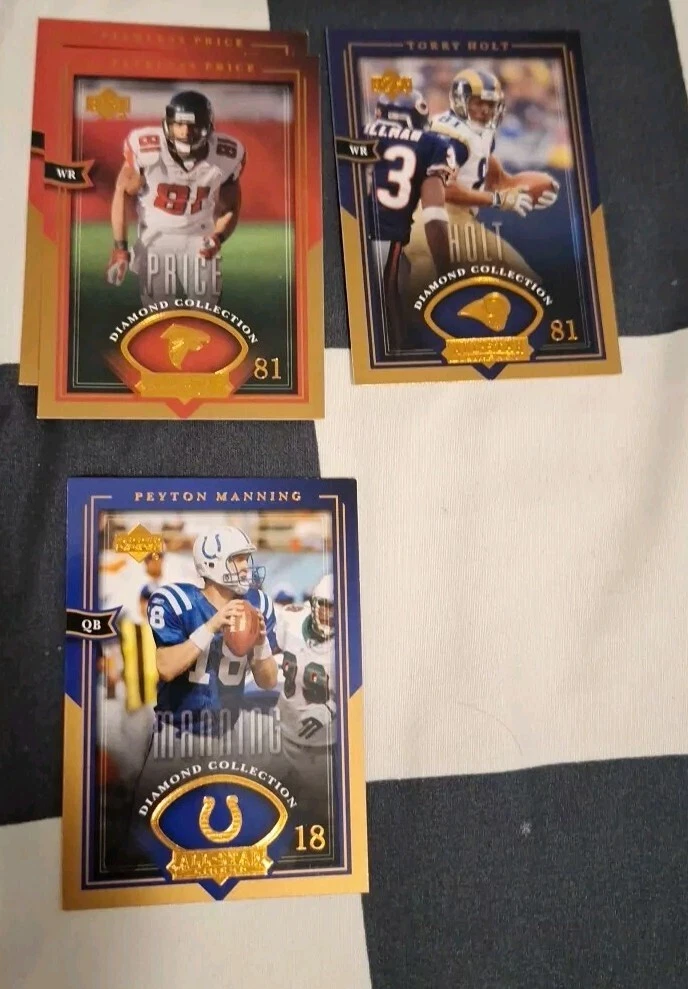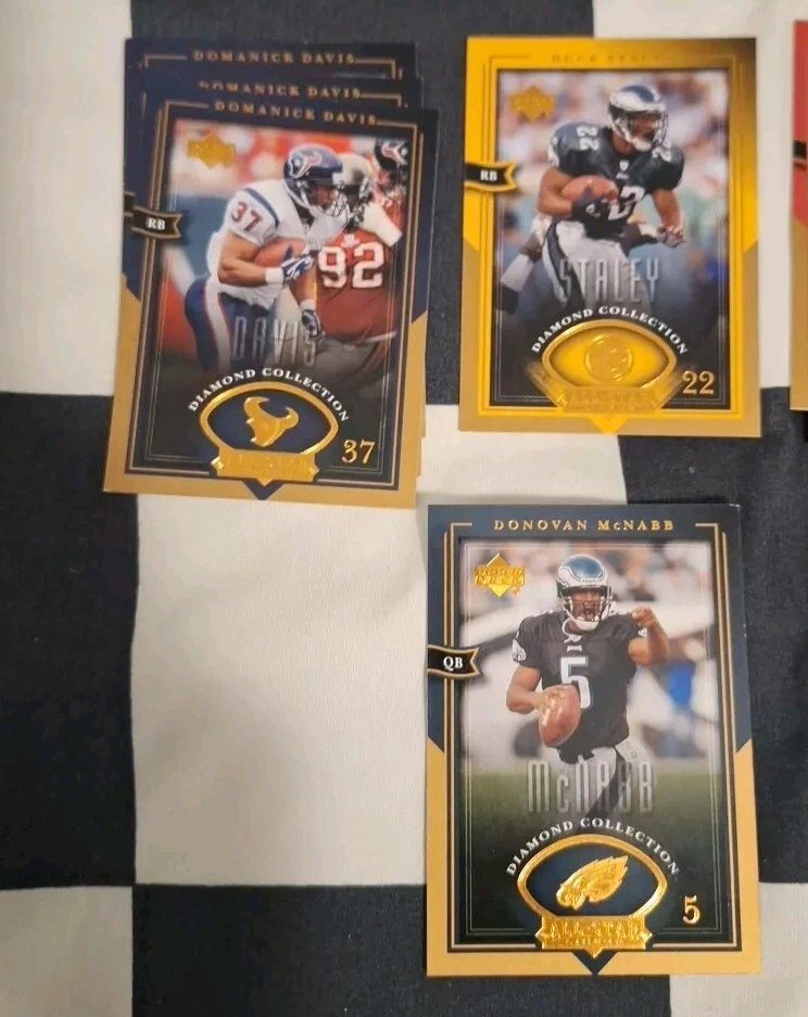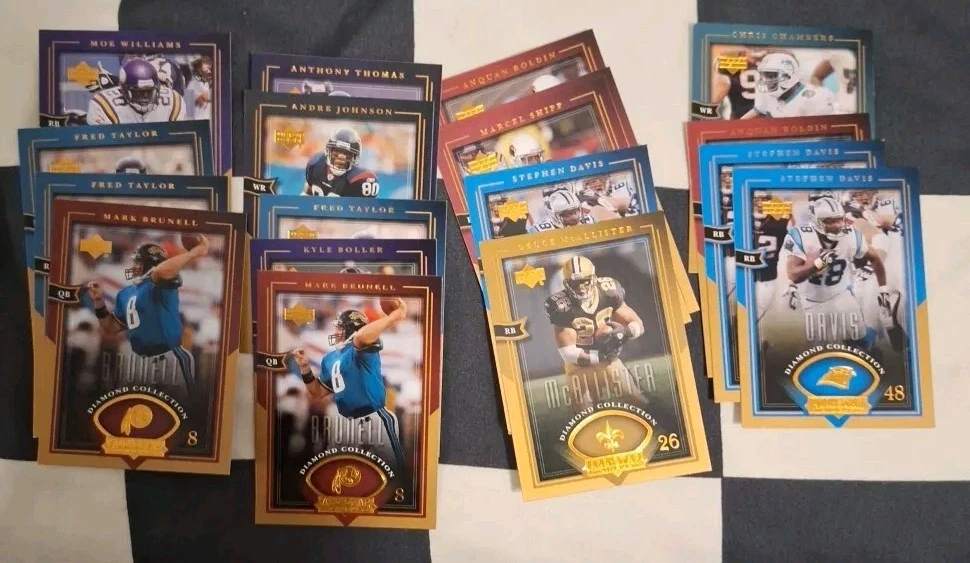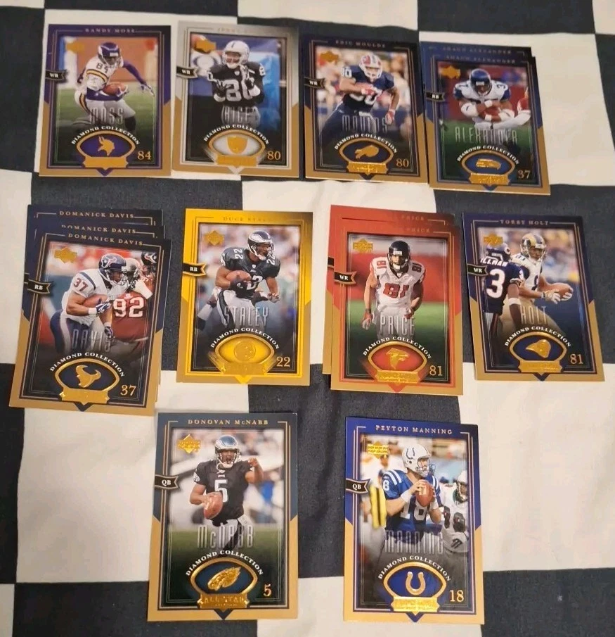 This lot of 10 sports trading cards is a great addition to any collector's collection. The cards are from the 2004 Upper Deck Diamond Collection and feature NFL players and teams. With some doubles in the lot, you'll be able to add a few extra cards to your collection. The cards are in great shape and ready for display or storage. Don't miss out on this opportunity to expand your sports trading card collection!