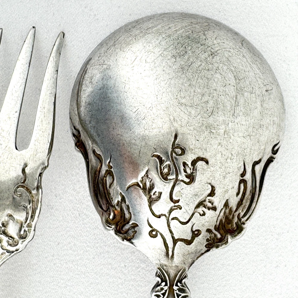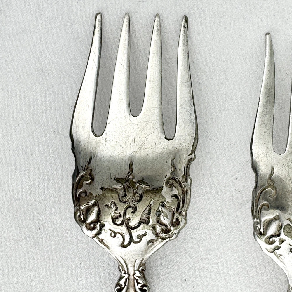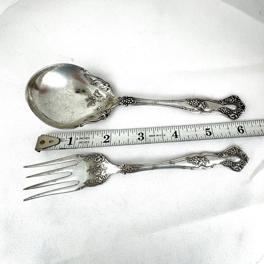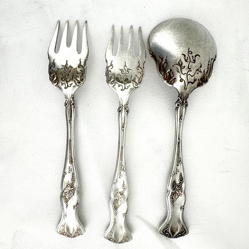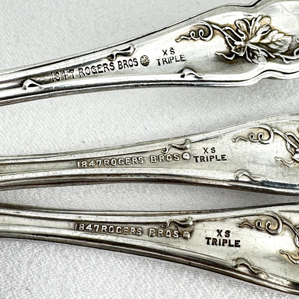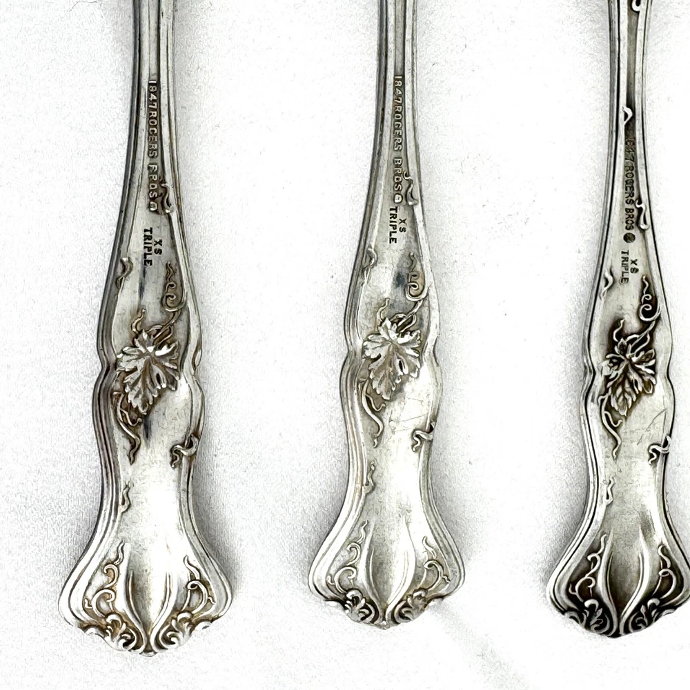 Offering a lot of 3 Vintage by 1847 Rogers Bros. impressed backstamp Triple XS. One sugar spoon 5 7/8” and two salad forks 5 7/8” silver plated in their Grapes design. Good condition, no bends, dents, or disposal damage. One fork has one tine that is shorter than the rest. There are scratches consistent with normal wear. Please view the photos for details and condition. Measurements and photo colors are approximate. For extra protection they will be packed in plastic sleeves and shipped in a box. Shipping is your choice of USPS Ground Advantage or USPS Priority at the rate determined by eBay. Terms of Sale: Photos are of the actual item you will receive and sold "as is". Placing an order is your agreement that you know what you are buying, have viewed the photos and find the condition acceptable. If you have any questions or concerns about your order, contact me through eBay Messages. Please inspect your item upon arrival and contact me if there are any problems so we may work out a solution, before you leave feedback or request a refund. No returns please.