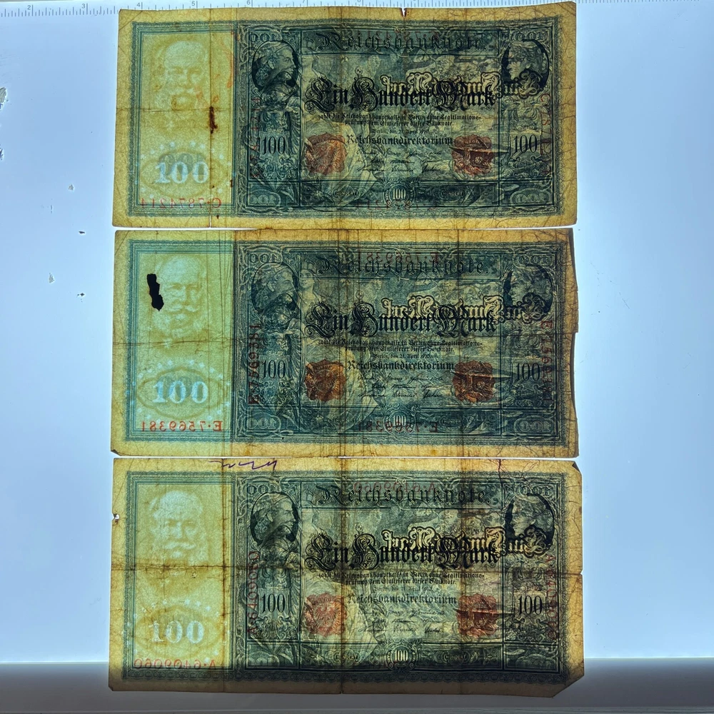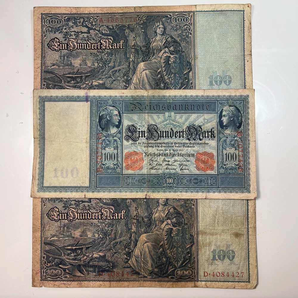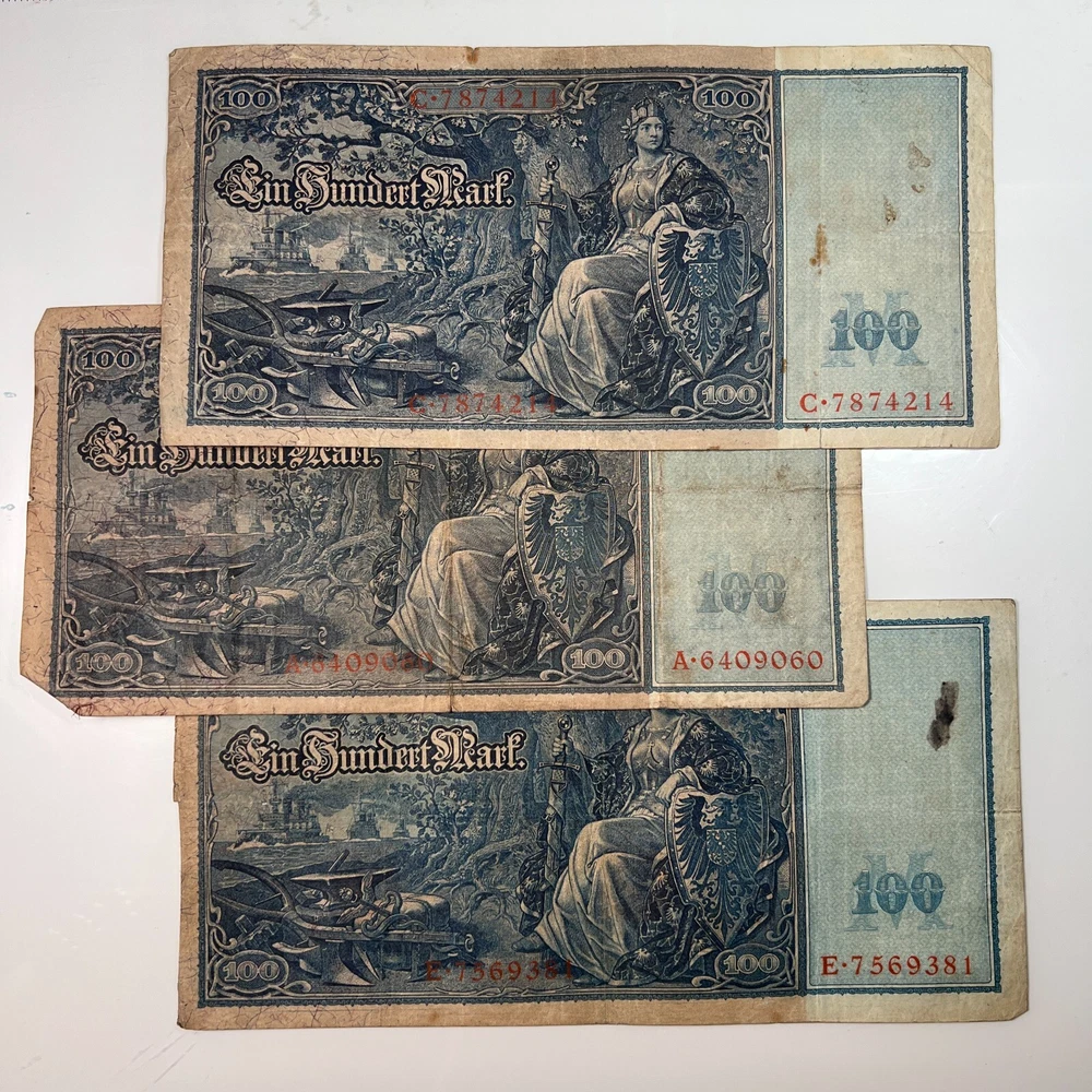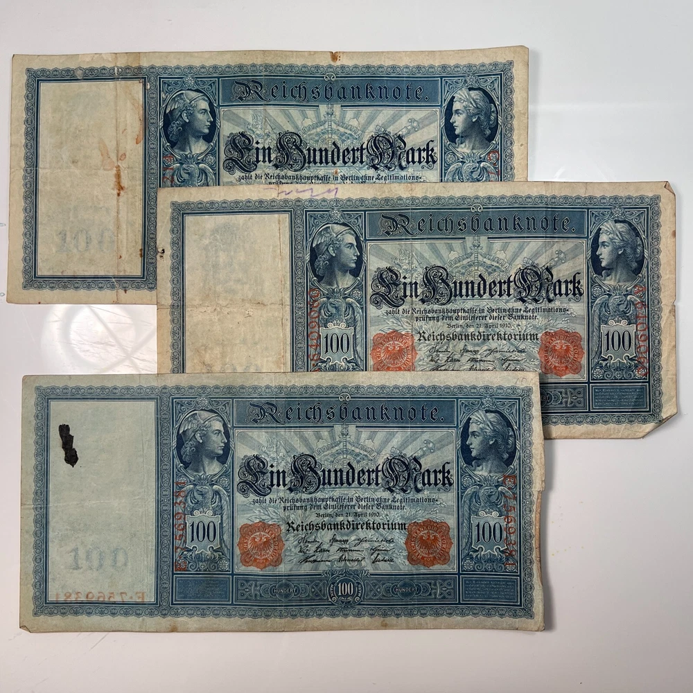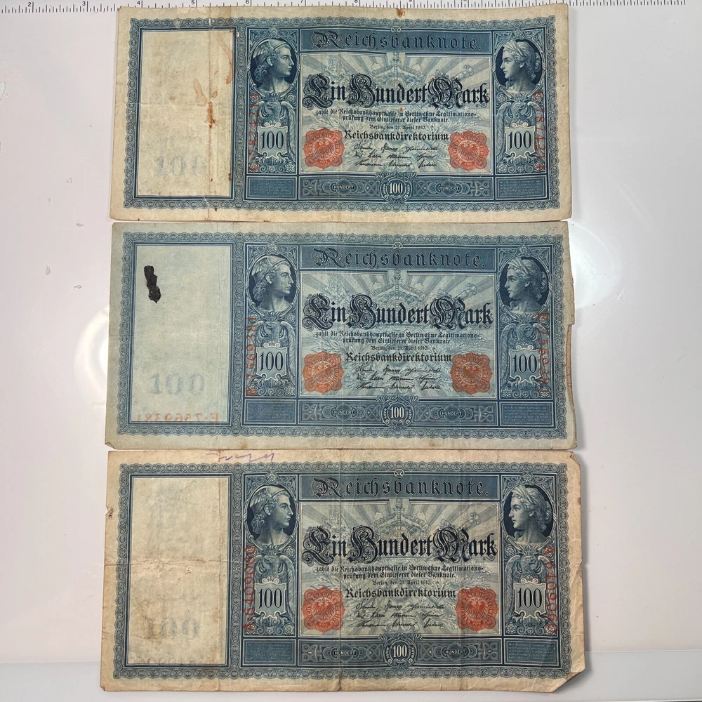 You will not receive the banknotes from the photographs. You will receive a lot of three (3) authentic 100 Mark German banknotes from 1910 in "About Good" condition similar or higher quality than the photographs as described below. These are authentic 1910, 100 Mark banknotes from Germany that date back to 1910. Your German banknotes will arrive at your doorstep in the same condition you see in the pictures. Don't wait to get your hands on these collectable, antique banknotes. These German 100 Marks showcases the design and craftsmanship of the Germans before WWI. Their detail, watermarks, and intricate designs were incredible for their time. Please zoom in on the photograph to view the intricate prints and security features. These collectable banknotes are a great addition to your collection. "About Good" - Little to no snap in paper. Strong horizontal and vertical folds impeding on font visibility along folds. Larger folds and crumples throughout. Larger stains that make distractions to the eye. Some small writing. Missing or hard folded corners and softer, sometimes torn edges. Tears and pinholes. No major missing portions but may have small missing corners. These German banknotes have been well preserved over the last century. They are perfect for collectors and history enthusiasts looking for a genuine piece of German currency. Don't miss the opportunity to own these remarkable, collectable German banknotes. Free of charge, your banknotes will come lightly vacuum sealed to prevent any water or weather damage during shipping. Your banknote will ship tracked and insured via eBay Standard Envelope via USPS one business day after payment. Sleep easy with BennyWB! If you are at all unsatisfied with your purchase, we accept returns for 30 days, and we'll pay for the shipping. All we ask is the banknotes are returned in the same condition you received them in. #1126