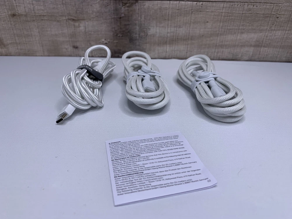This lot includes three Anker braided charging cables, each with a length of 6ft and a Lightning connector. These cables are MFi-certified and compatible with iPhones, iPads, and other devices. The cables are white in color and feature a braided design for durability and flexibility. The charging and data sync cables are perfect for those who need to charge their devices quickly and efficiently. They are made by the trusted brand Anker and come with a charging cable each. Whether you need to charge your iPhone, iPad, or other device, these cables are a great choice.