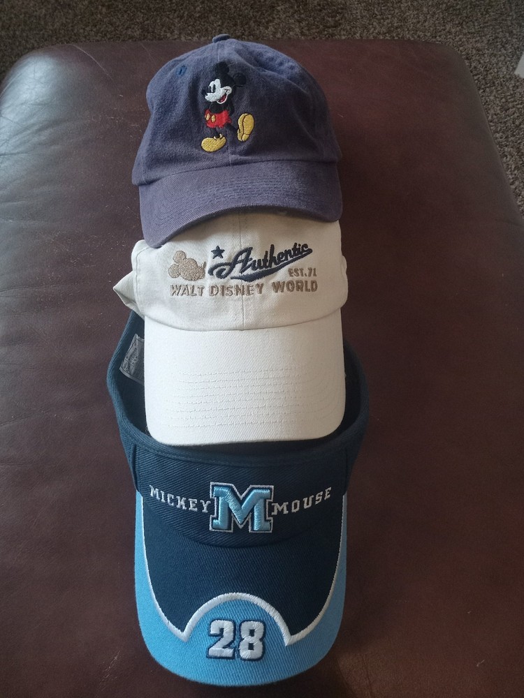 Lot of 3 Authentic Mickey Mouse Walt Disney World Hats & Visor Number 28. All three hats are adjustable. The blue visor is in excellent condition. The white hat is in great shape but has a small marking under the brim not visible from the worn side (see photo labeled "small marking". The navy blue / violet hat with Mickey on the front is worn and faded but still in nice condition. All 3 hats ready to wear for your next family trip to Disney World or for all you Disney hat collectors. I am sure if you bought these hats individually at Disney, they would be quite expensive. Calculated shipping will be between $5.65 and $7.36 depending on how far you live from NC. I will ship via USPS ground advantage shipping with tracking. Thanks for looking and check out my other listings.