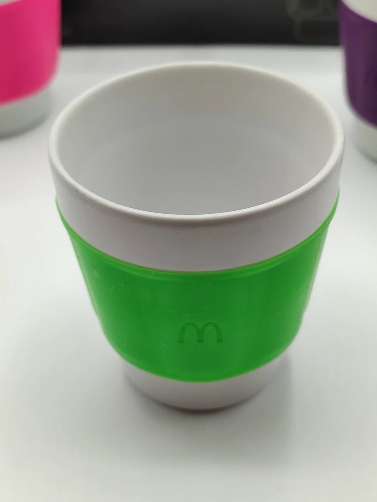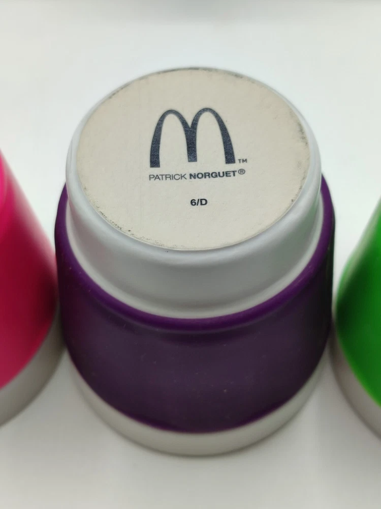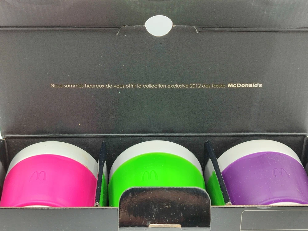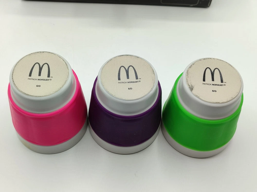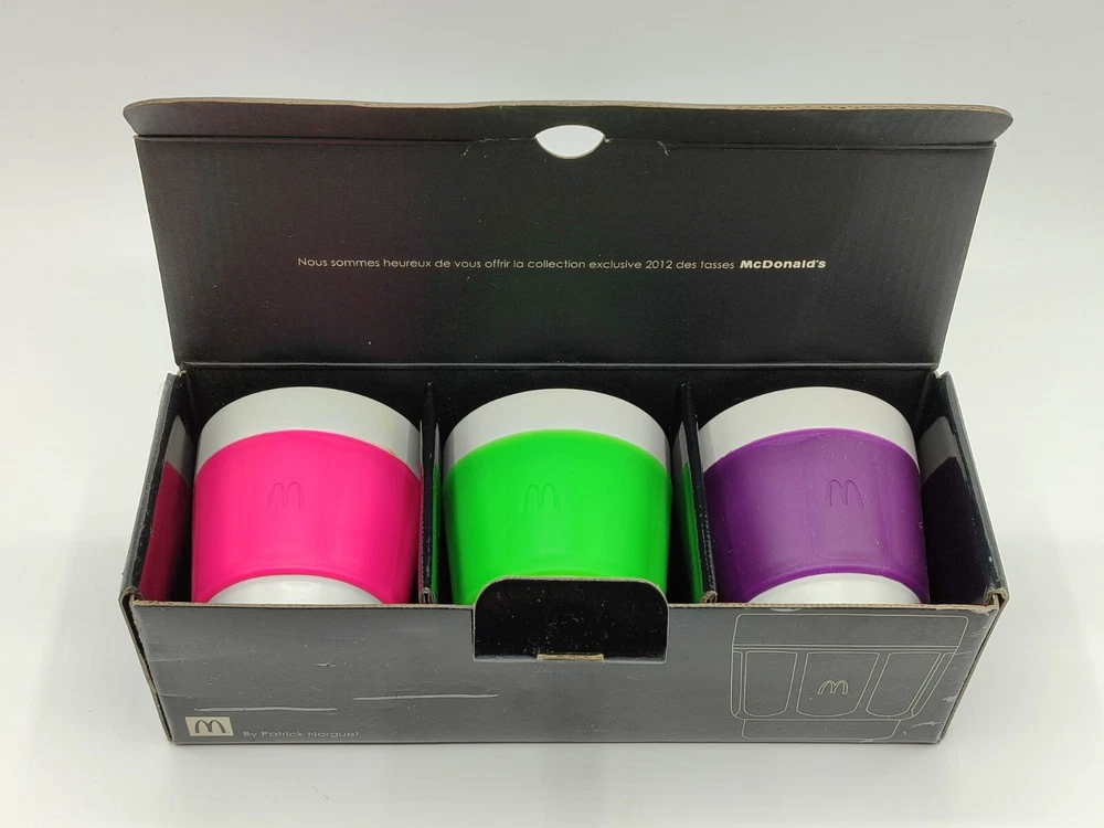 Lot 3 Tasses, gobelet à Café - Patrick Norguet X McDonald's - Coffret collector Dimensions : Hauteur : 8 cm Largeur : 7 cm Très beau coffret de 3 tasses Patrick Norguet X Mcdonald's. Couleurs : Vert flash, rose fuchsia et violet. Coffret en carton , peut présenter des marque du au stockage. Parfait état, pas de défaut visible sur les tasses.