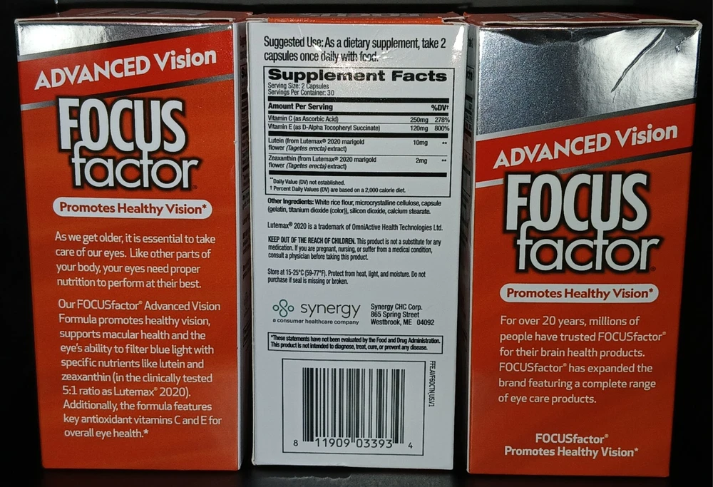 Product Description :- Supports Eye Health : Contains a blend of vitamins, minerals, and antioxidants to promote clear vision and protect against age-related eye issues. Key Ingredients : Includes lutein, zeaxanthin, and vitamin A, known for their ability to support retinal health and overall vision function. Daily Vision Support : Designed for daily use to maintain eye health and protect from environmental stressors. 60 Capsules per Bottle : Provides a one-month supply for consistent support. Easy-to-Take : Convenient capsules that fit seamlessly into your daily wellness routine. Formulated for Vision Wellness : Focus Factor Advanced Vision helps support vibrant, healthy eyes at any age. Lot of 3 EXP: 08/25