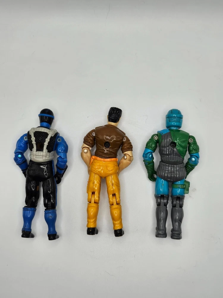 Lot of 3 Vintage G.I. Joe Figures – 1991 Snake Eyes, 1991 Grunt, 1992 Flak-Viper with Backpack This listing features three vintage G.I. Joe action figures from 1991-1992, each in good condition with some original accessories. Included in this Lot: 1991 Snake Eyes (v4) https://www.yojoe.com/action/91/snakeeyes4.shtml Condition: Good overall condition with some worn paint. Included: Figure only, no accessories. 1991 Grunt (v3) https://www.yojoe.com/action/91/grunt3.shtml Condition: Good overall condition with some worn paint. Included: Figure only, no accessories. 1992 Flak-Viper (v1) https://www.yojoe.com/action/92/flakviper.shtml Condition: Good overall condition with some worn paint. Included: Backpack missile launcher (no missiles). Lot Summary: These three G.I. Joe figures are great for collectors or fans of the classic series. The Flak-Viper includes a backpack missile launcher, though the missiles are missing. Perfect for display or as part of a restoration project.