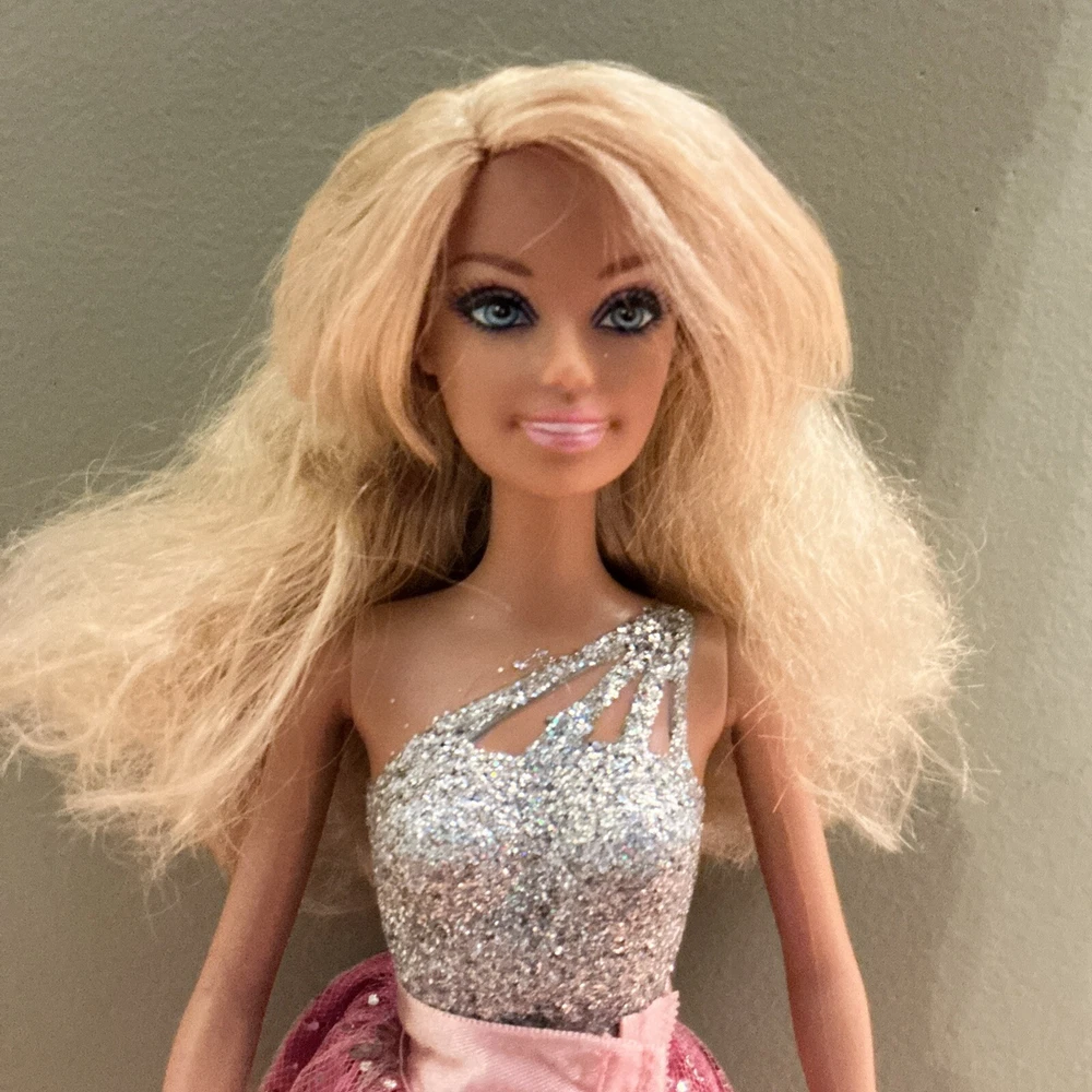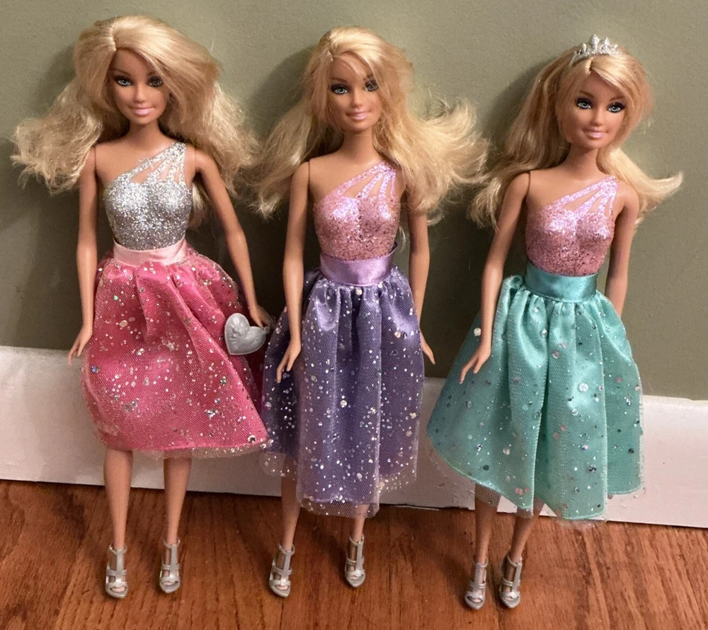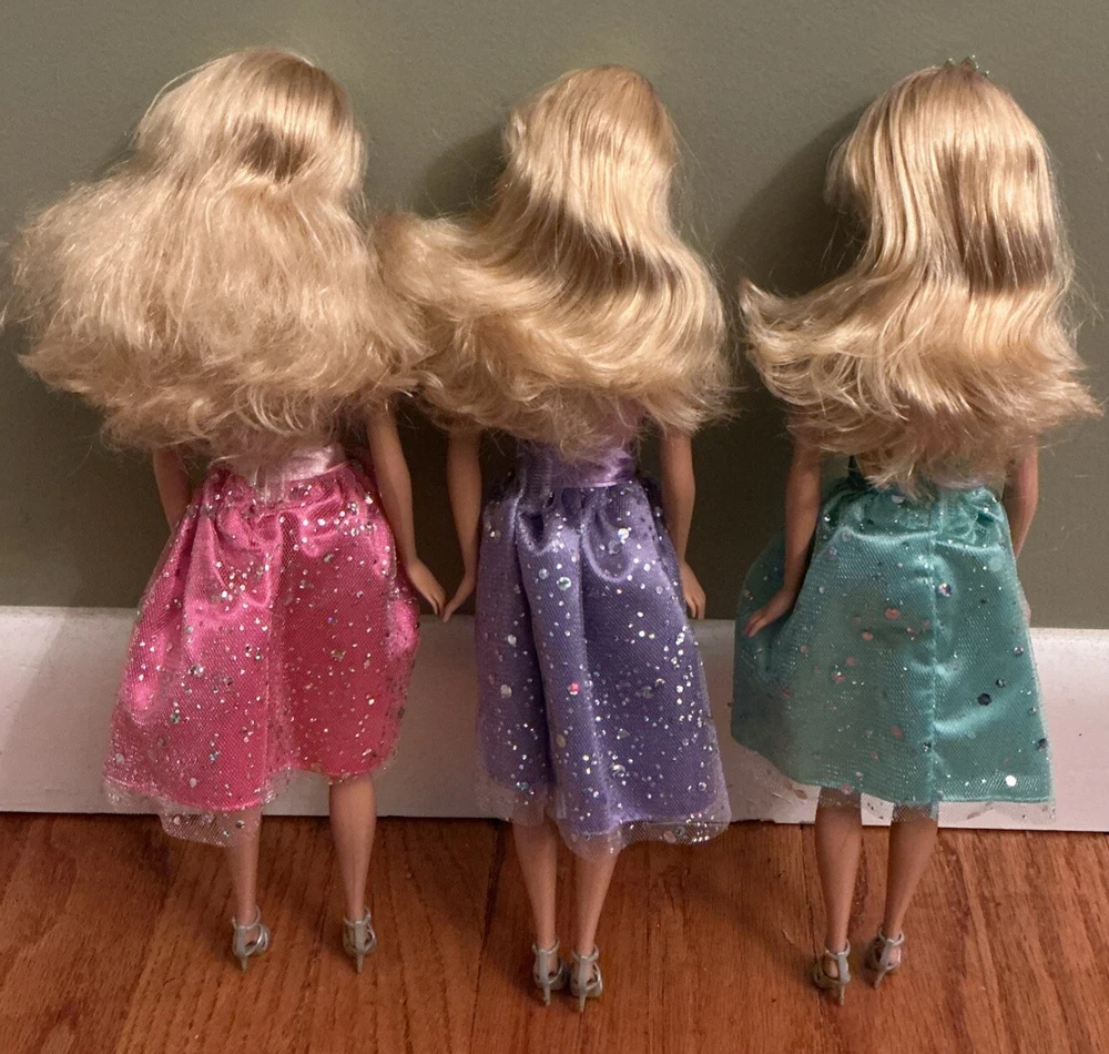 princess magic blingdom barbie Silver Painted Top Very good condition First Doll comes with skirt, shoes and purse no crown Second doll comes with skirt, shoes, purse and crown Third doll comes with skirt, shoes, purse and crown All 3 heads are stamped 1998 All 3 body’s are stamped 2009 Comes from a smoke free home