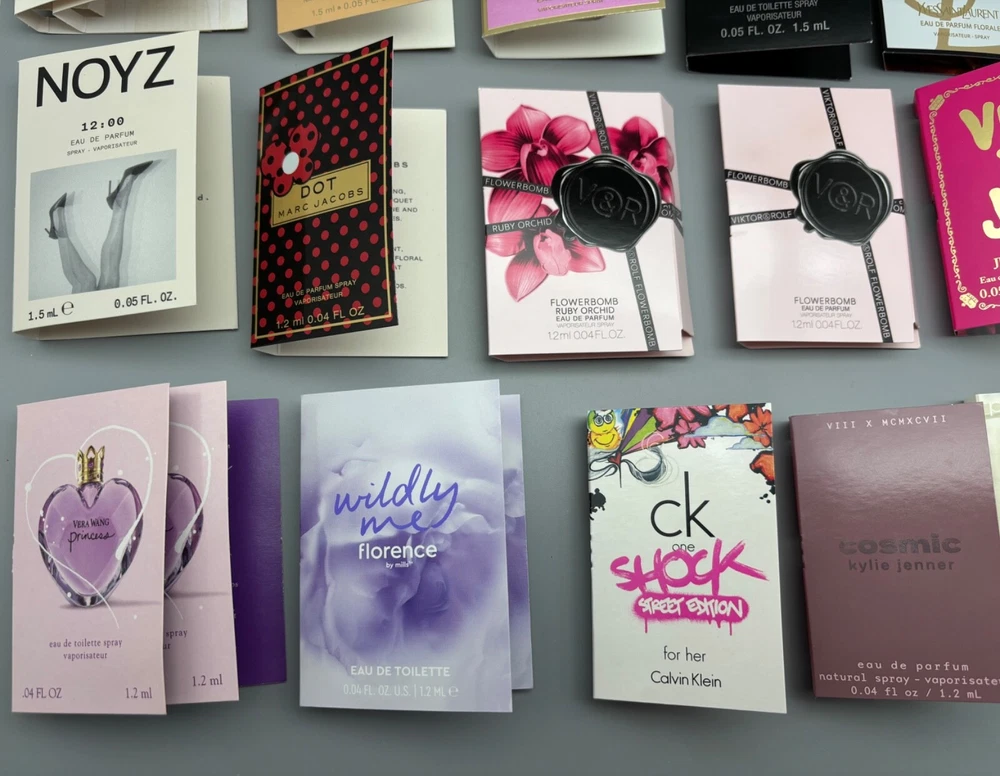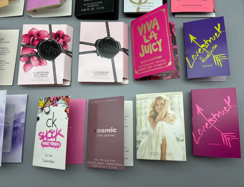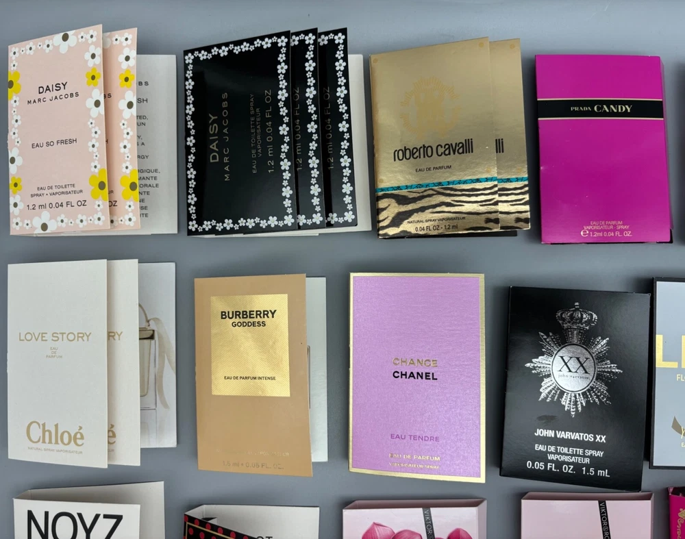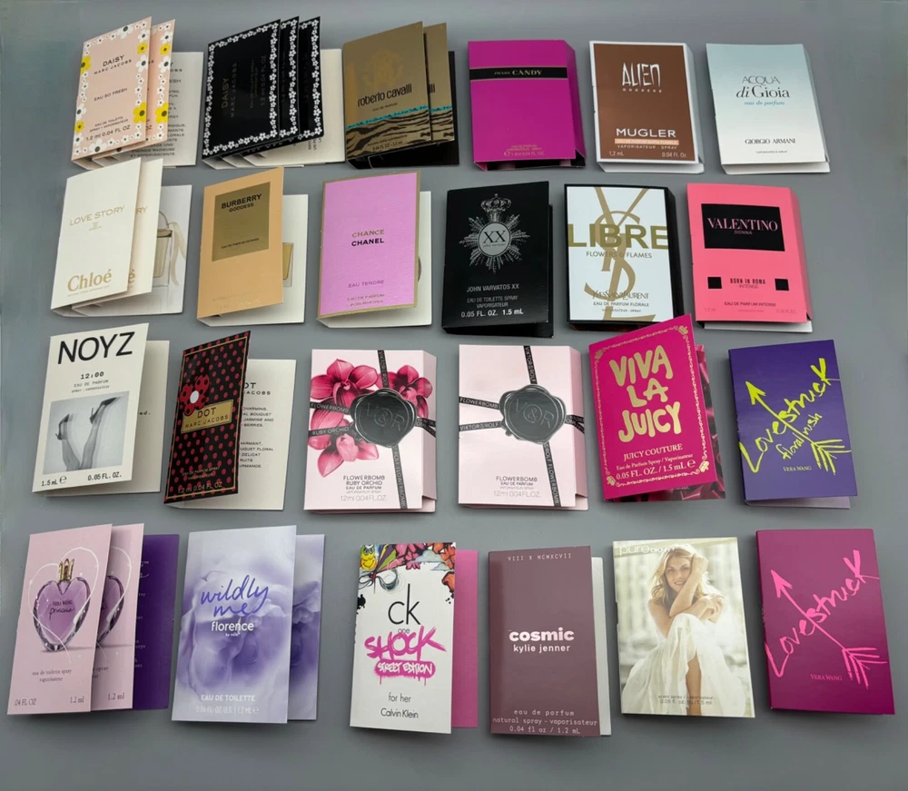 An incredible lot of 30 luxury high-end designer women's eau de parfum and eau de toilette samples in 0.04 fl oz and 0.05 fl oz sizes. Brand new with cards! Lot includes: Burberry Goddess Eau de Parfum Intense Mugler Alien Goddess Eau de Parfum Supra Florale John Varvatos XX Eau de Toilette YSL Libre Flowers & Flames Eau de Parfum Florale Chanel Chance Eau Tendre Eau de Parfum Chloé Love Story Eau de Parfum (x2) Prada Candy Eau de Parfum Valentino Donna Born In Roma Eau de Parfum Intense Giorgio Armani Acqua di Gioia Eau de Parfum Noyz 12:00 Eau de Parfum Viktor & Rolf Flowerbomb Eau de Parfum Viktor & Rolf Flowerbomb Ruby Orchid Eau de Parfum Roberto Cavalli Eau de Parfum (x2) Marc Jacobs Dot Eau de Parfum Marc Jacobs Daisy Eau de Toilette (x3) Marc Jacobs Daisy Eau So Fresh Eau de Toilette (x2) Juicy Couture Viva La Juicy Eau de Parfum Florence by Mills Wildly Me Eau de Toilette Kylie Jenner Cosmic Eau de Parfum Vera Wang Princess Eau de Toilette (x2) Vera Wang Lovestruck Eau de Parfum Vera Wang Lovestruck Floral Rush Eau de Parfum Calvin Klein One Shock Street Edition Eau de Toilette DKNY Pure Eau de Parfum
