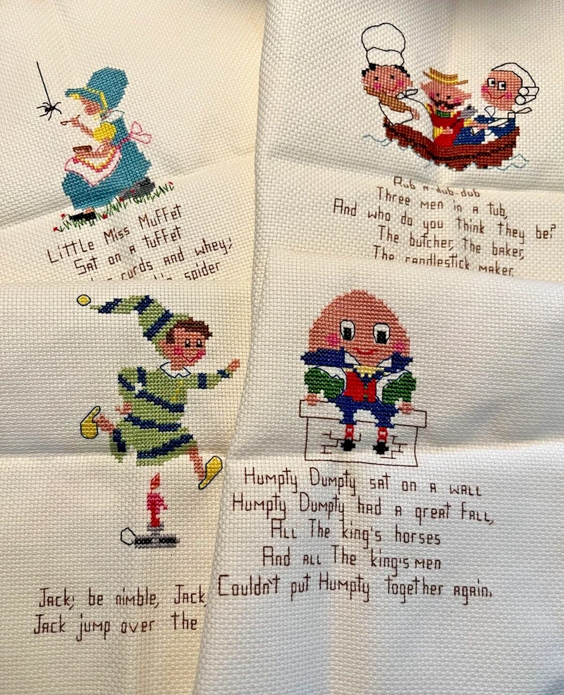 4 Completed Cross Stitch Nursery Rhymes Little Miss Muffin Humpty Dumpty Jack B. Nimble 3 Men in a Tub Cream color Aida cloth Appears to be 11 ct. Well executed Faint line drawn on each cloth for an 8 X 10" opening Small marks outside of 8 x 10" guide lines Very good condition - ready to mount and frame No returns, thanks From a smoke free, pet friendly environment Over 1900 positive eBay feed backs