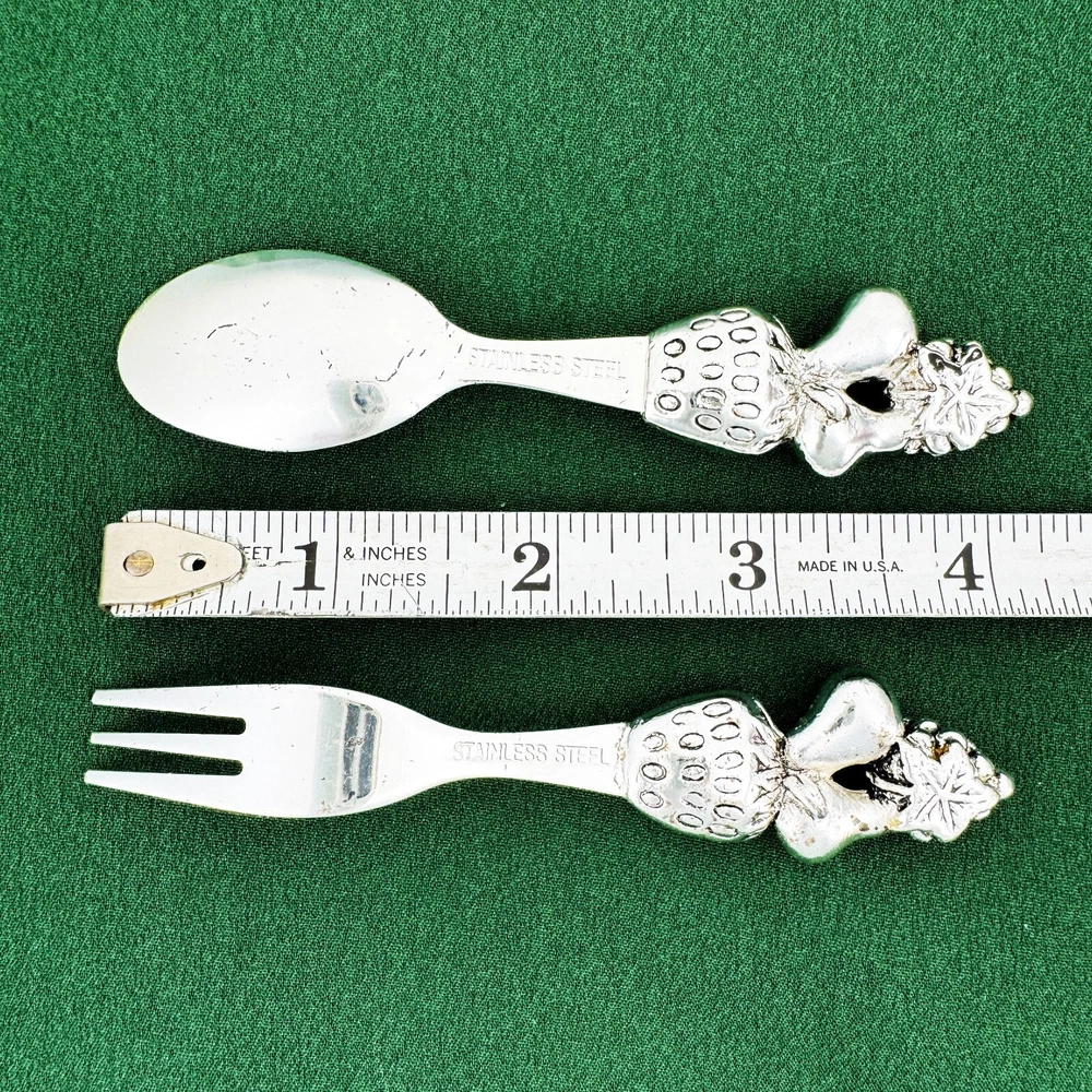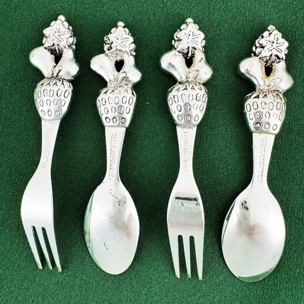 Offering a lot of 4 bright silver color stainless steel 4.25” utensils, 2 forks and 2 spoons, unbranded and made in China. Featuring pierced metal handles with silvery fruit: strawberry, pears grapes and a leaf. These might be holiday serving pieces or children’s utensils. They have a few serious scratches as shown in the photos. Please view the photos for details and condition. Measurements and photo colors are approximate. Shipping is your choice of USPS Ground Advantage or USPS Flat Rate Priority at the rate determined by eBay. Follow your item's delivery progress with the USPS website Tracking Tool. Terms of Sale: Photos are of the actual item you will receive and sold "as is". Placing an order is your agreement that you know what you are buying, have viewed the photos and find the condition acceptable. Use eBay Messages to contact me for questions or concerns about your order. Please inspect your items upon arrival and contact me if there are any problems. Free returns within 30 days after delivery.