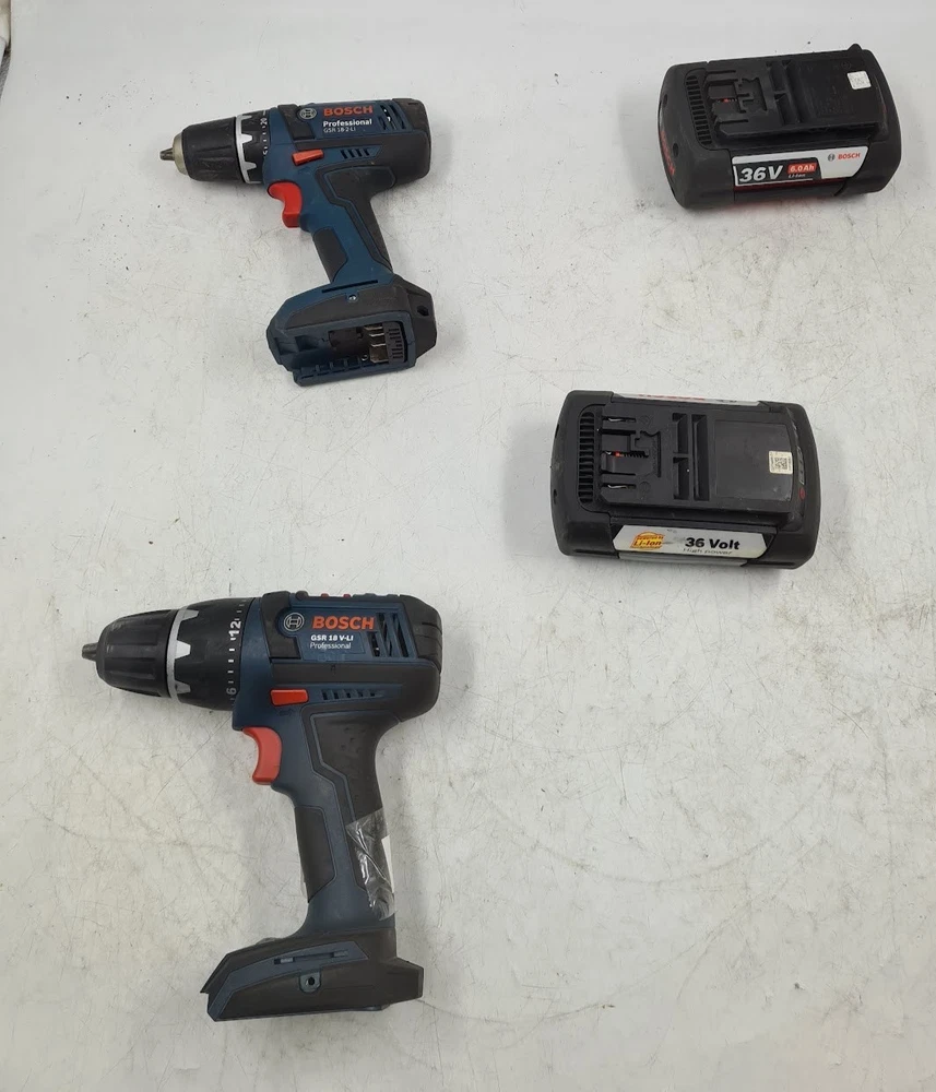 Colour: Blue Cable Length: n/a Chuck Size: n/a Country of Origin: Lithuania Power Source: Battery Features: n/a Speed: n/a Battery Included: Yes Maximum Torque: n/a Voltage: Various Power: n/a MPN: Lot of 4 Various Bosch Power Tools, GSR 18 V-LI, GSR 18-2-LI Set Includes: Battery Battery Technology: Lithium-Ion (Li-Ion) Type: Power Tools Battery Capacity: n/a Number of Batteries: 2 Manufacturer Warranty: none Model: Two drill/driver GSR 18 V-LI, GSR 18-2-LI, two batteries Brand: Bosch Auxiliary Handle: No Motor Type: n/a Number of Items in Set: 4 Charging Time: n/a Chuck Type: Keyless