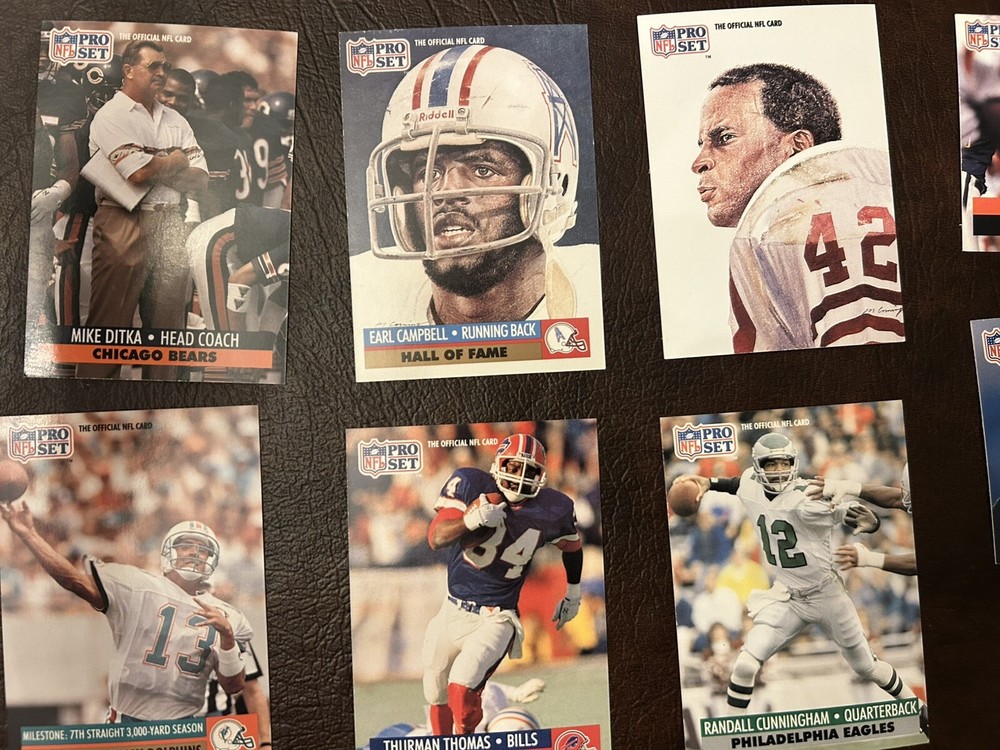 This lot of sports trading cards features 45 original cards from the NFL Pro Set, as well as NBA and MLB cards. The cards are made of card stock material and come with a signed David Nelson card. The set includes cards of famous players such as Ozzie Smith, Randall Cunningham, and Reggie White, as well as coaches like Bill Belichick and Mike Ditka. The cards are in standard size and are perfect for collectors of vintage football memorabilia. The set is a great addition to any sports trading card collection and is a must-have for fans of the Cincinnati Bengals, Houston Oilers, and San Francisco 49ers.