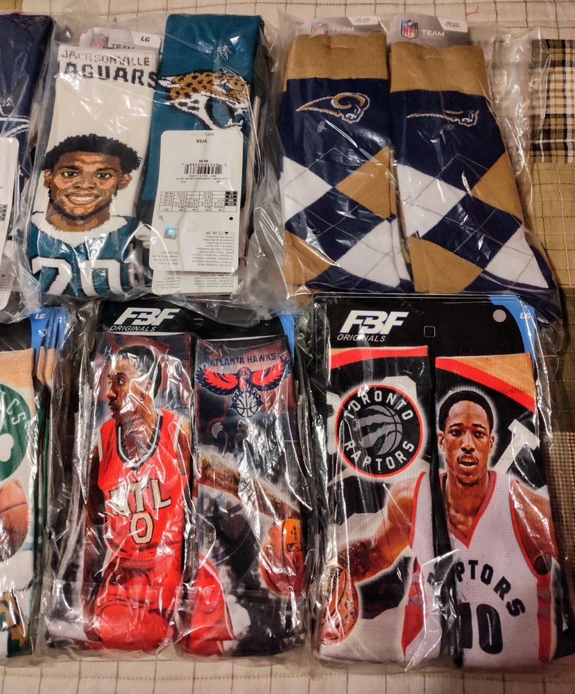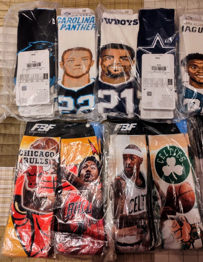 This lot consists of 48 pairs of adult socks in a mix of colors with a sports theme, featuring NFL and NBA logos. The socks are all size large except the Rams are one size fits most, suitable for large feet, making them ideal for everyday wear in summer, spring, fall, or any season. Perfect for wholesale, resale, or consignment purposes. Each pack contains 6 pairs of socks each of that particular team or individual athlete. Please feel free to ask any questions before purchasing and thanks for looking S3