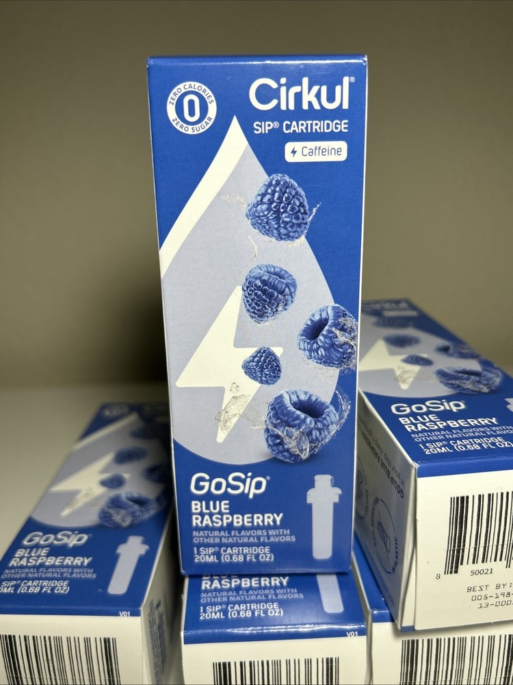 Lot of 5 Cirkul GoSip Blue Raspberry Cartridges 20 ml/0.68 fl oz No Sugar No Artificial Flavors No artificial colors Zero calories 84% reduction in plastic Expiration Date: 04/2027 New sealed Sold as pictured