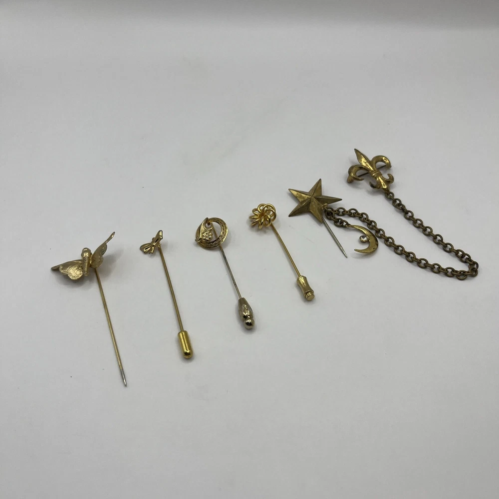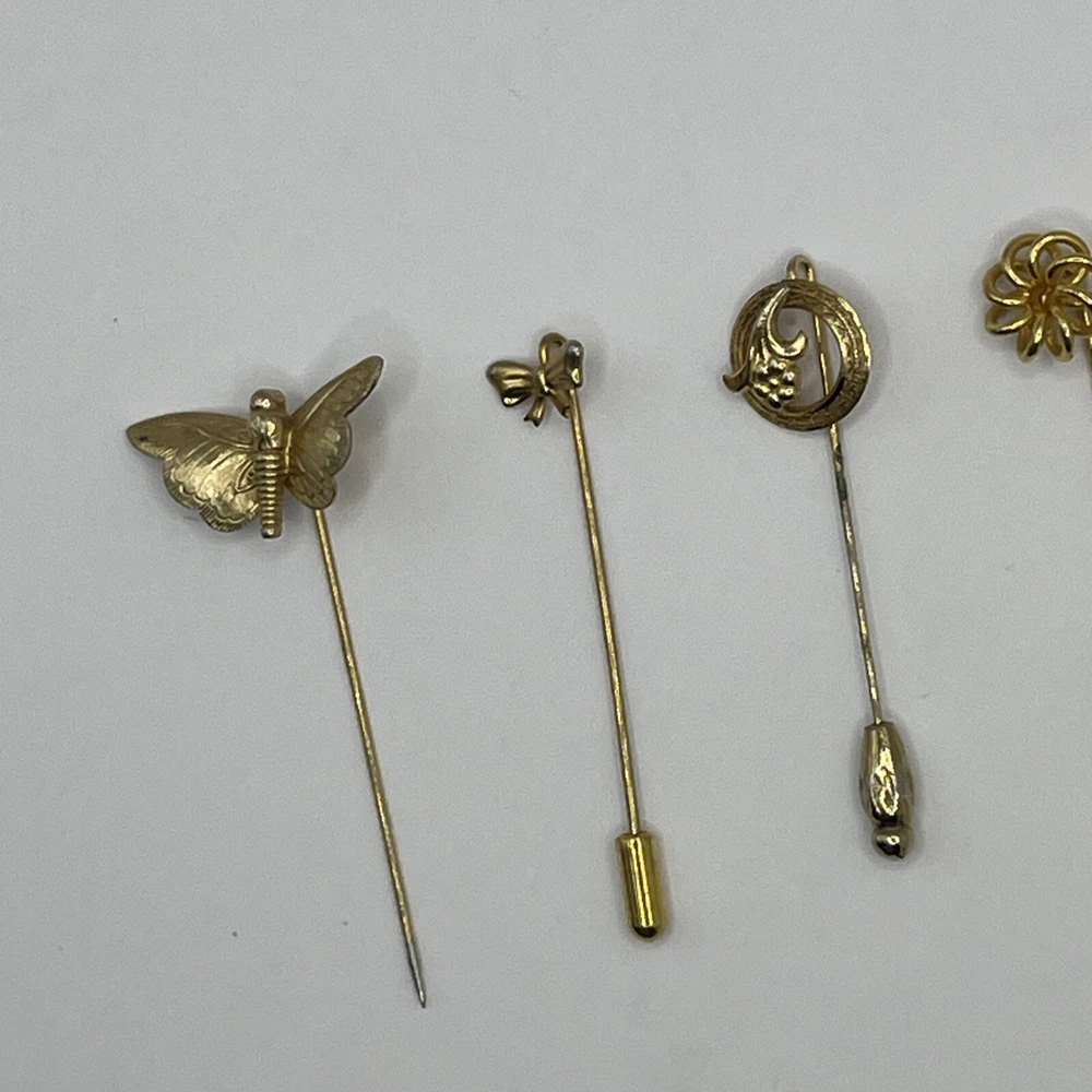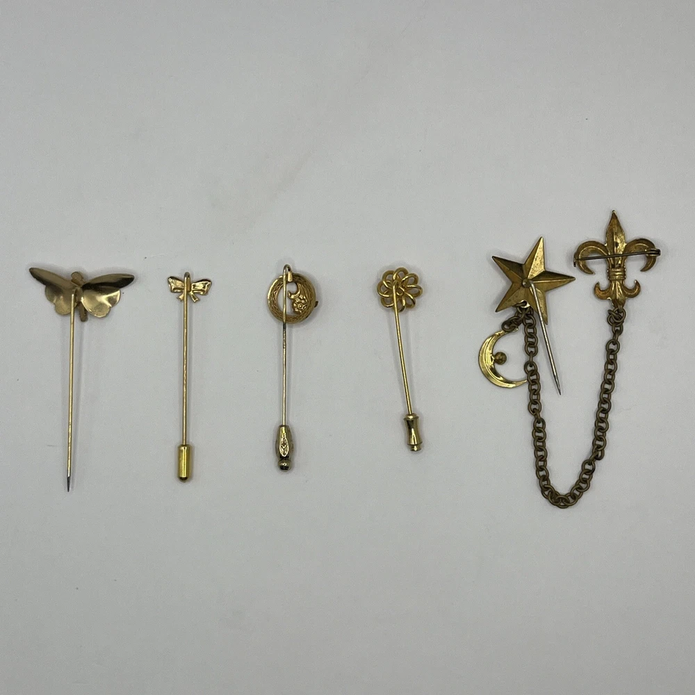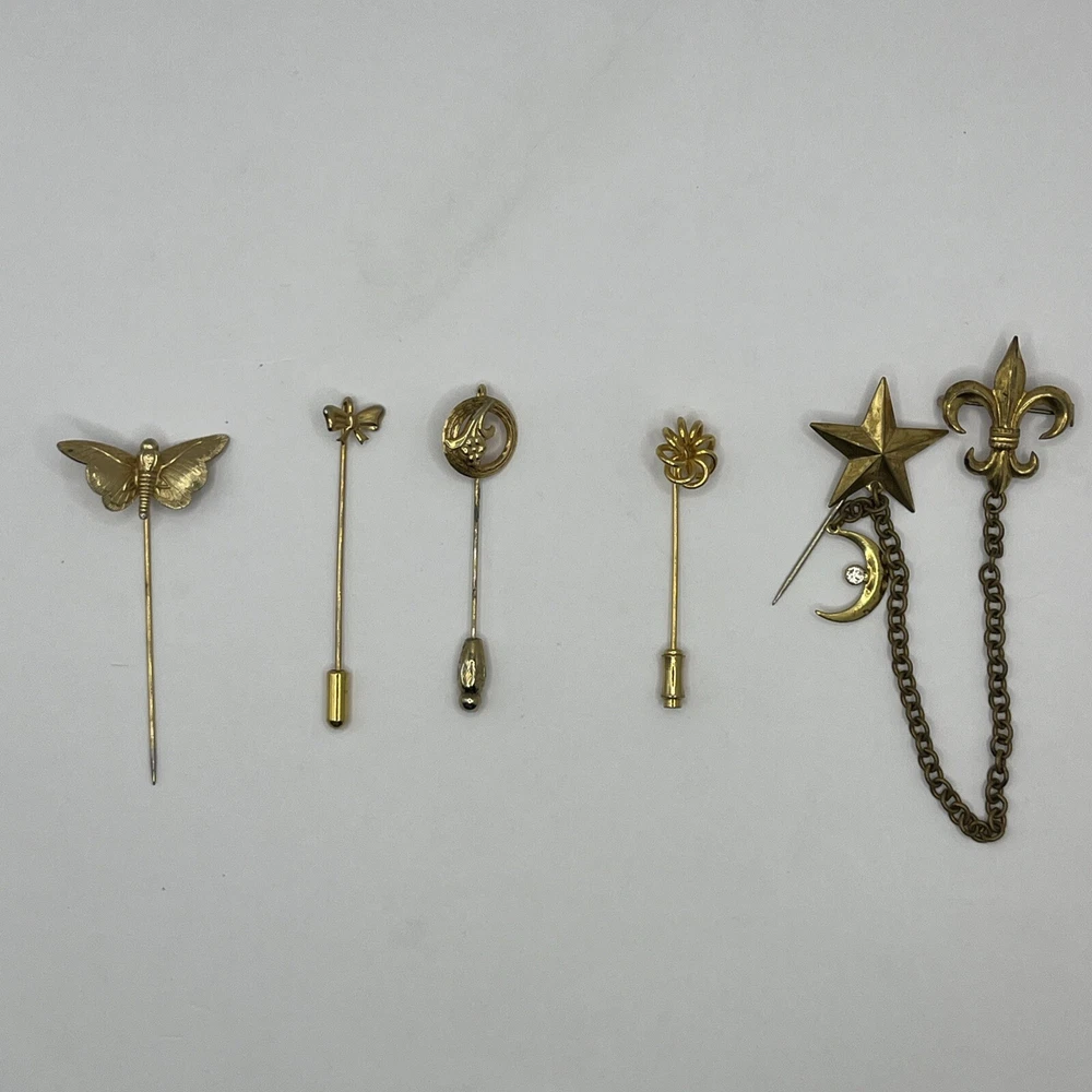 Lot of 4 vintage gold tone hat pins and 1 vintage gold tone fleur-de-lis star brooch/lapel pin. Hat pin designs include spiral, bow, ornate flower, and butterfly. 1 hat pin and the brooch pin are missing their caps, but the other caps provided fit these pins.
