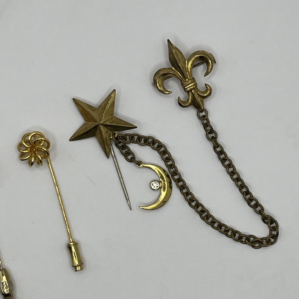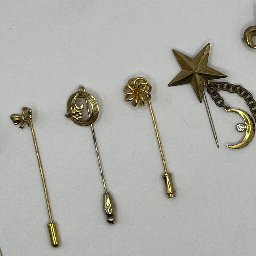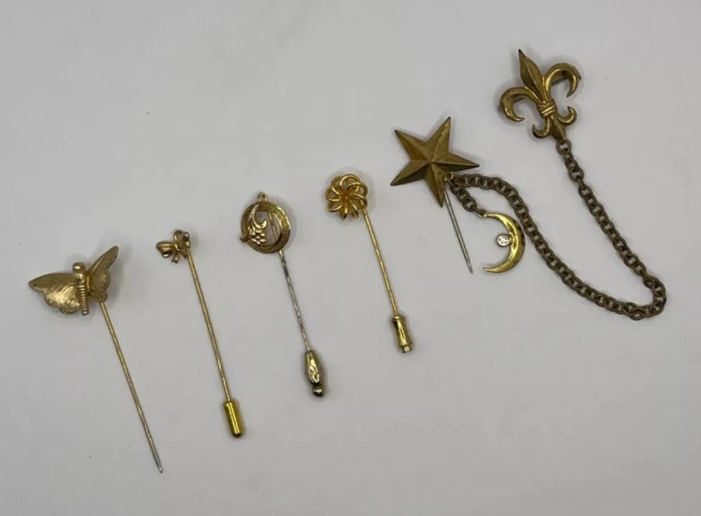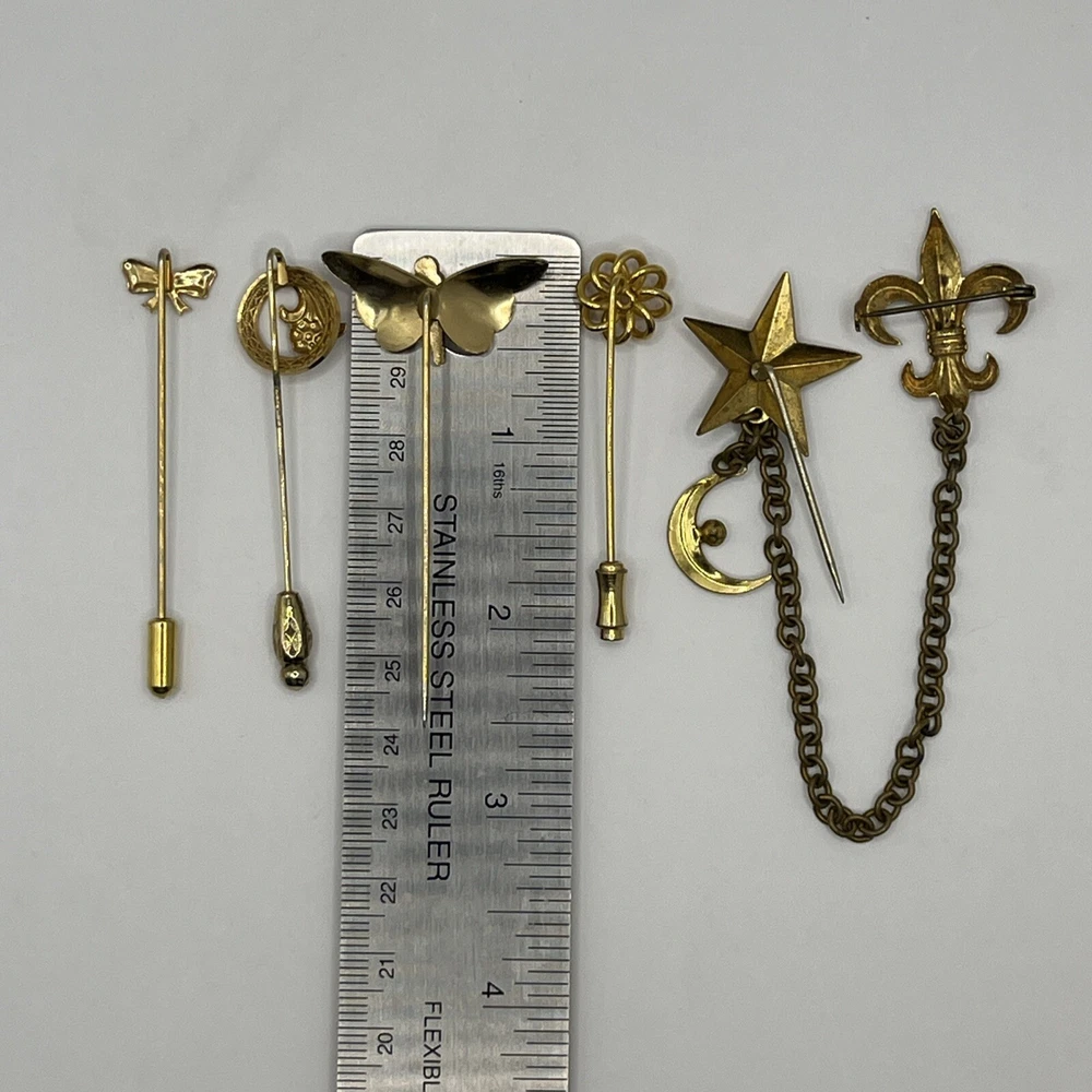 Lot of 4 vintage gold tone hat pins and 1 vintage gold tone fleur-de-lis star brooch/lapel pin. Hat pin designs include spiral, bow, ornate flower, and butterfly. 1 hat pin and the brooch pin are missing their caps, but the other caps provided fit these pins.
